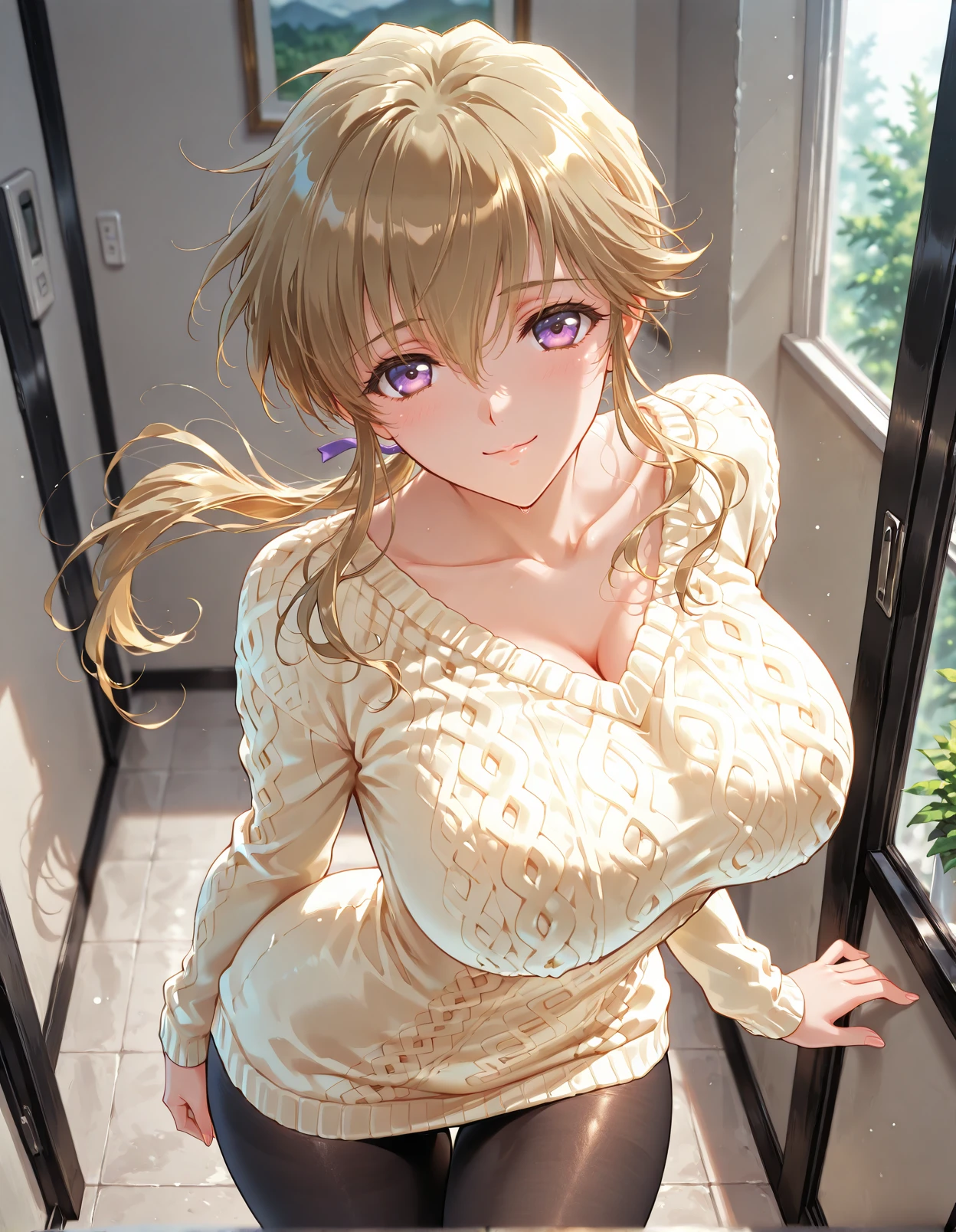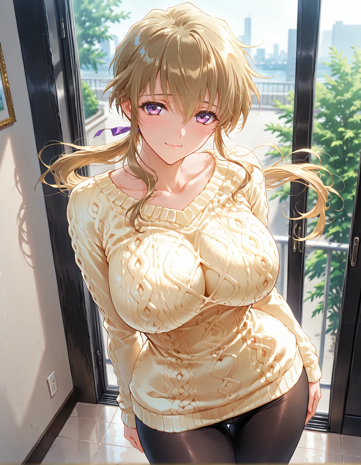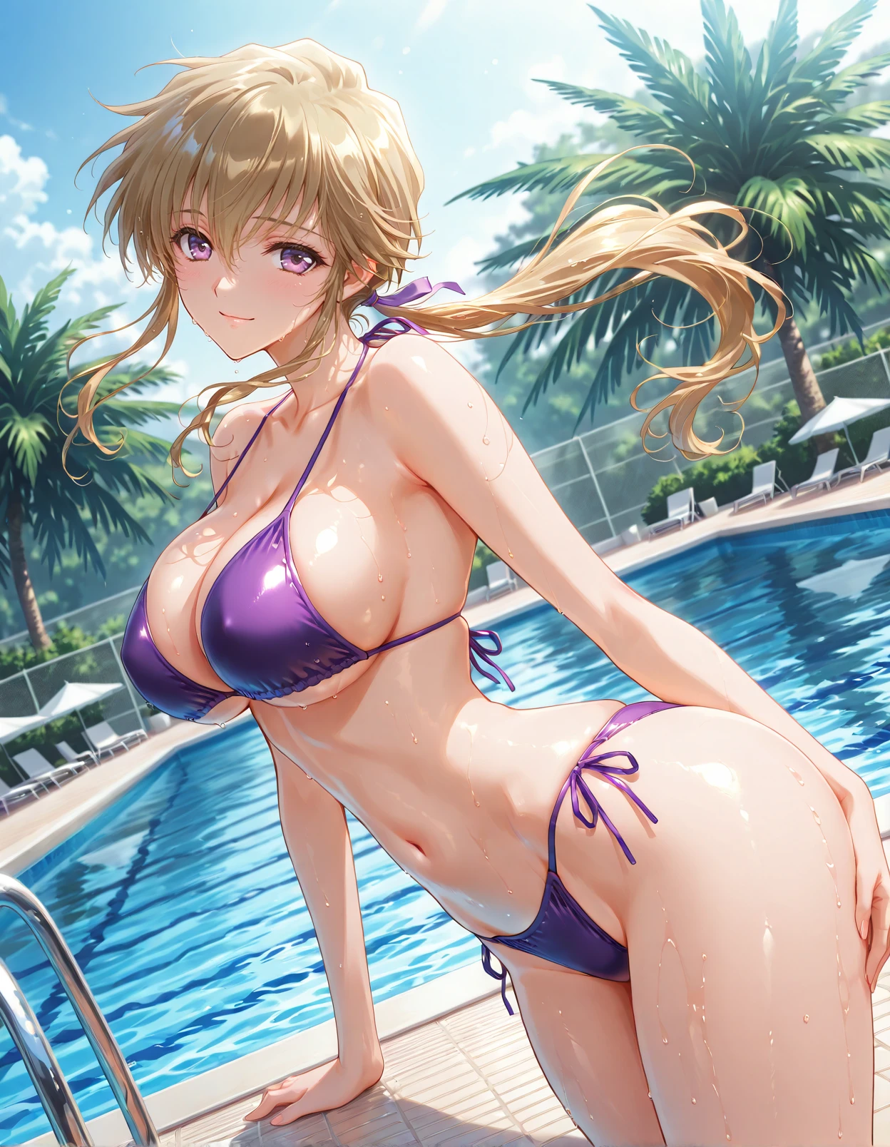 triggers include: kamiazuma yumiko, brown hair, blonde hair, purple eyes, looking at viewer, light smile, long ponytail, floating hair,