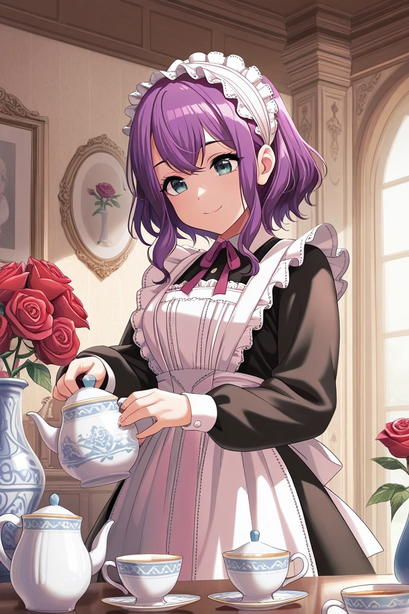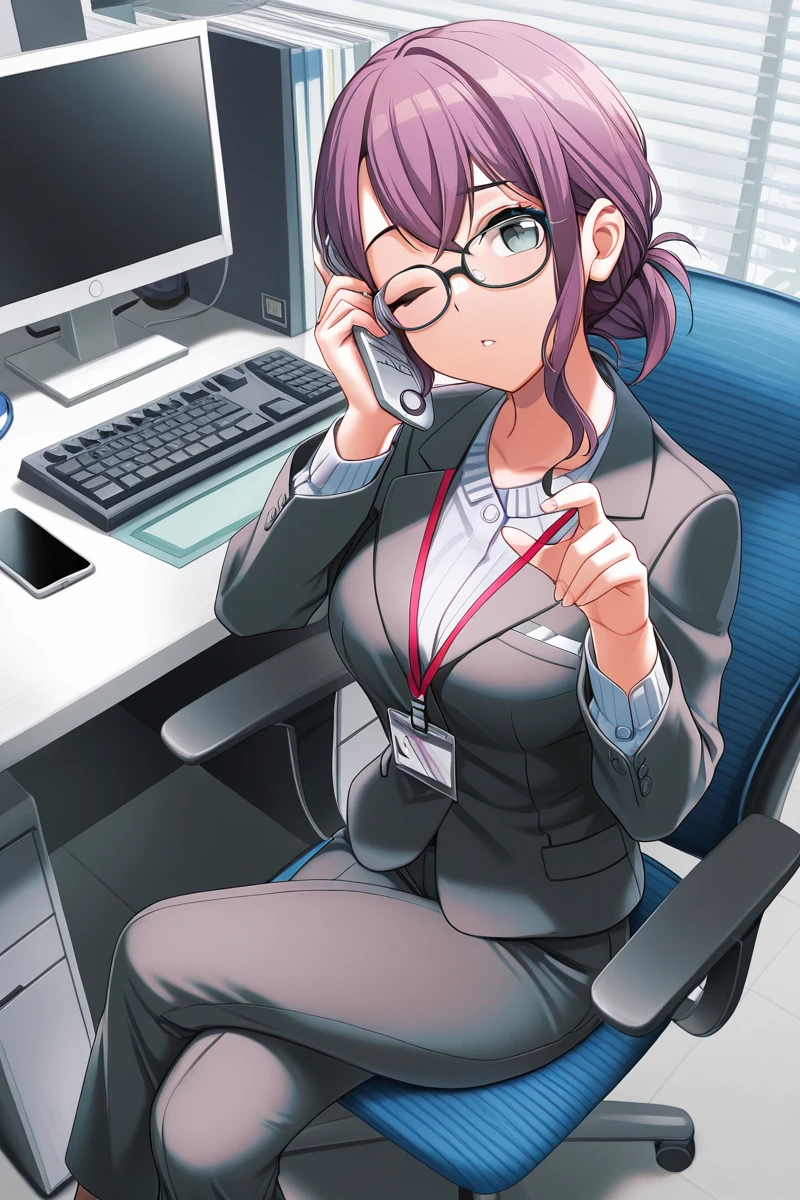 saori, 1girl, solo, pants, purple hair, denim, jeans, necklace, sweater, jewelry, short hair, long sleeves, blush, grey sweater, casual outfitBikini Saori: