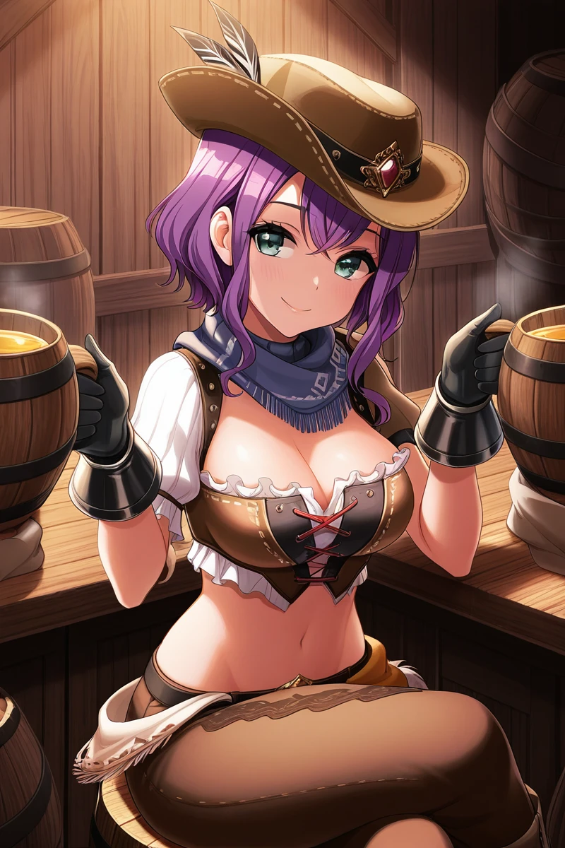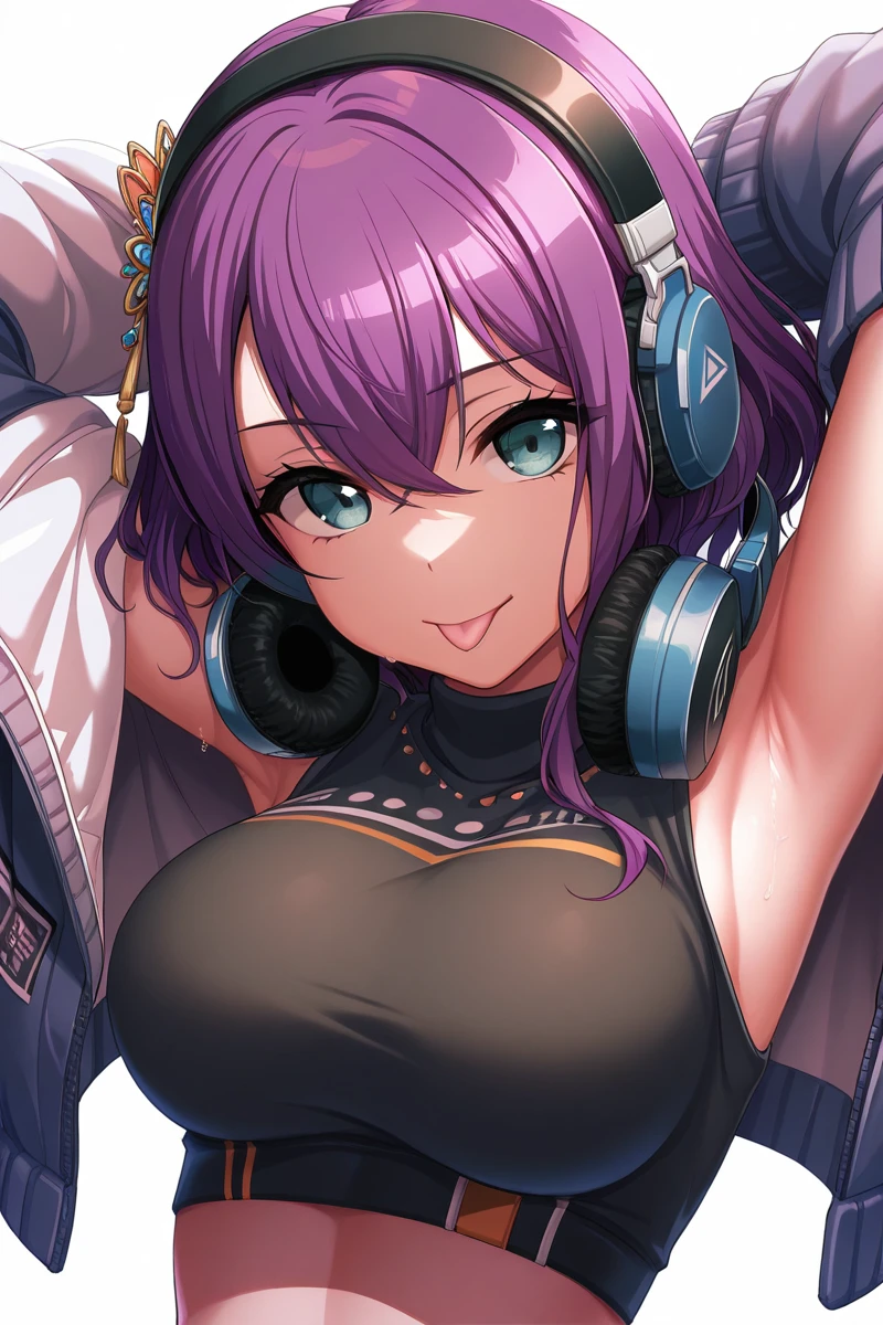 saori, 1girl, solo, pants, breasts, flower, cleavage, purple hair, jewelry, hair ornament, denim, navel, hair flower, swimsuit, bikini, smile, open mouth, stage outfitCasual Saori: