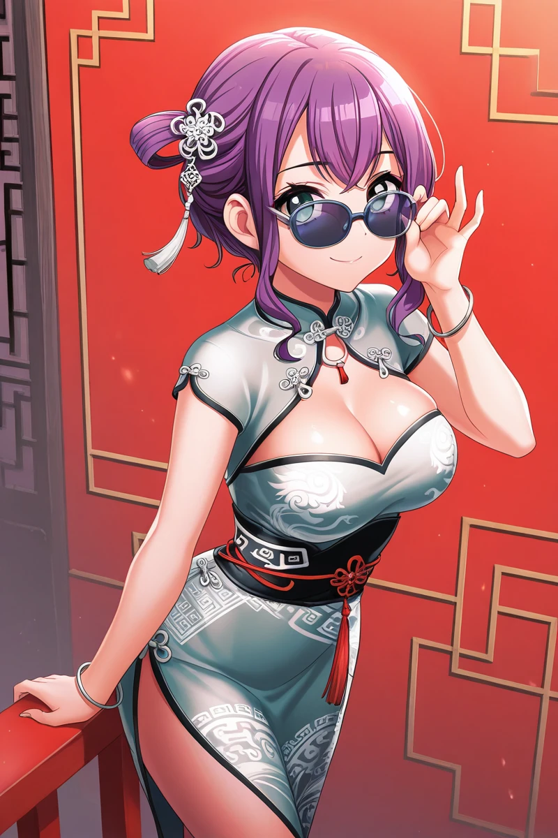 saori, 1girl, breasts, swimsuit, bikini, green eyes, solo, sunglasses, eyewear on head, large breasts, hair bun, flower, double bun, purple hair, cleavageDescription