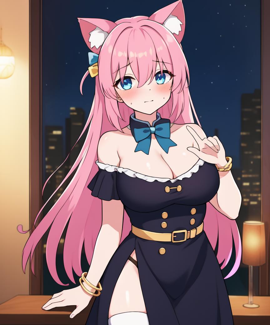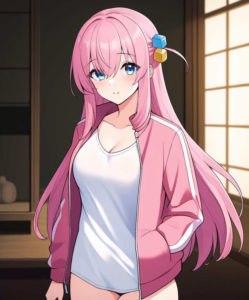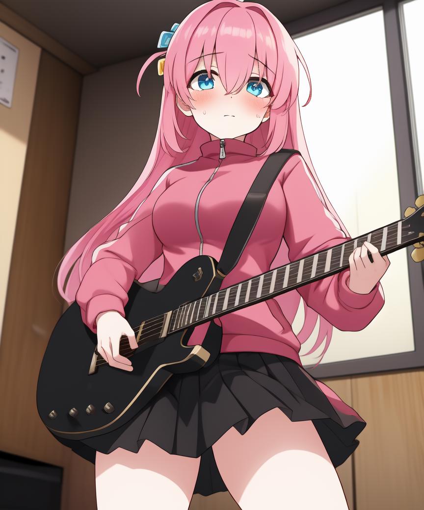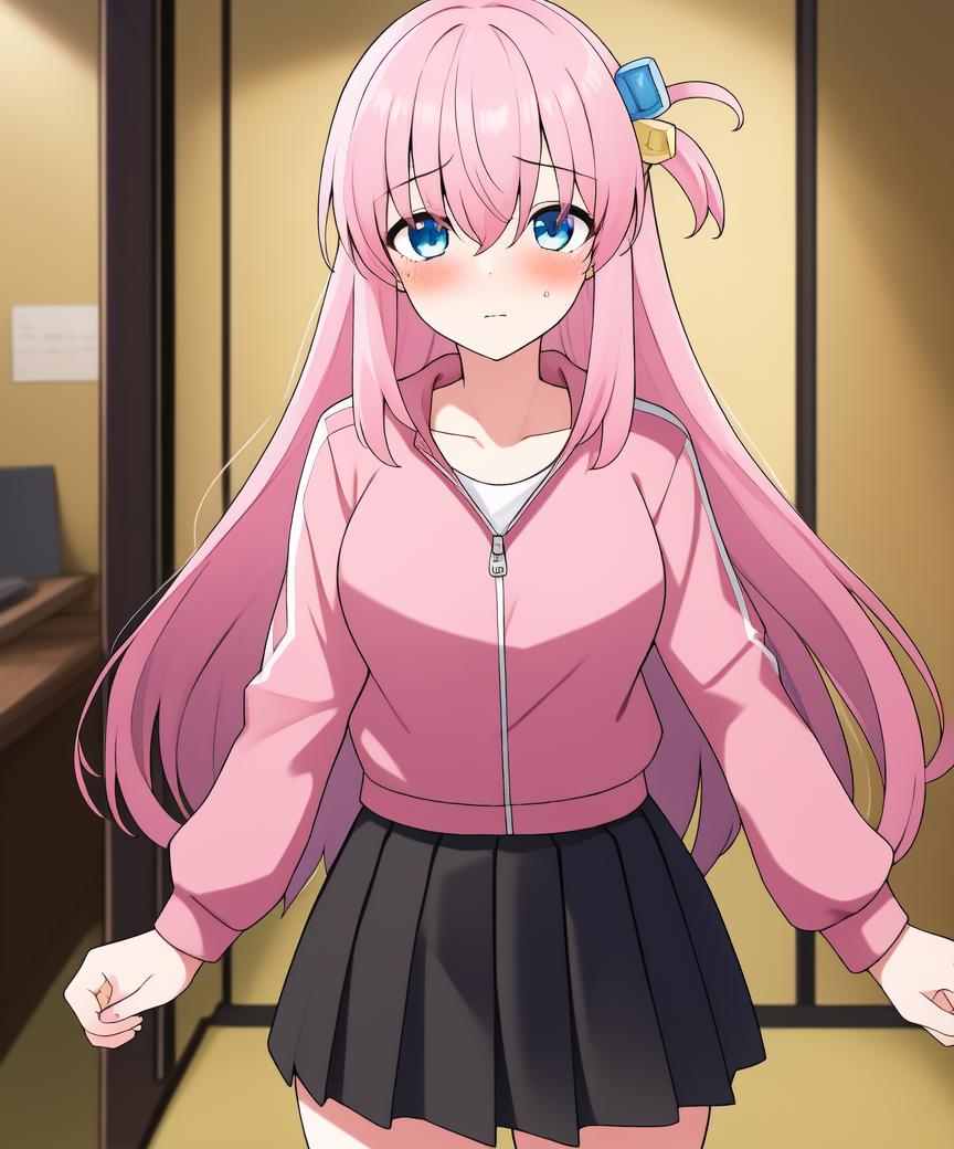 Recommended positive prompts: gotou_hitori, 1girl, solo, long hair, pink hair, blue eyes, one side up, cube hair ornament, jacket, hair over eyes, ((hair ornament)), long sleeves, track jacket, hair between eyes, pink jacket, blush, borrowed, sad, scared, shaded face, zip-zap jacket, black skirt, pleated skirt, school skirt, school shoes, white shirt