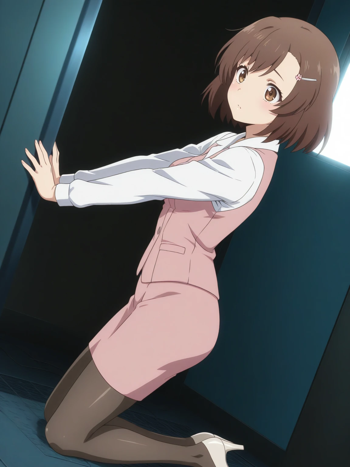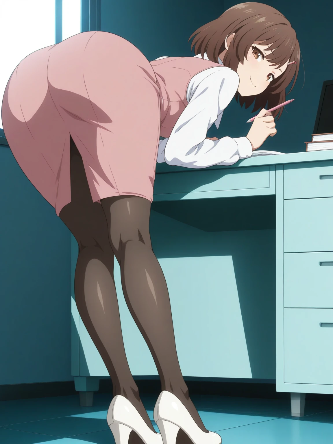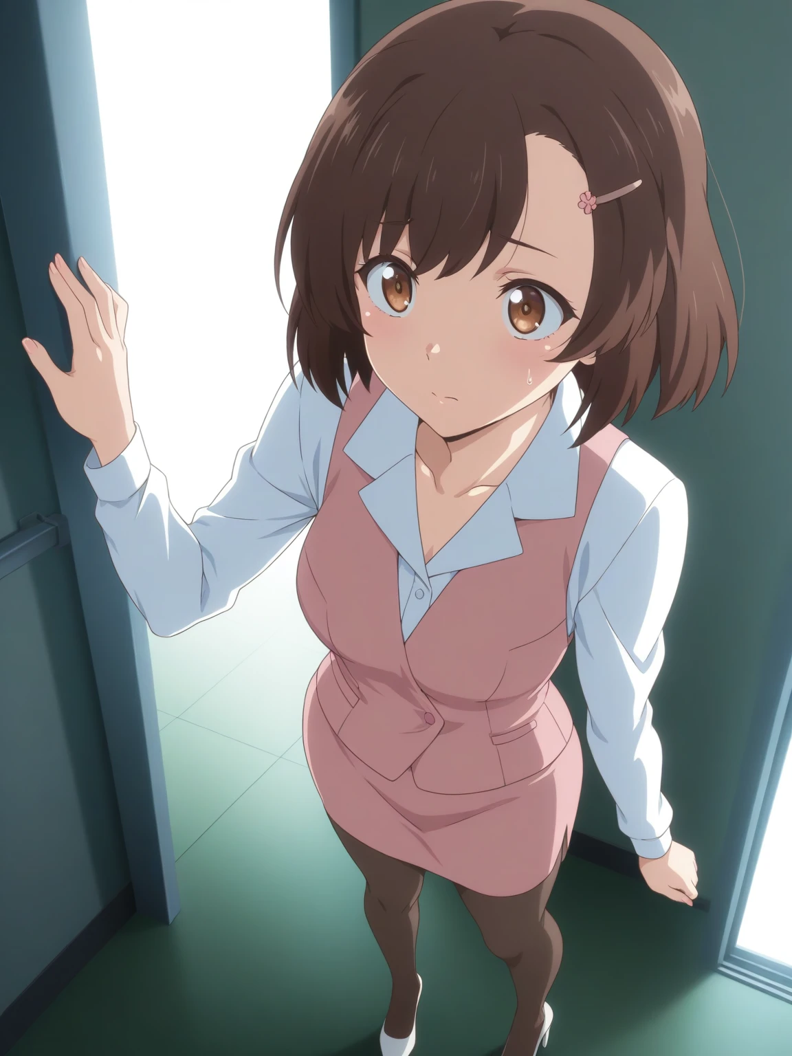 • Clothes: pink vest, white collared shirt, pink pencil skirt, pantyhose, (off-white high heels)