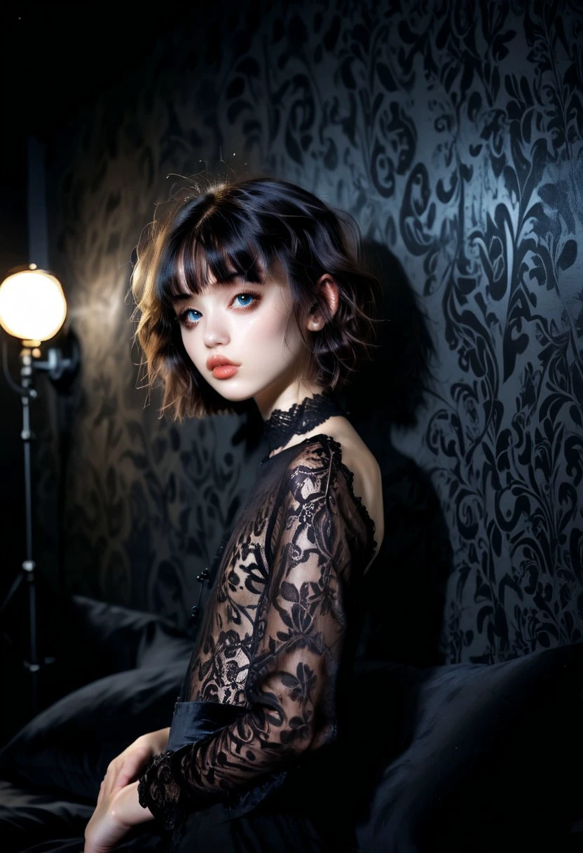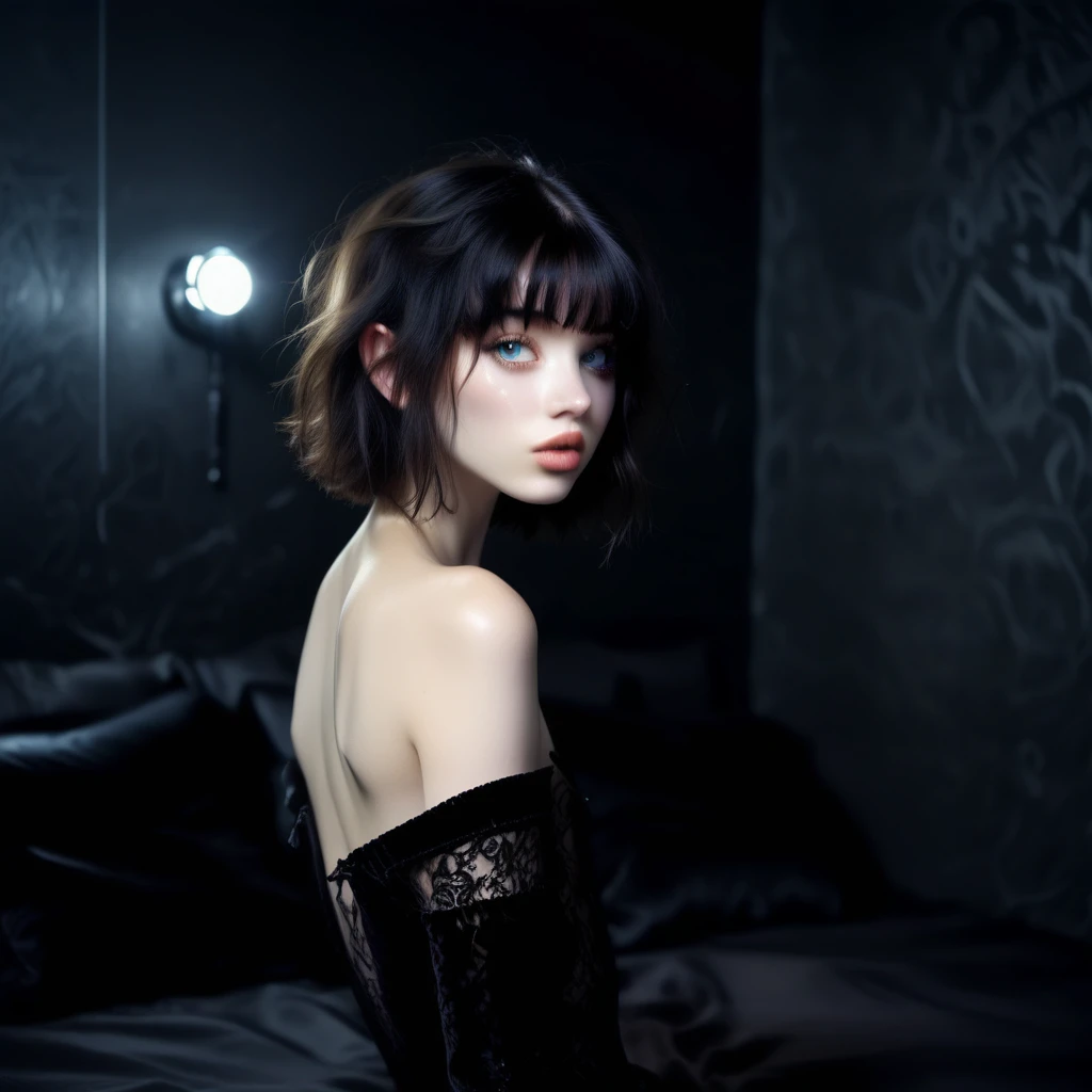 Creates a model of a dark haired, blue eyed femboy against a black backdrop, with dramatic lighting. I've called this "Welsh" because it needs a name, but it's not necessarily tied to any ethnicity or culture.