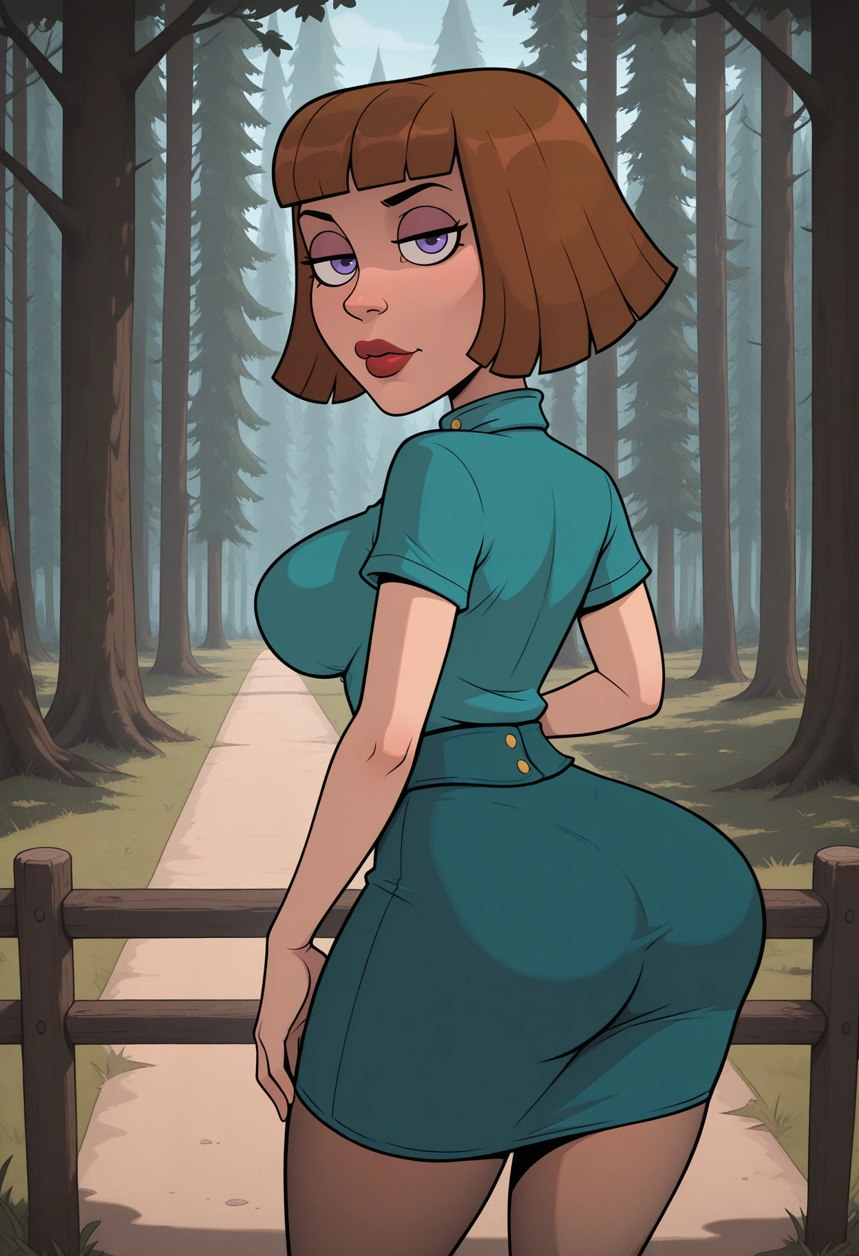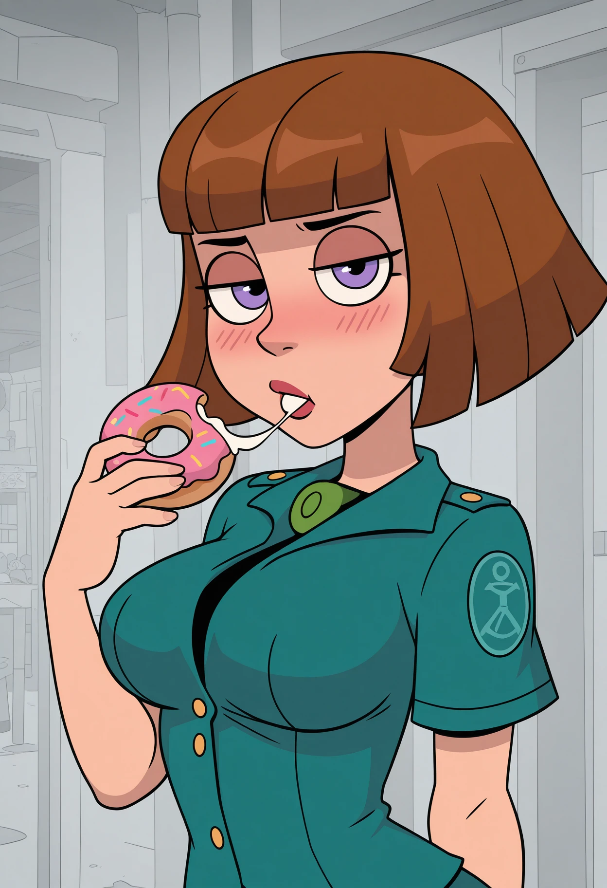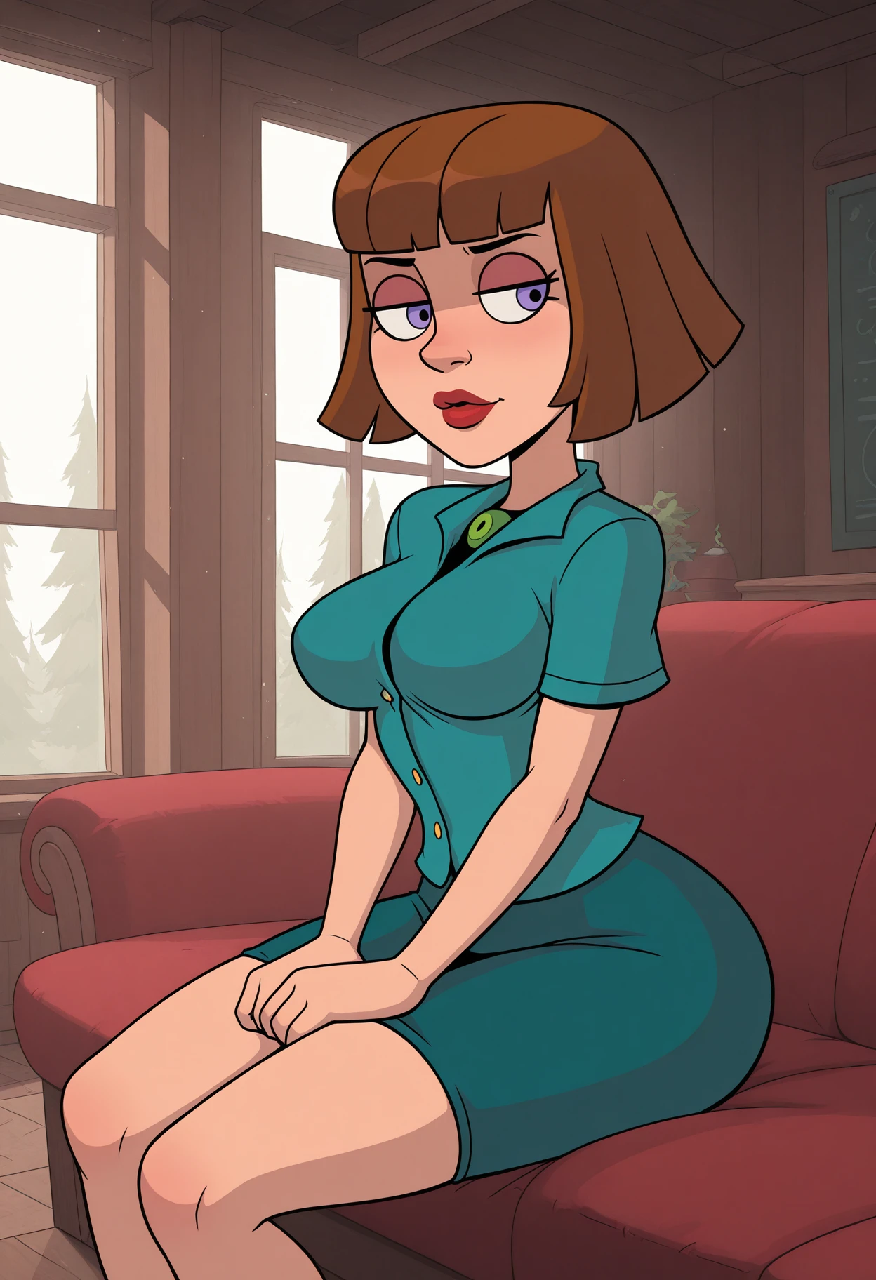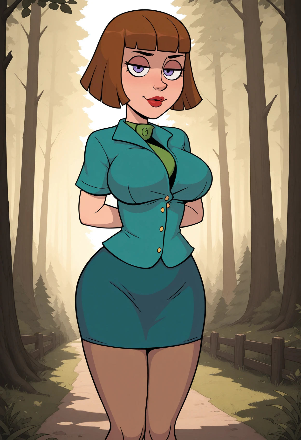 1girl, solo, purple eyes, short hair, bob cut, brown hair, blunt bangs, breasts, large breasts, makeup, lipstick, red lips,