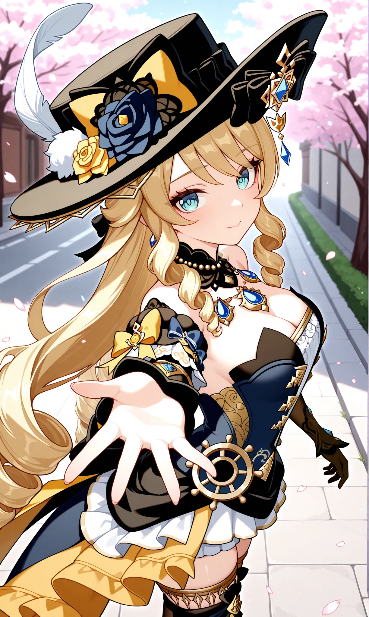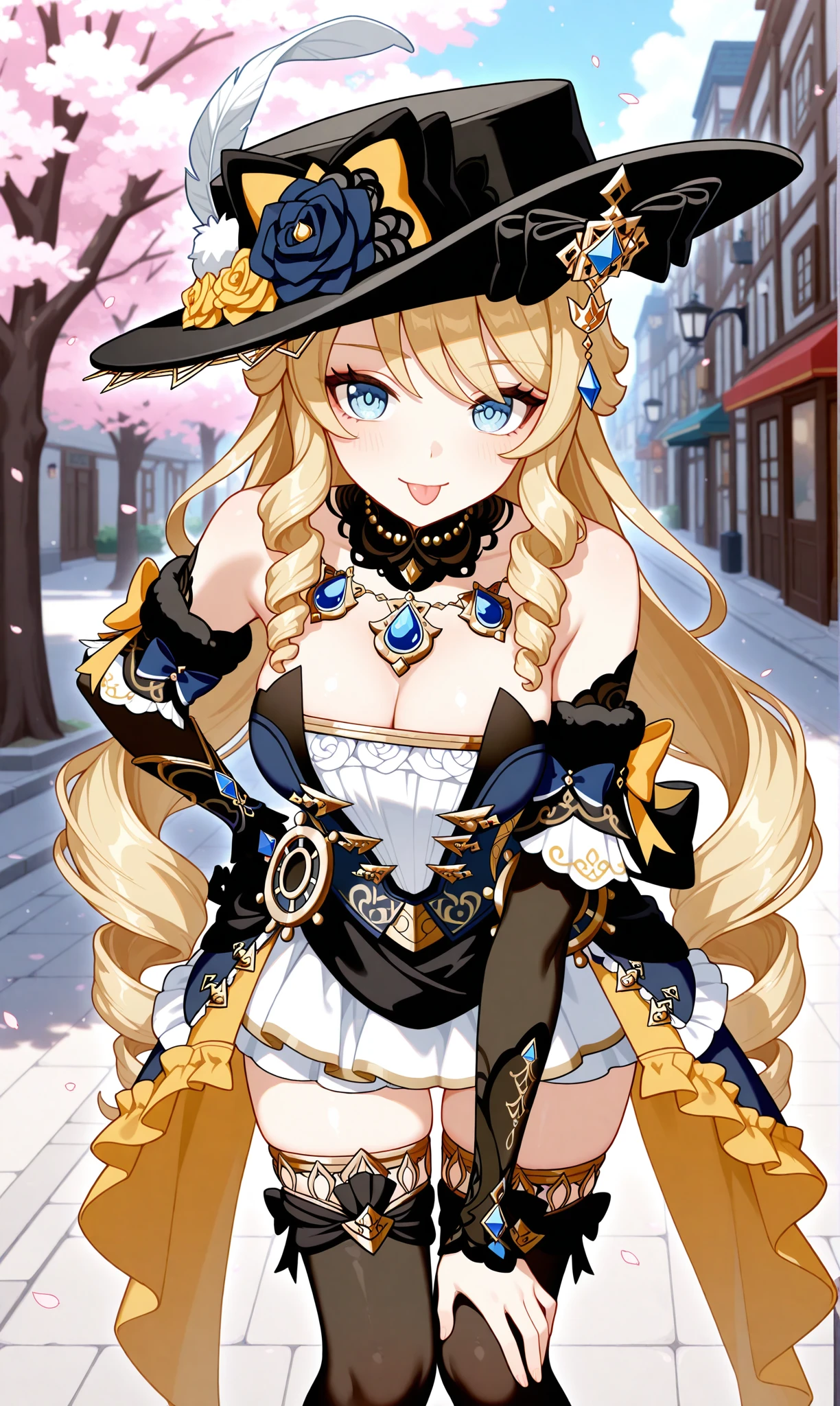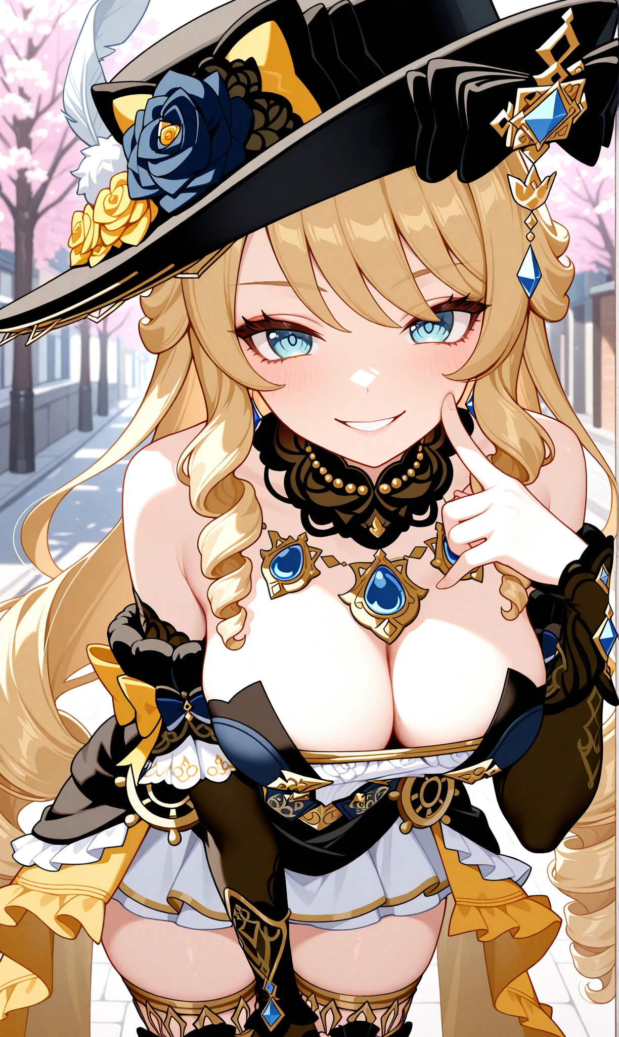 navia (genshin impact), blonde hair, long hair, blue eyes, drill hair, drill sidelocks