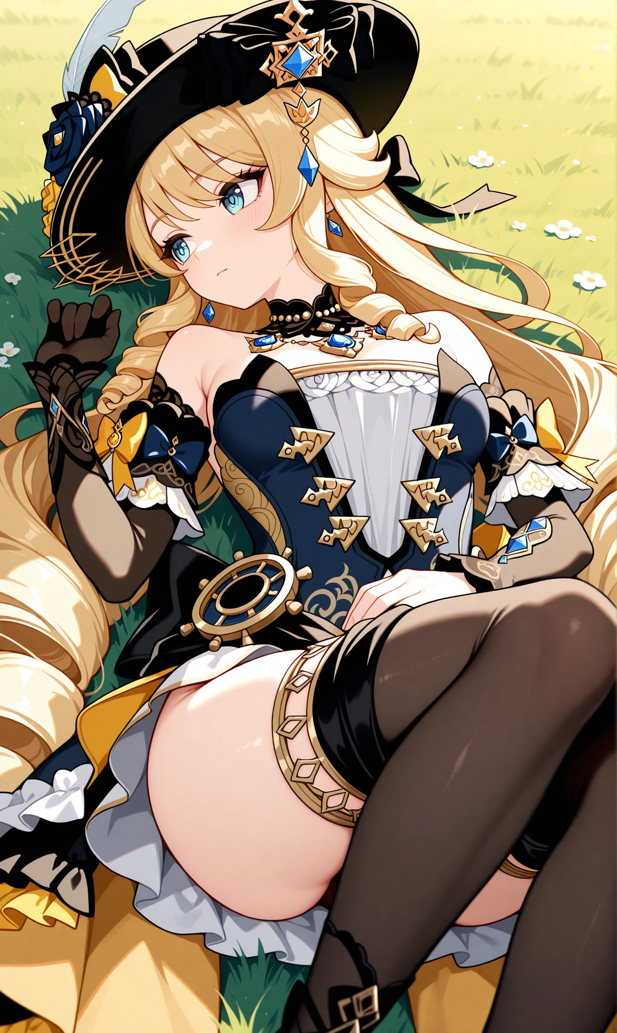 hat, black headwear, very long hair, bare shoulders, detached sleeves, strapless dress, hat flower, jewelry, thigh highs, hat feather, single glove, frillsDescription