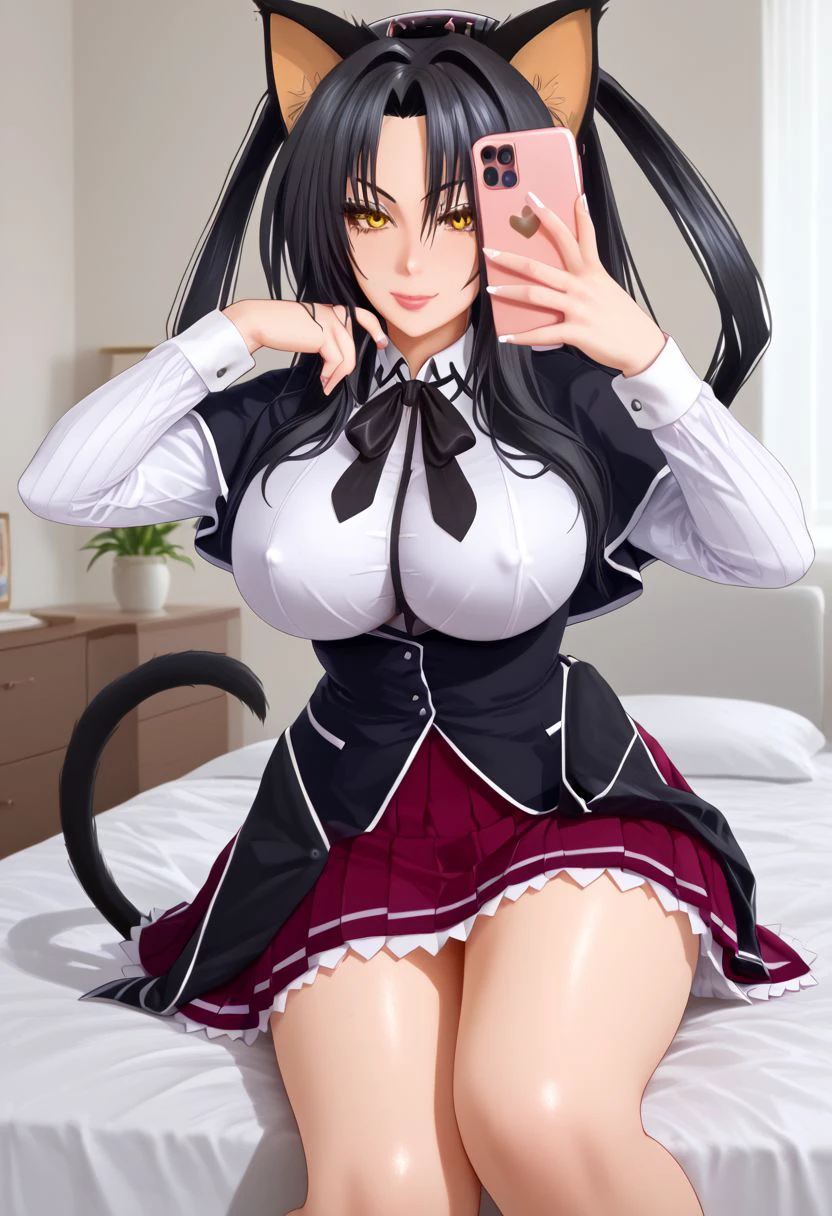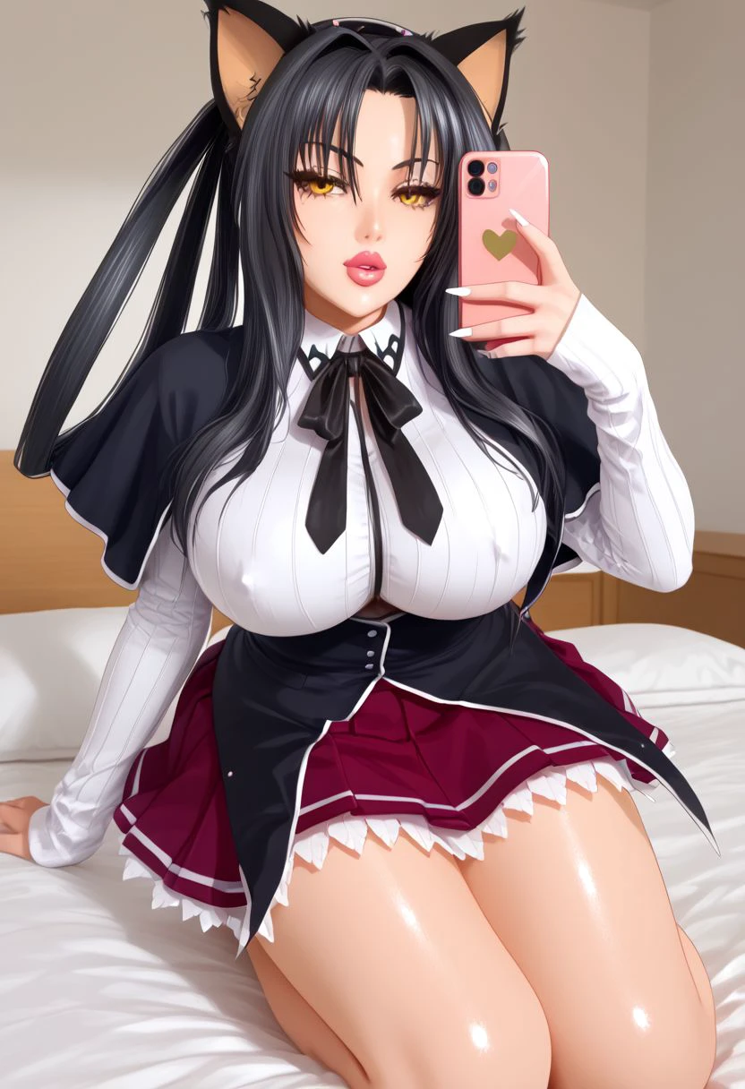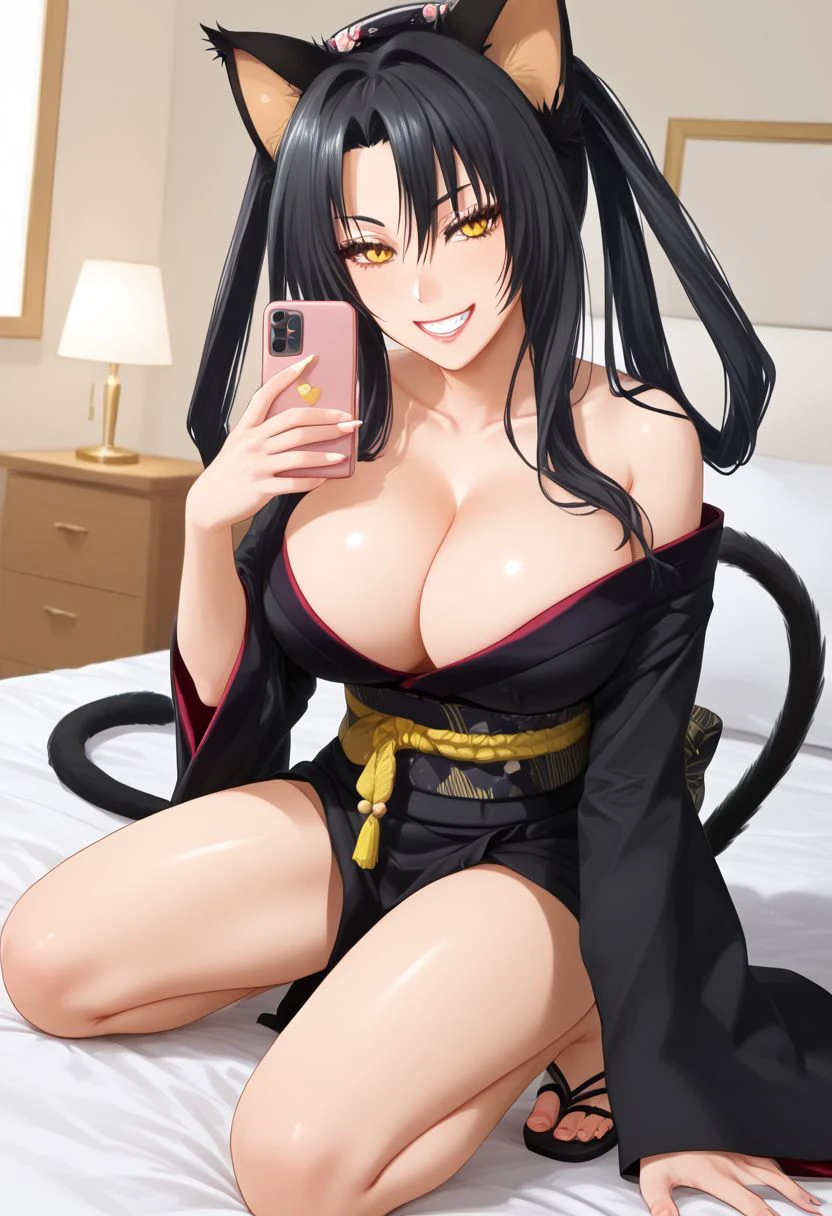 kuroka, black hair, hair rings, yellow eyes, cat ears, cat tail, ear fluff, large breasts,