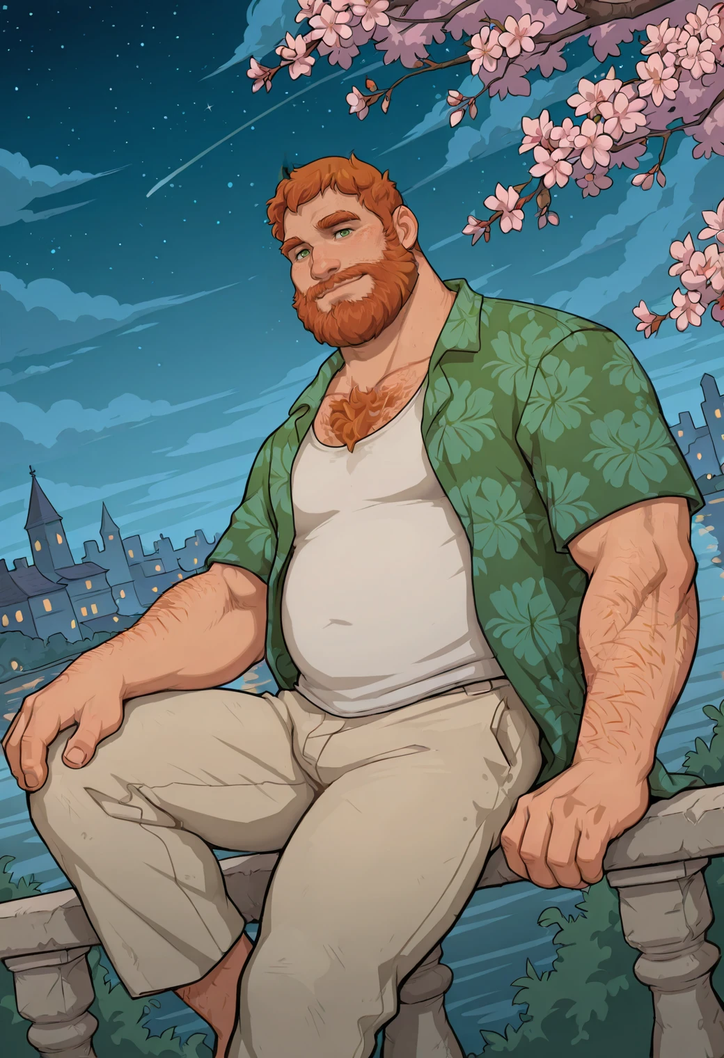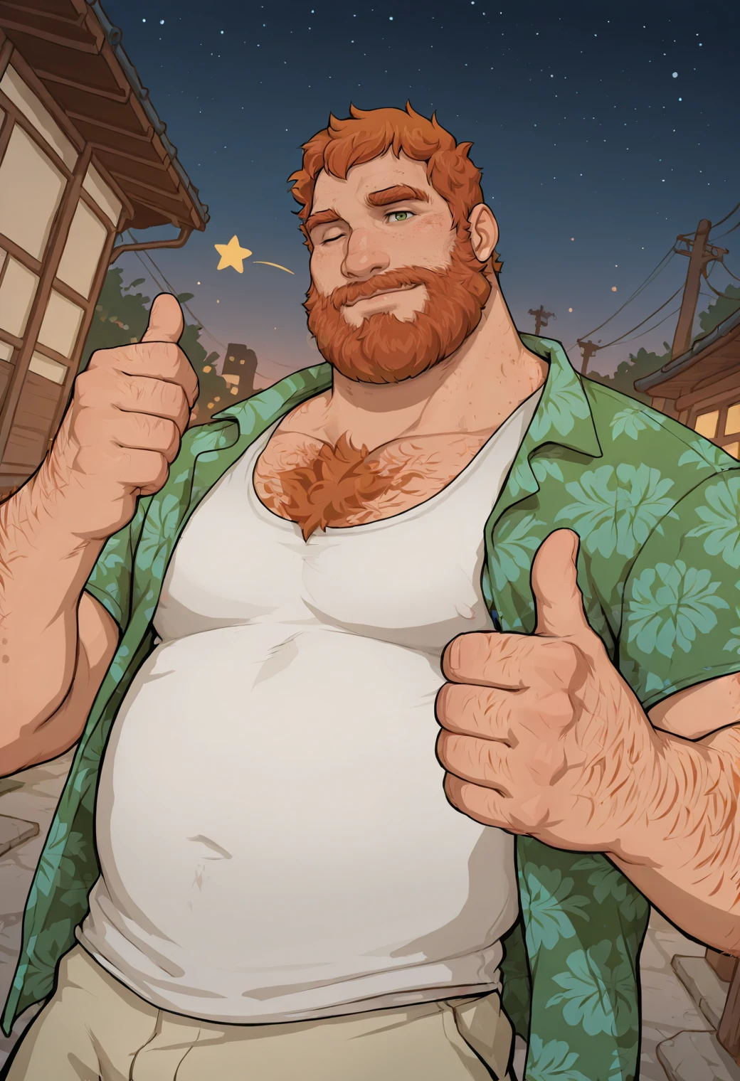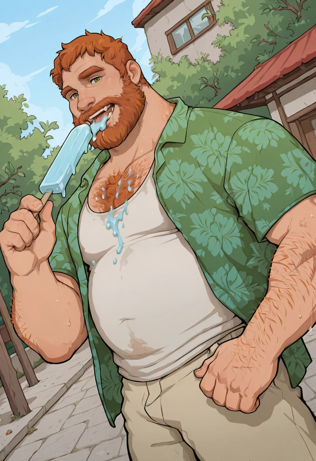 green hawaiian shirt, white tank top, khaki pants,