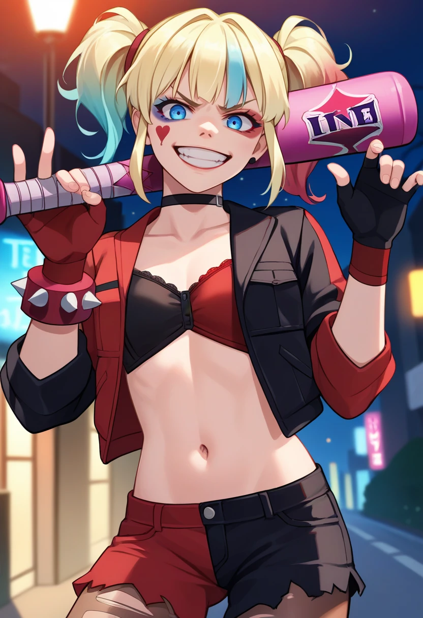 Default Outfit: open clothes, two-tone jacket, cropped jacket, black jacket, red jacket, bra, red gloves, fingerless gloves, red shorts, black shorts, torn pantyhose, black choker, spiked bracelet, midriff