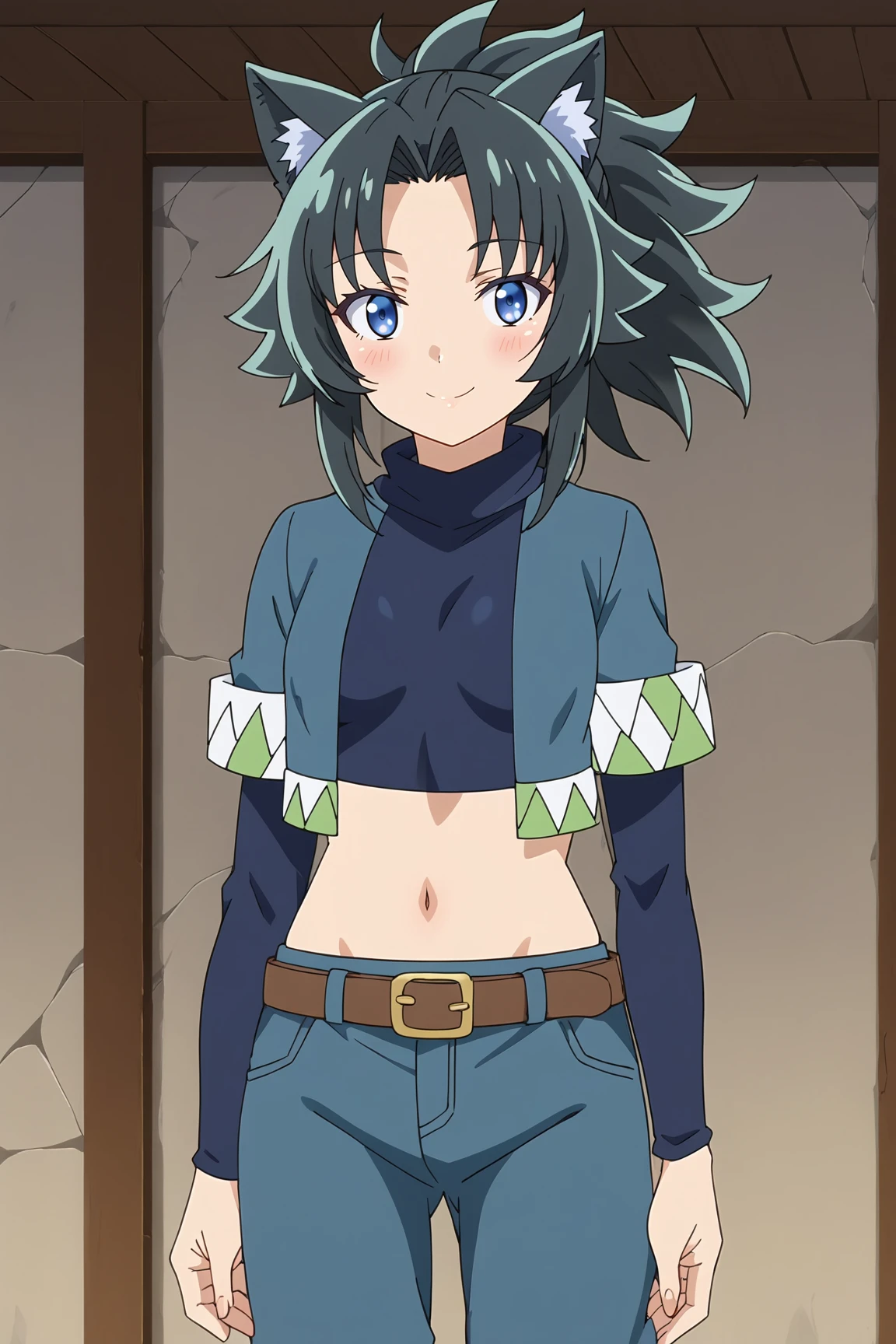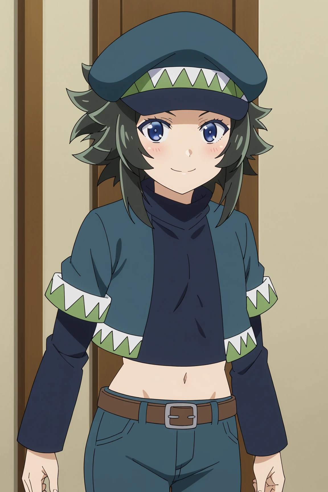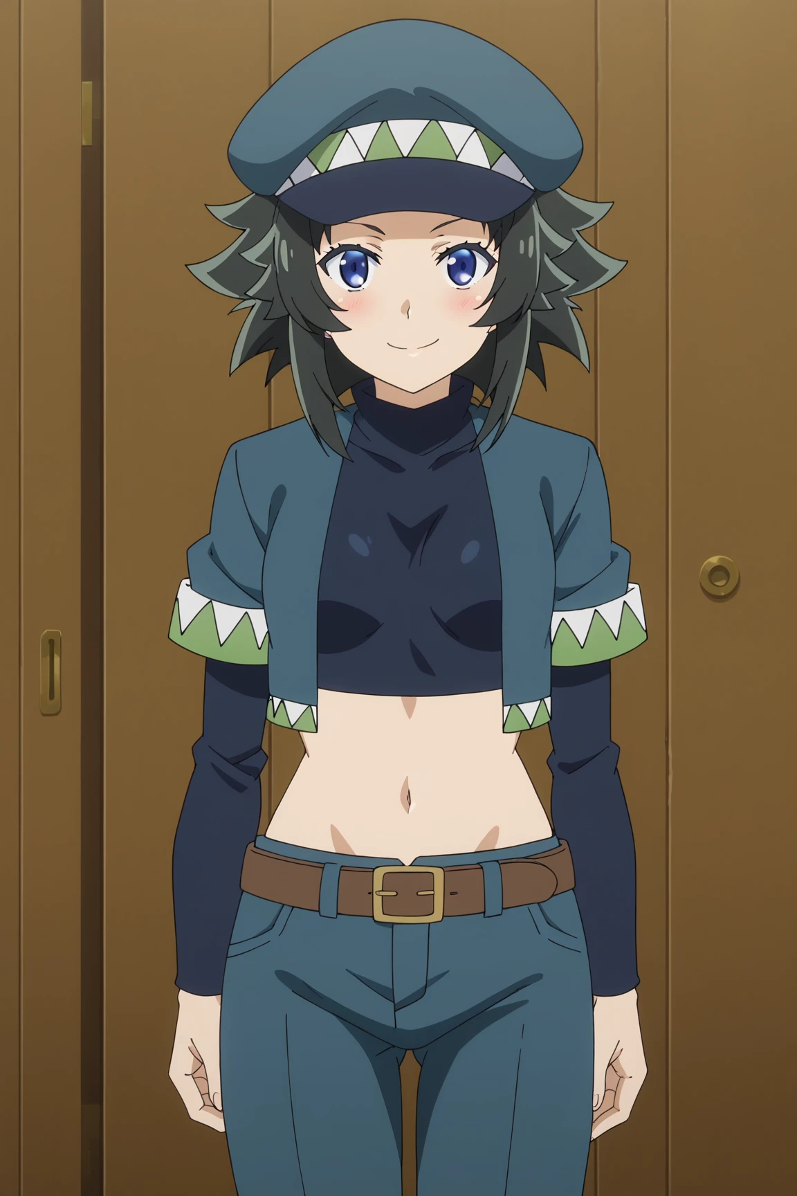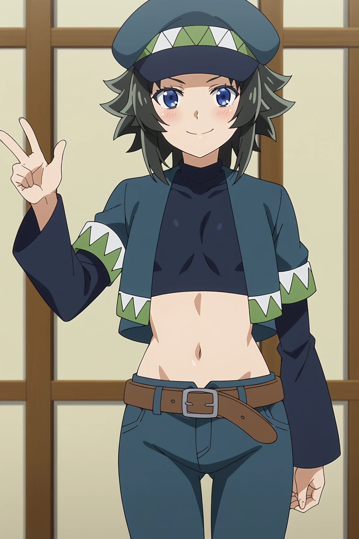 chiyomeout, jacket, pants, belt, midriff, crop top, layered sleeves, short over long sleeves, hat,outfit 2 (her ninja outfit):
