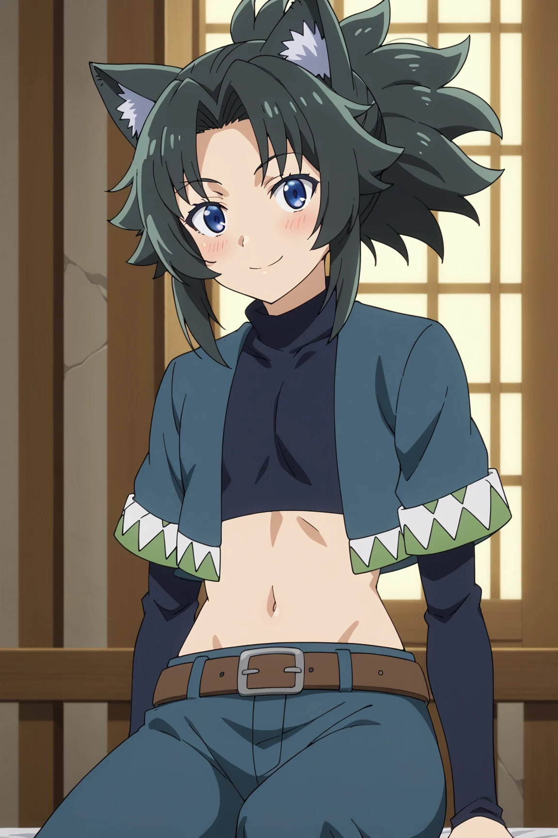 1girl, chiyome \(gaikotsu kishi-sama tadaima isekai e o dekake-chuu\), gaikotsu kishi-sama tadaima isekai e o dekake-chuu, blue eyes, black hair, ponytail, outfit 1 (her common clothes):