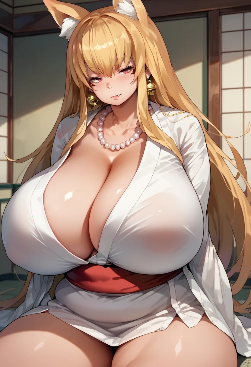 kitsuneyakonkonv2, facial_tattoo, jingle_bell_earrings, pearl_necklace, very long hair, red eyes, slit pupils, thick eyebrows, fang, half-closed eyes, gigantic breasts, plump, curvy, thick thighs, fat,In the original work, the character has a very voluptuous body, so I would like the word 'chubby' to be included. However, since the body type has not been trained, it is also possible to make the character have a slender body by not inputting the word.
