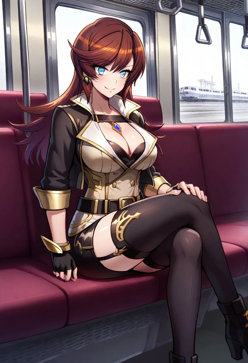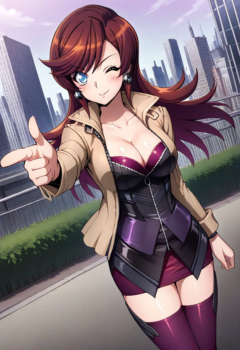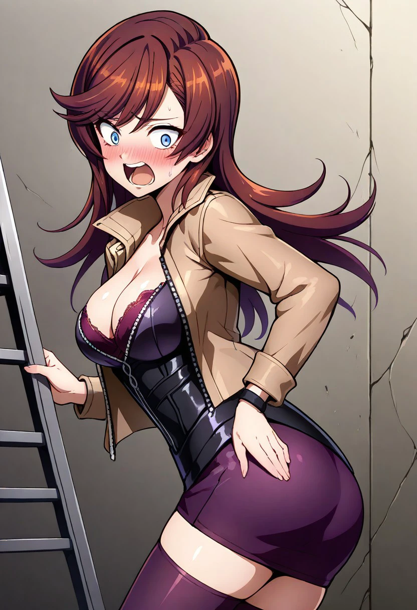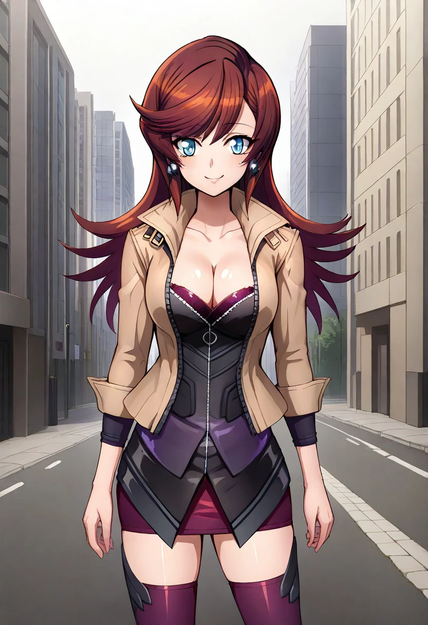 1girl, solo, MiinaWeltkatze, auburn hair, long hair, swept bang, blue eyes, tan leather jacket, purple bra, cleavage, black leather shirt, desaturated purple corset, dark purple skirt, dark purple thighhighs, pencil skirt (put 'tanned/tan skin' into negative. The AI gets dumpy when it sees the word 'tan' :V)