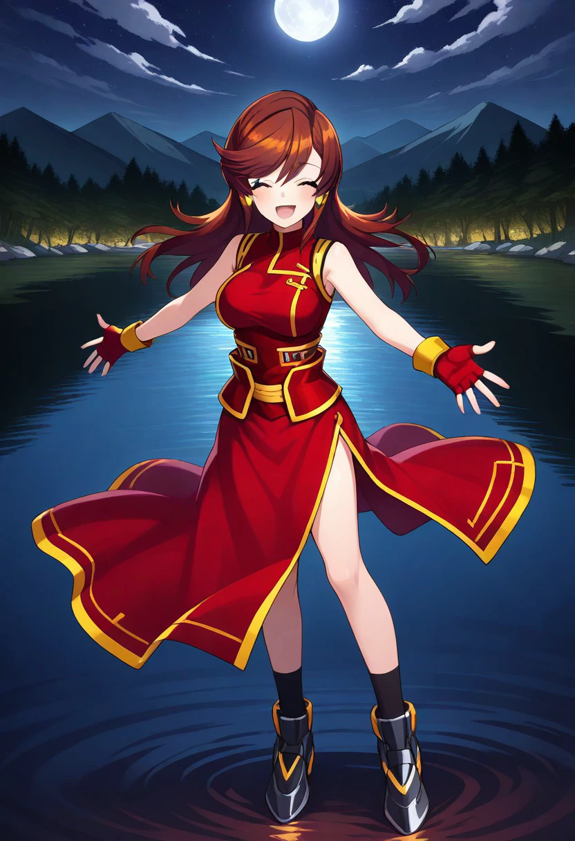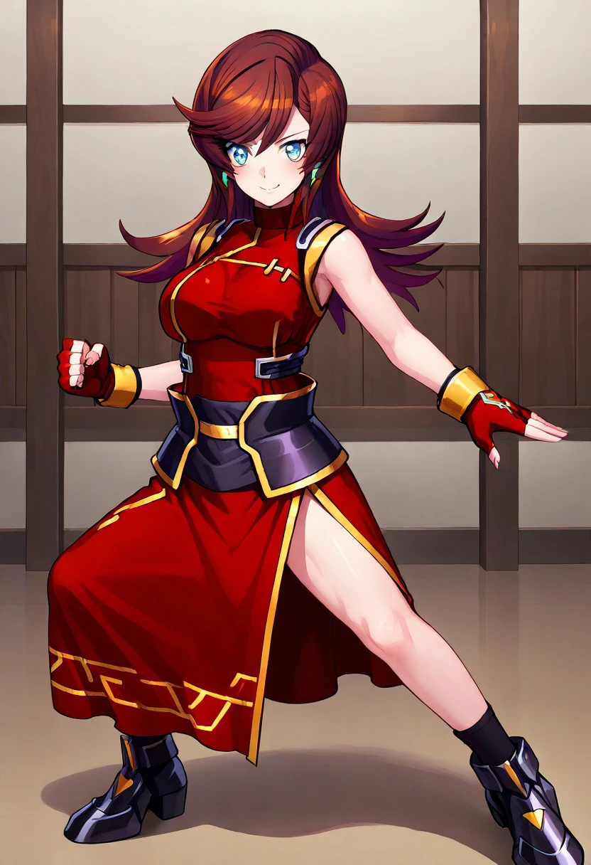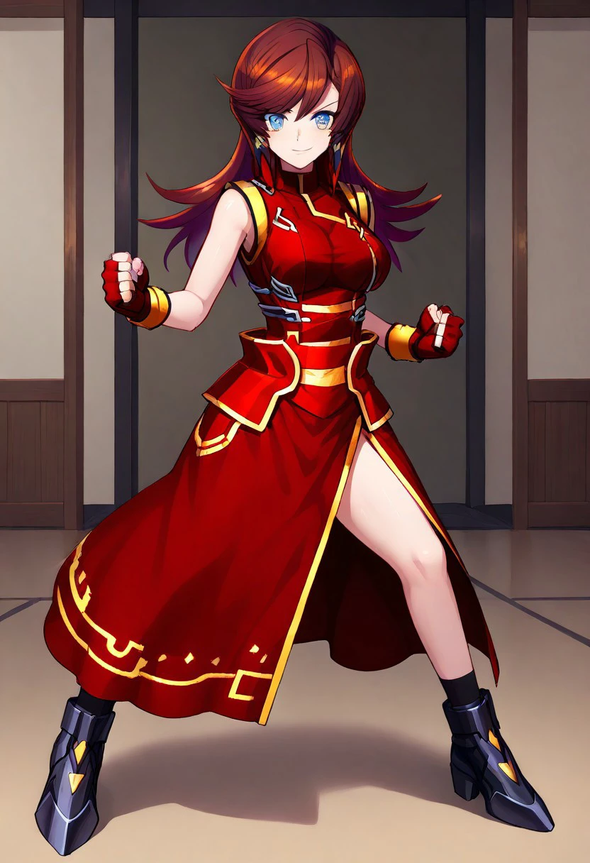 1girl, solo, MiinaWeltkatze, auburn hair, long hair, swept bang, blue eyes, red dress with yellow trim, side slit, red corset with yellow trim, bare shoulders, black socks, metal shoes