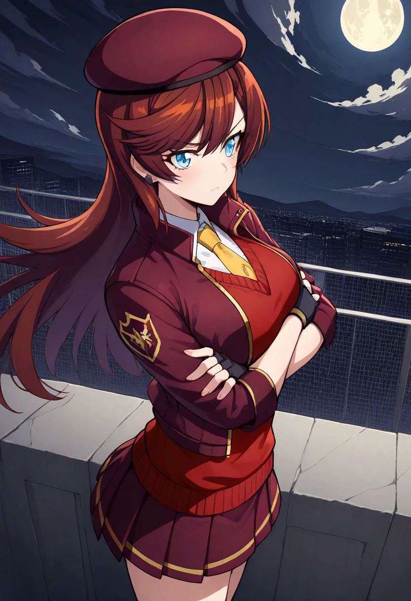 1girl, solo, MiinaWeltkatze, auburn hair, long hair, swept bang, blue eyes, red sweater, sweater vest, collared undershirt, white undershirt, undershirt, yellow tie, dark red cropped jacket, dark red skirt, miniskirt, pleated skirt, gold trim, fingerless gloves, black gloves, red beret
