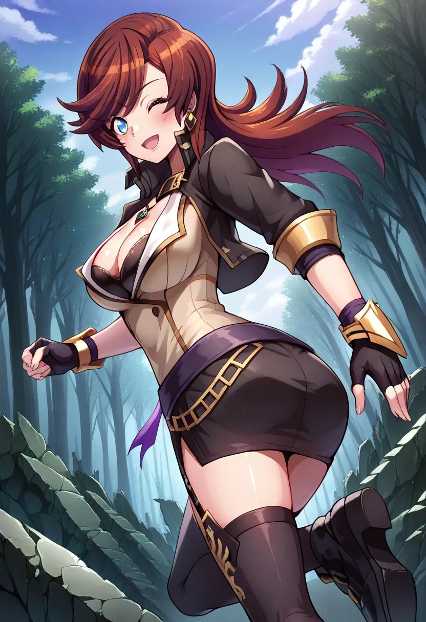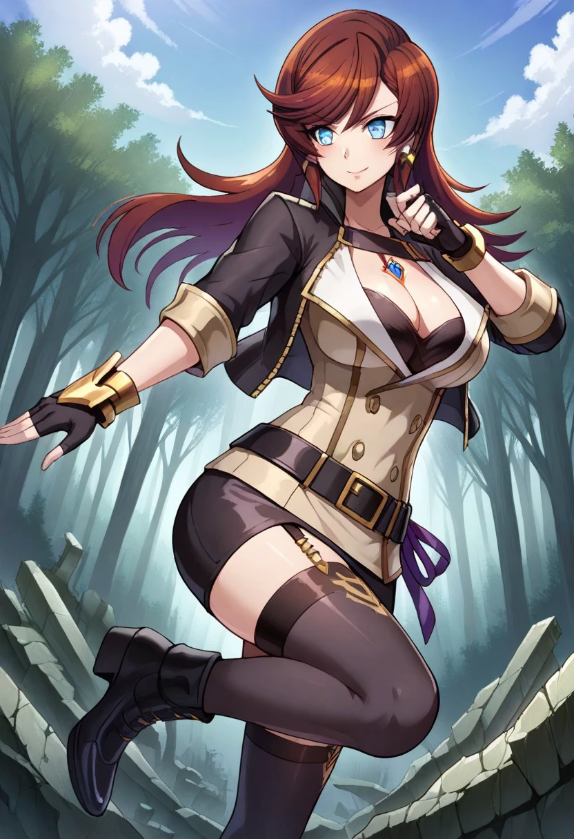 1girl, solo, MiinaWeltkatze, auburn hair, long hair, swept bang, blue eyes, black cropped jacket, black bra, pruple gem necklace, cleavage, tan shirt, double-breasted, double-breasted shirt, belts, gold trim, black miniskirt, pencil skirt, garterbelt, black thighhighs, black shoes, purple waist ribbon, black gloves, fingerless gloves, gold gauntlets