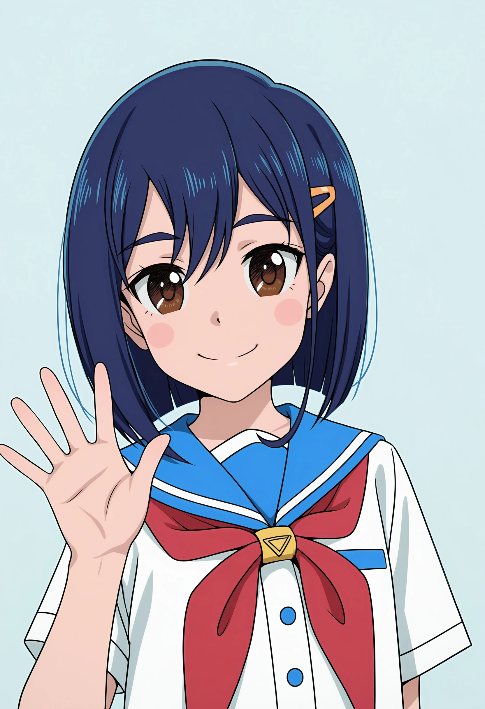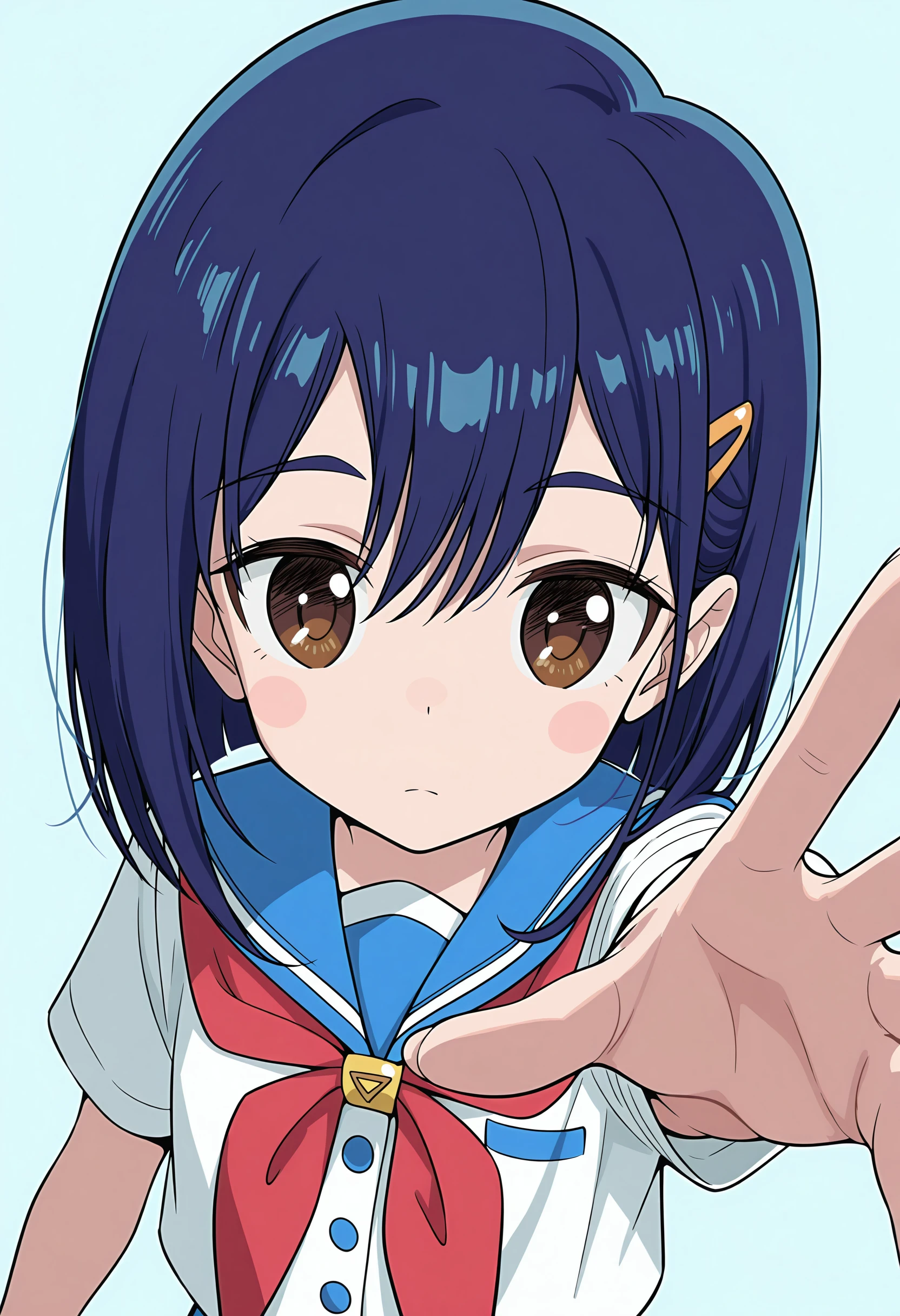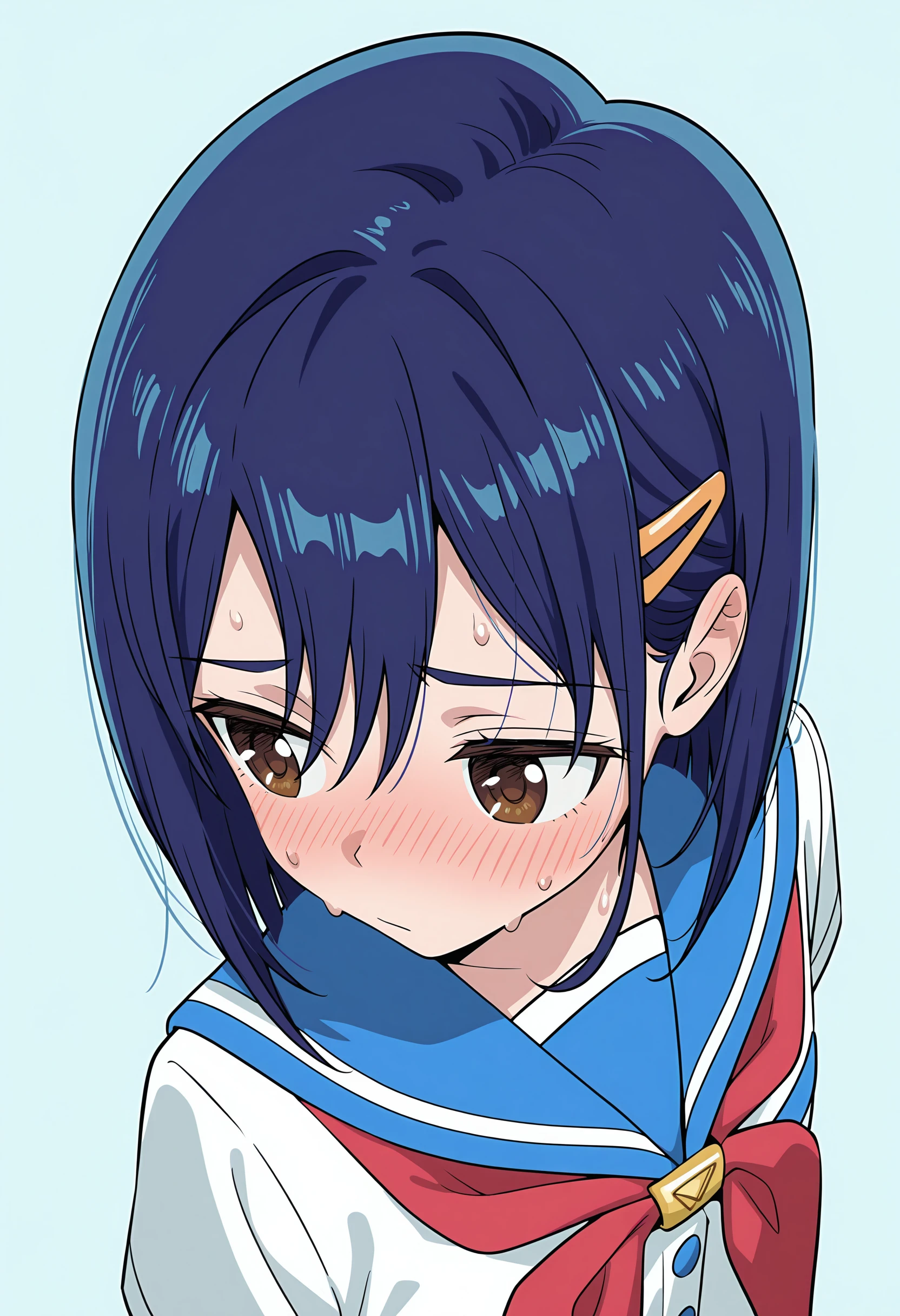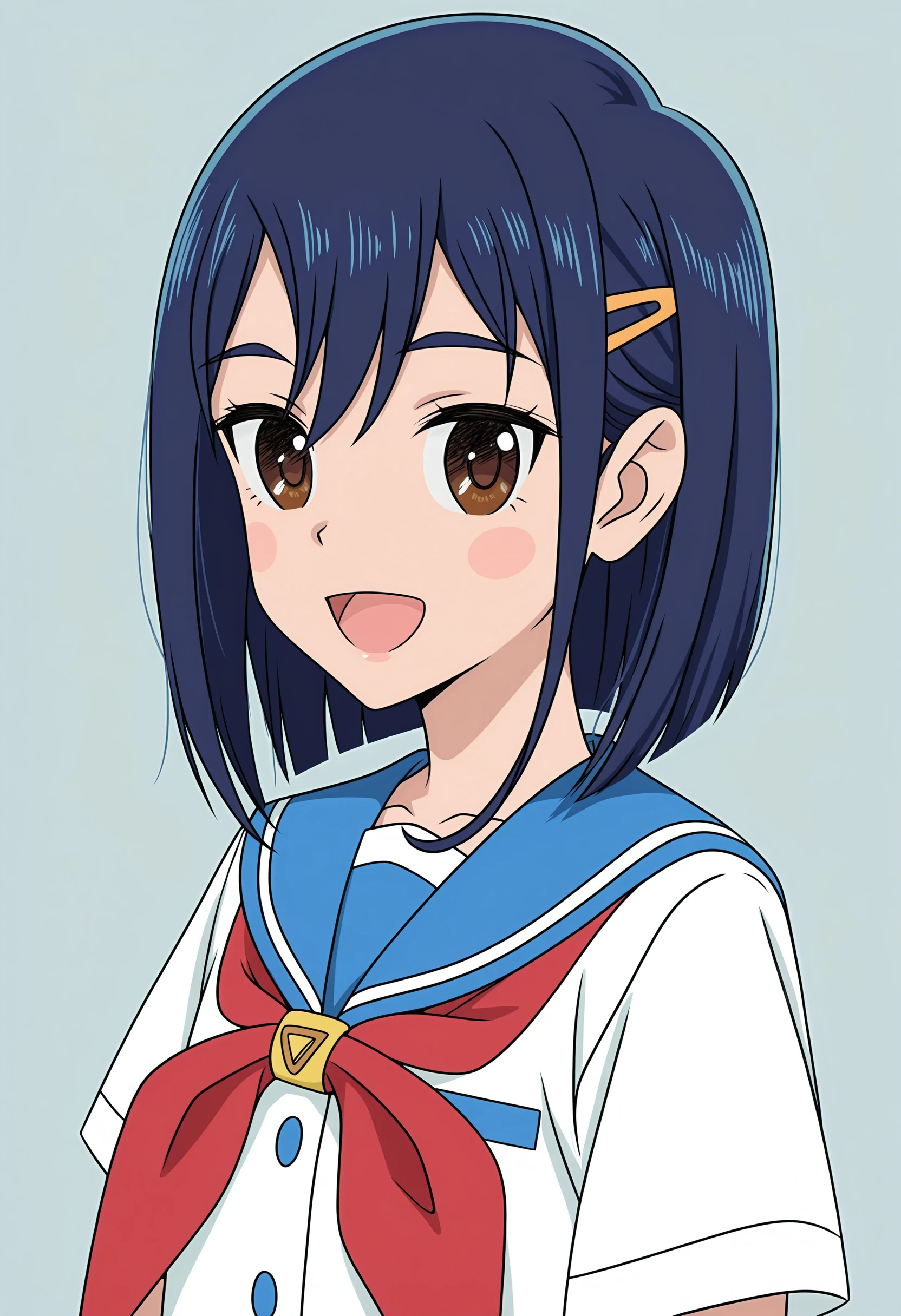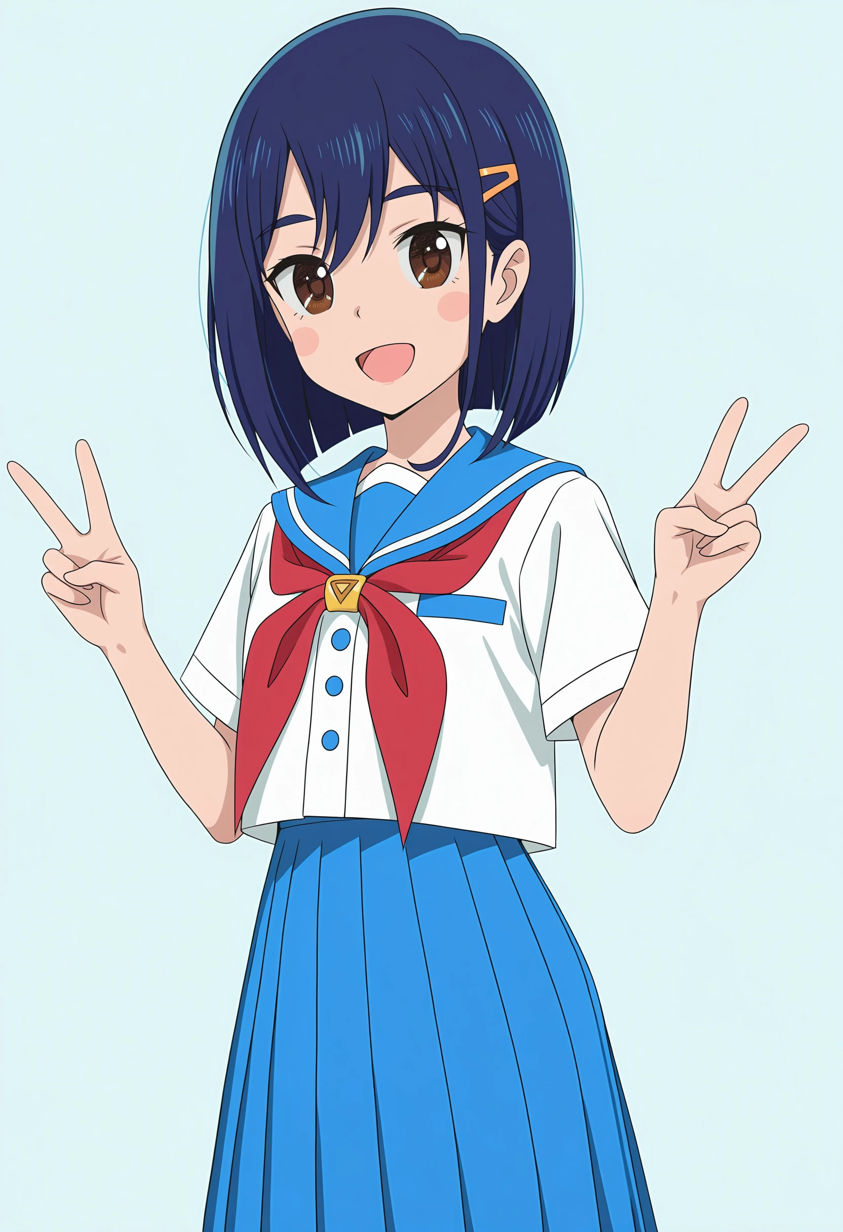 short hair, brown eyes, blue hair, hairclip, serafuku, pleated skirt, thighhighs