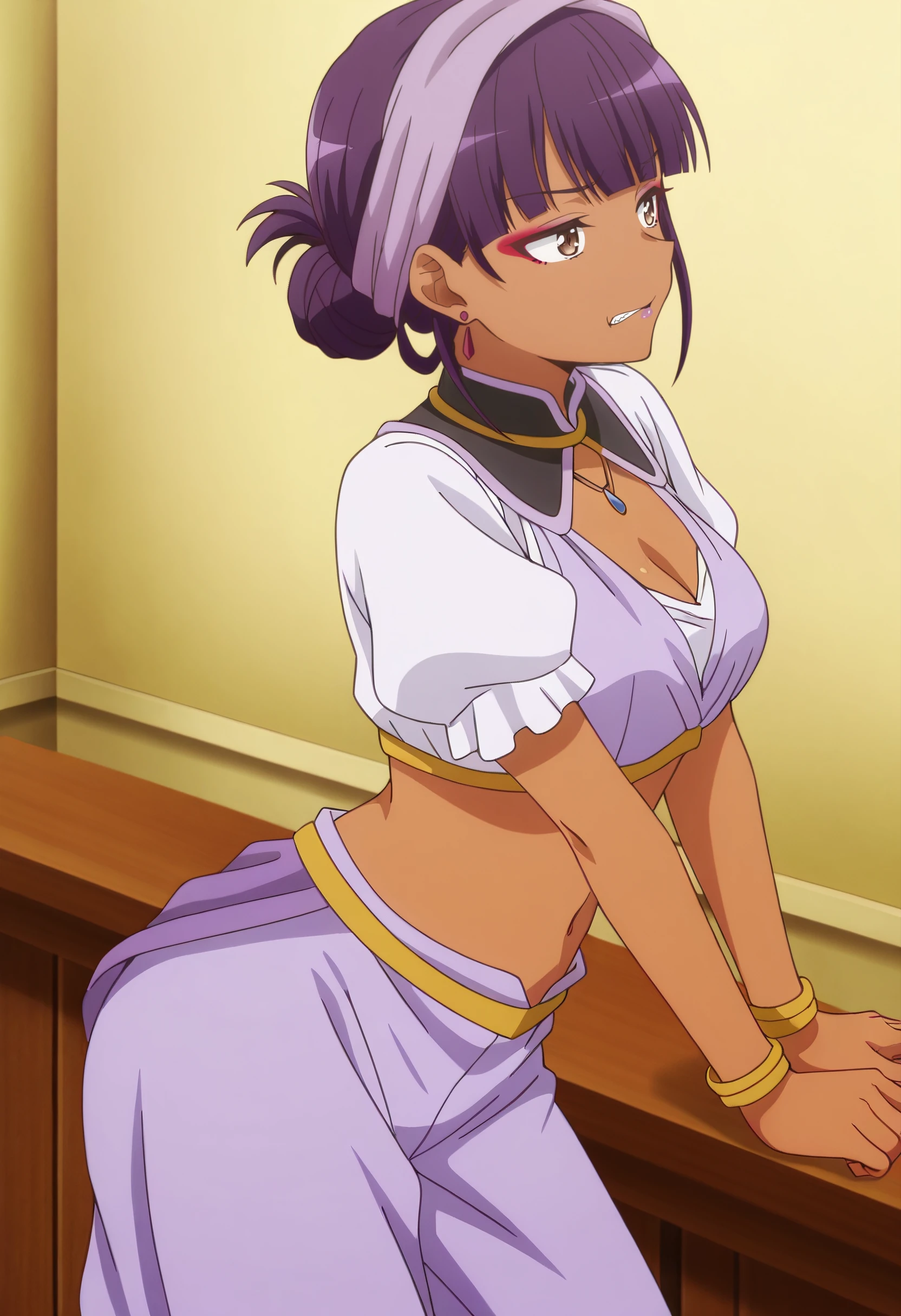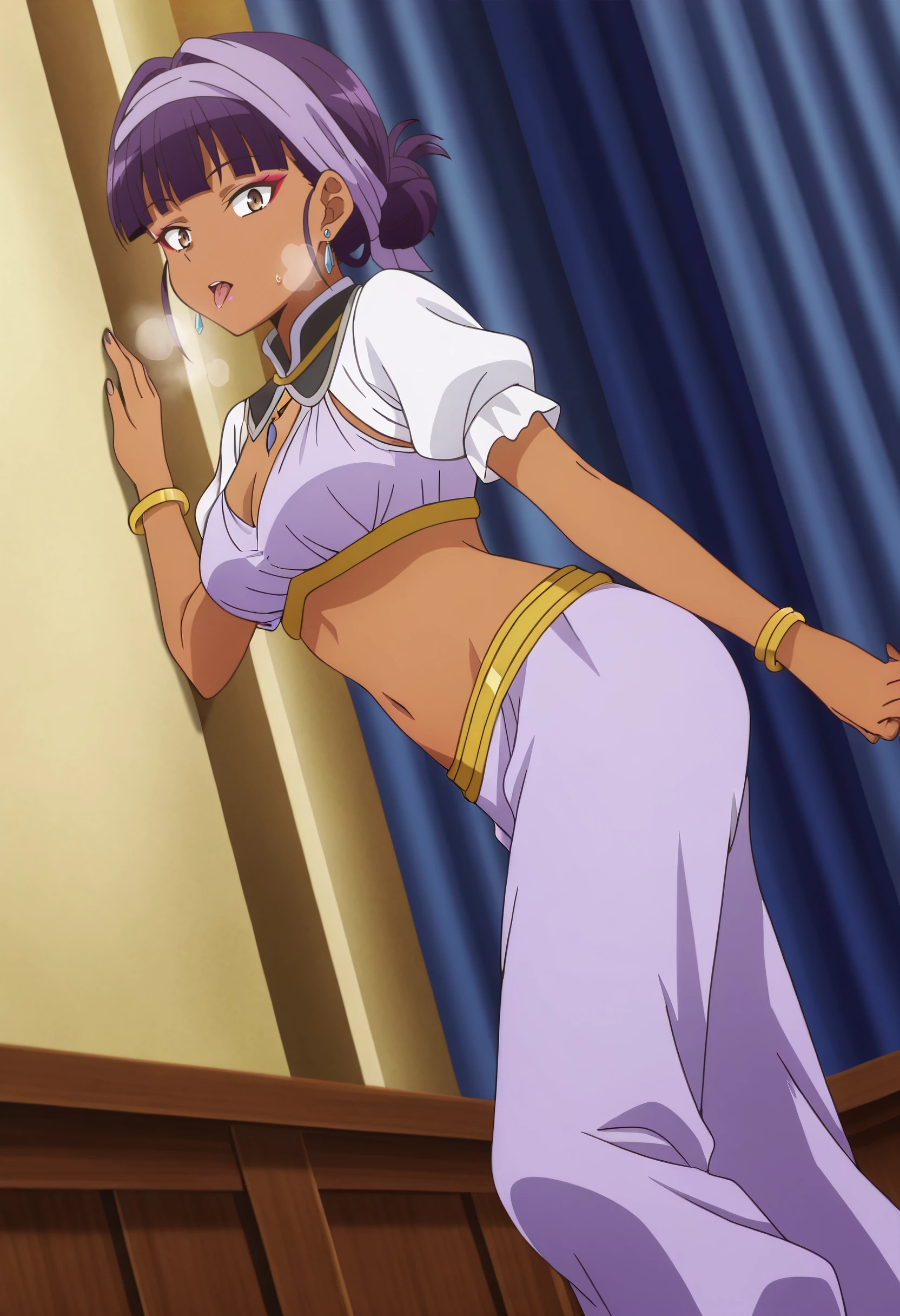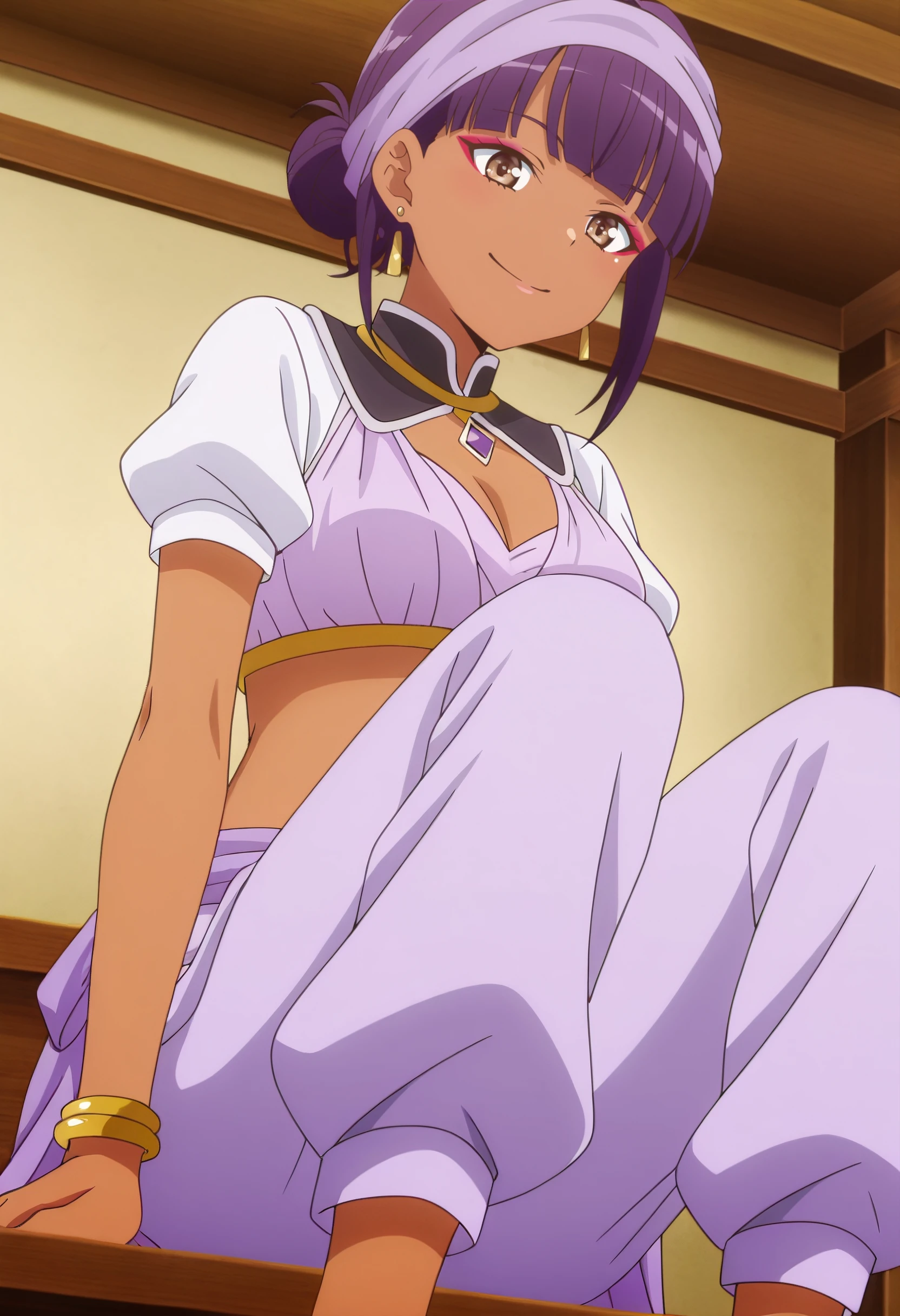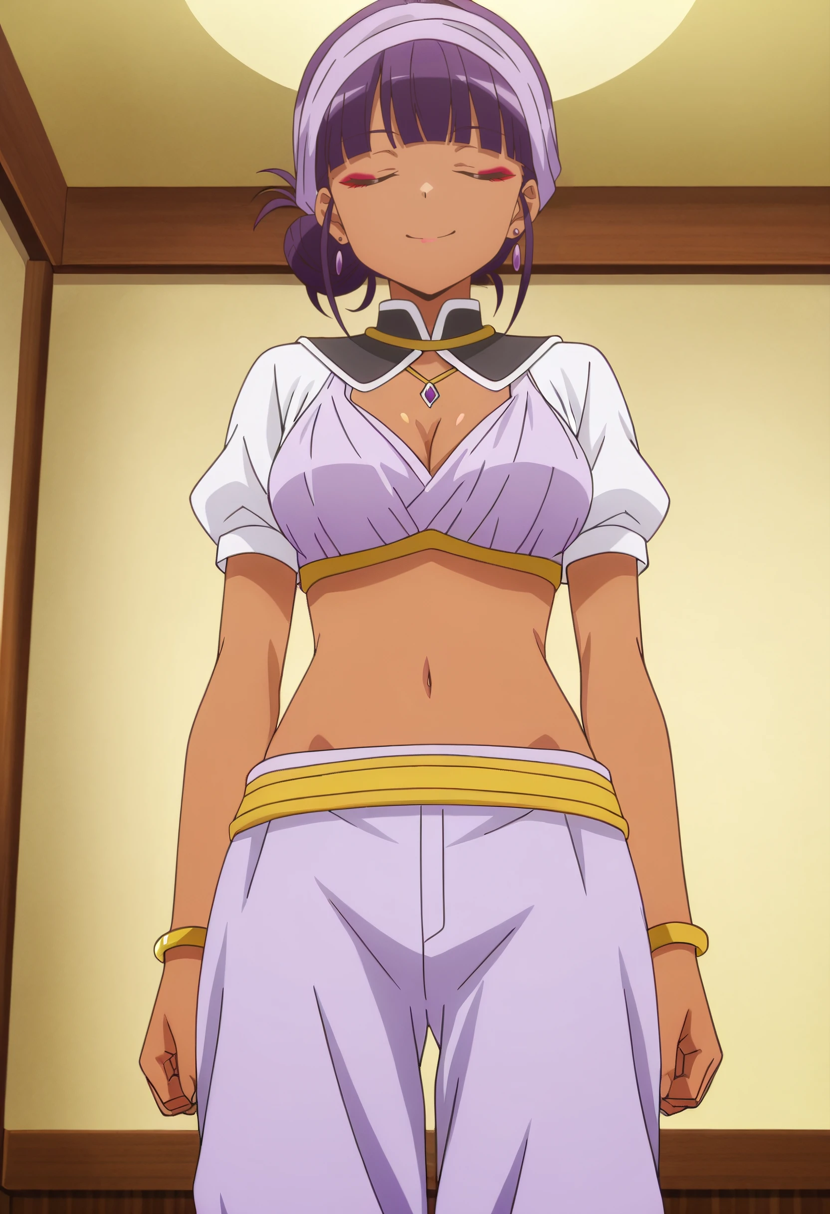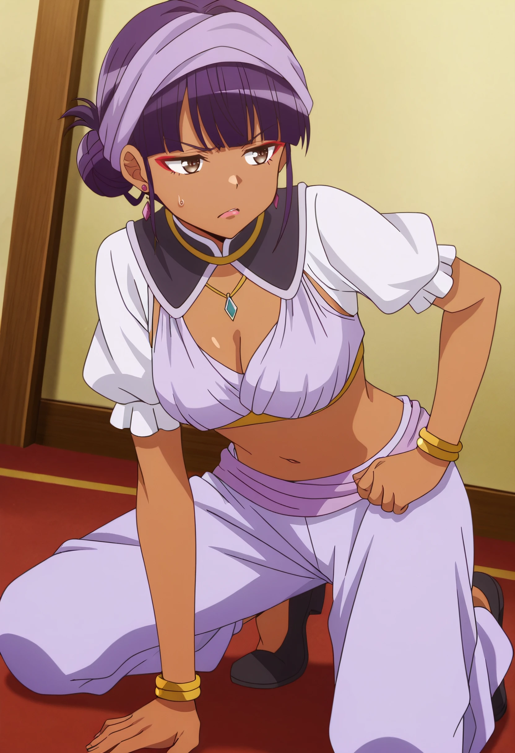 MerchantOutfit, jewelry, bandana, pants, short sleeves, purple pants, cleavage, midriff, earrings, bracelet, crop top, hairband, necklace, headband, puffy pants, puffy sleeves, baggy pants,