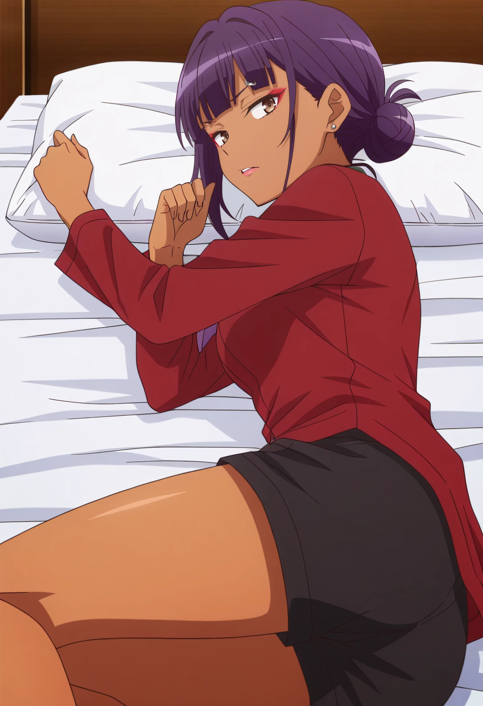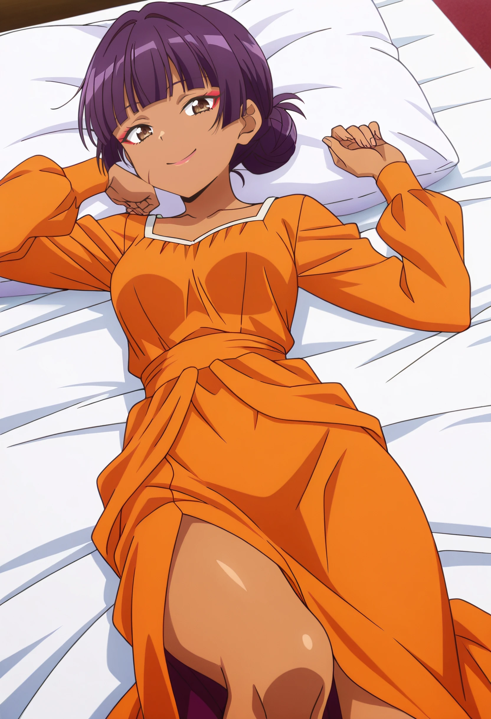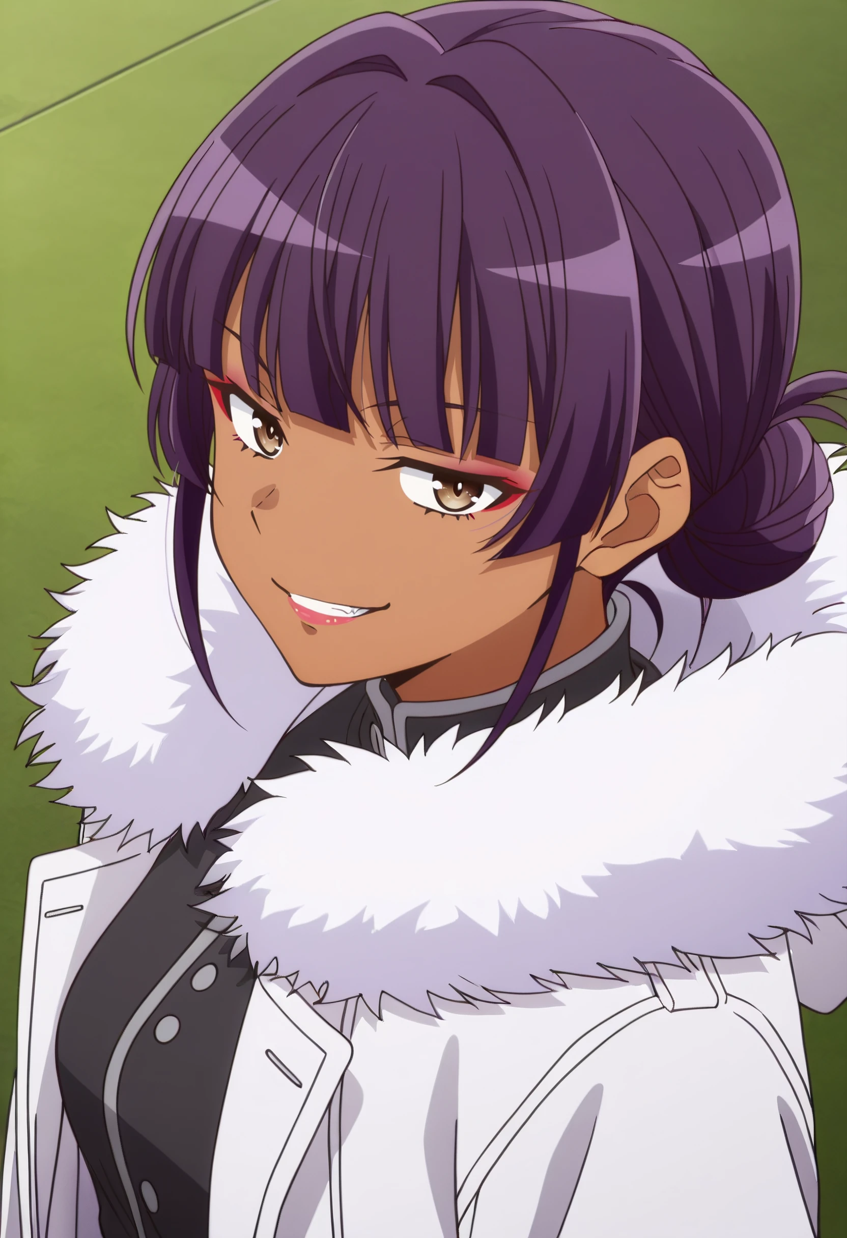 JHNMerchant, purple hair, short hair, blunt bangs, single hair bun, hair bun, brown eyes, dark-skinned female, dark skin, makeup, eyeshadow, eyeliner,