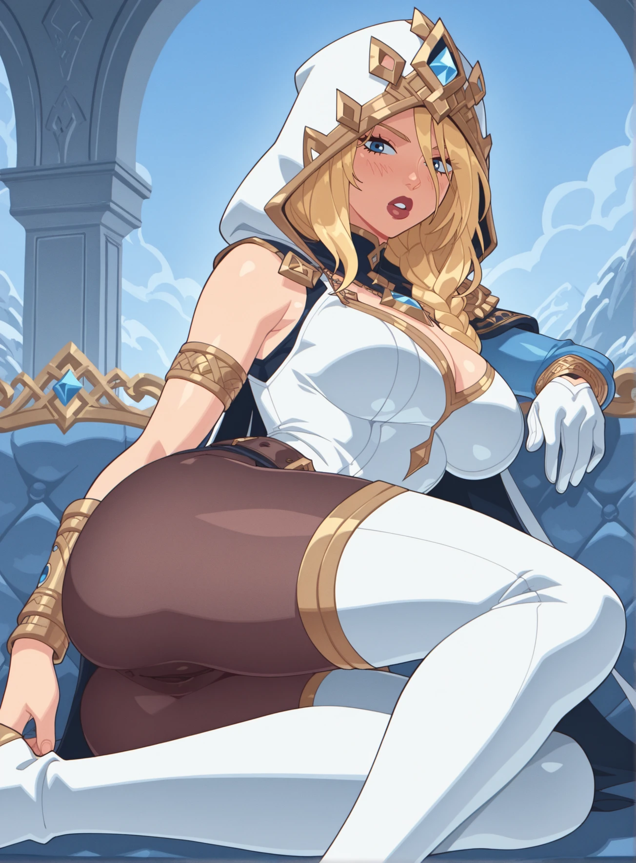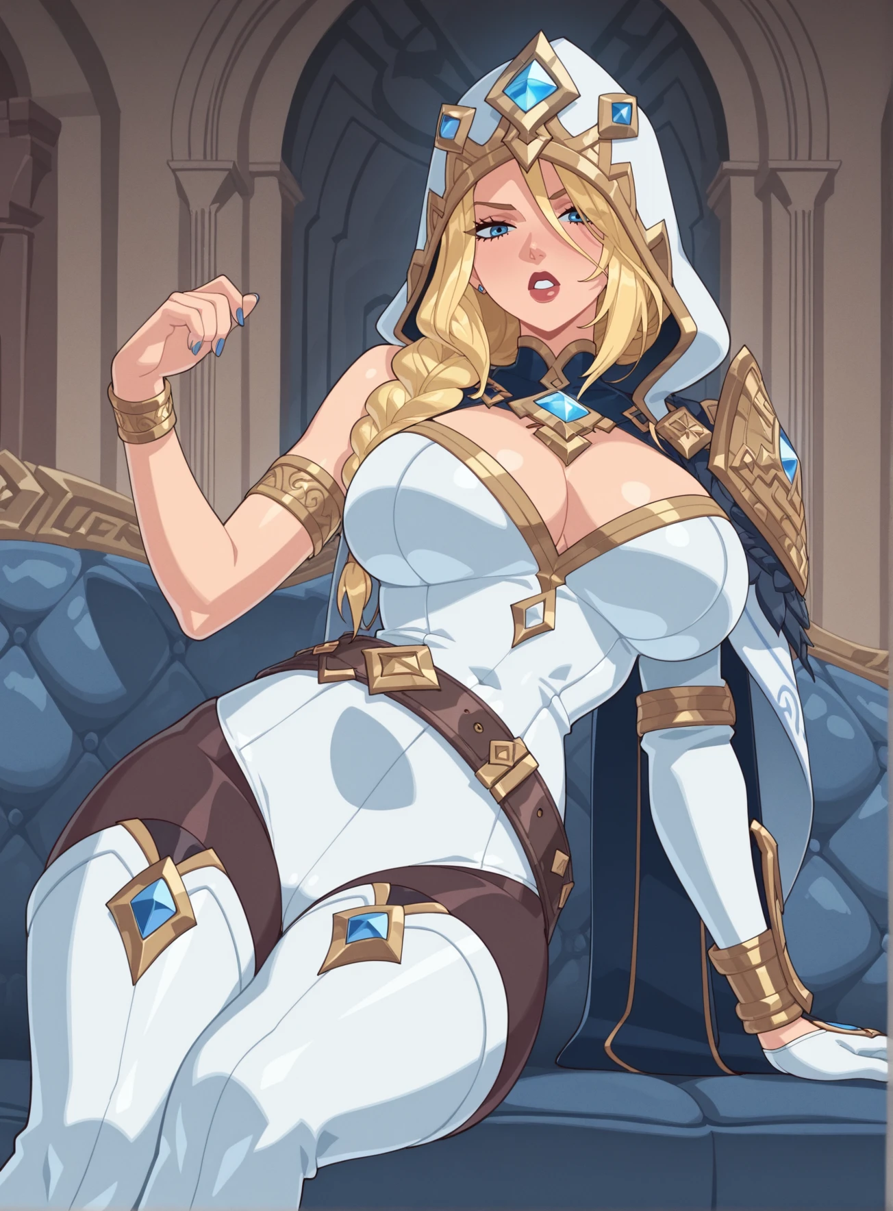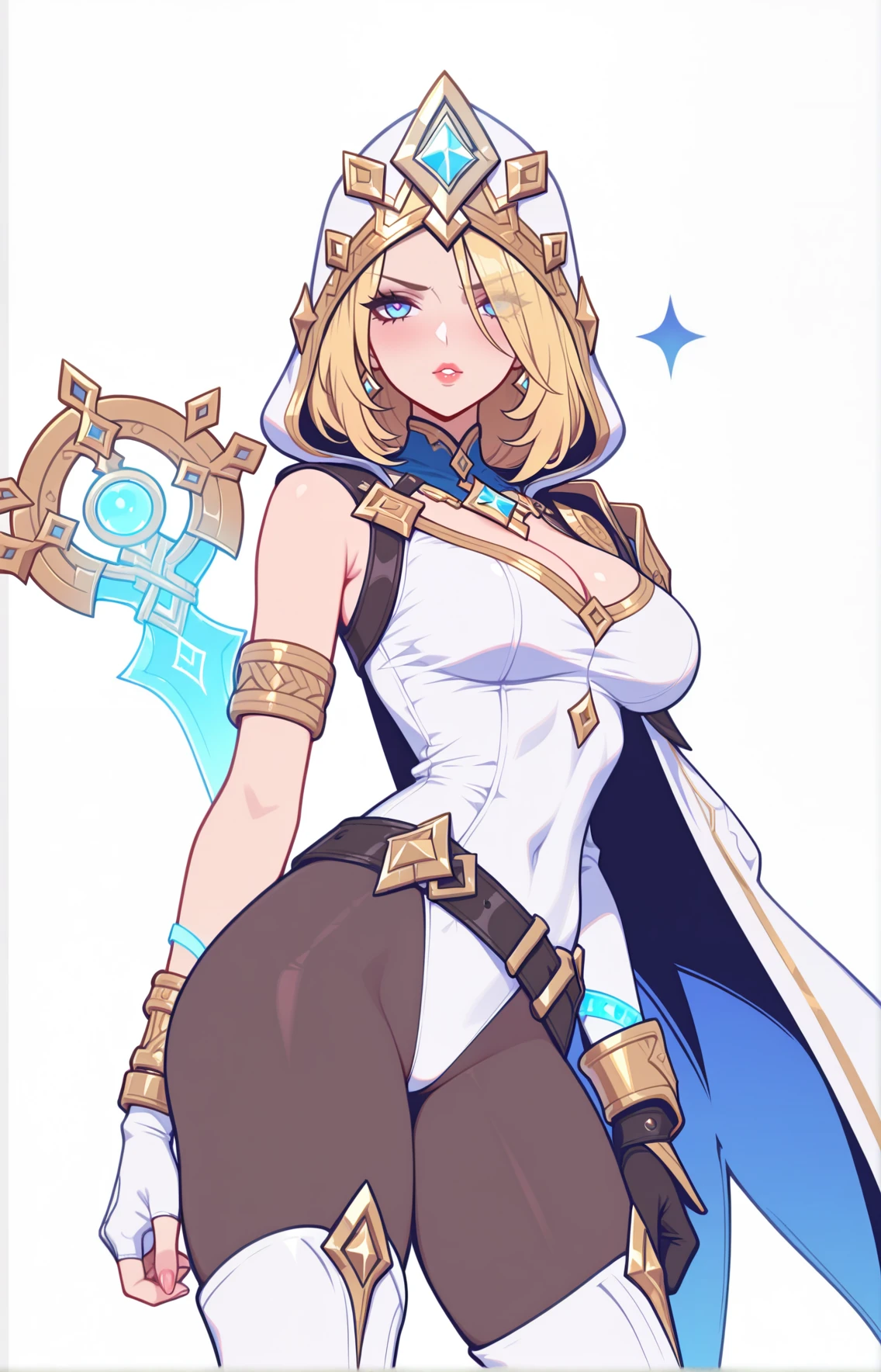 Freljord_Ashe, blonde hair, blue eyes, white hooded cloak, gold trim, golden crown, white and gold bodysuit, single sleeve, golden arm guards, black pantyhose, white gloves, gold bracelets, blue tattos, white thigh-high boots,