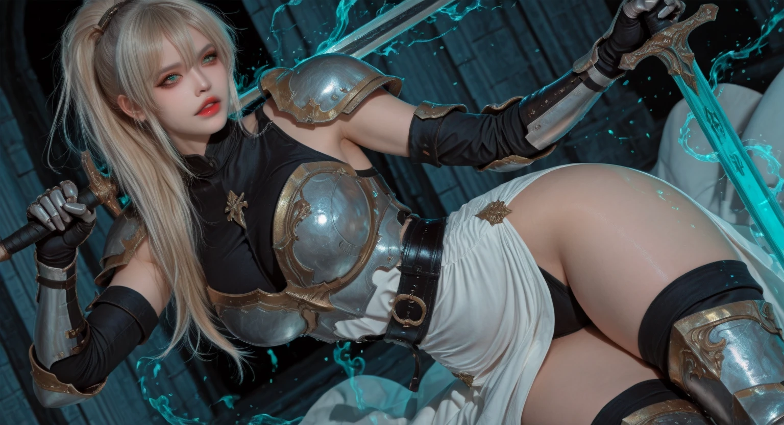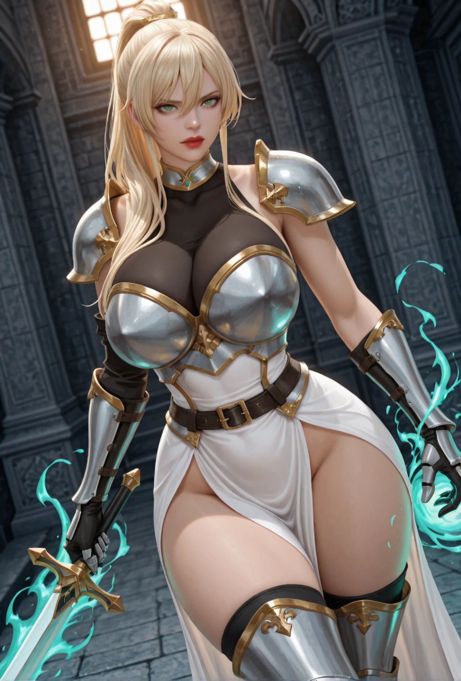 armor, breastplate, gold_trim, white_dress, sleeveless_dress, black body suit, high_slit, black_thighhighs, thigh_boots, single_glove, armored_glove, armored_boots, metallic_armor, pauldrons, waist_belt, paladin, battle_dress, heels boots
