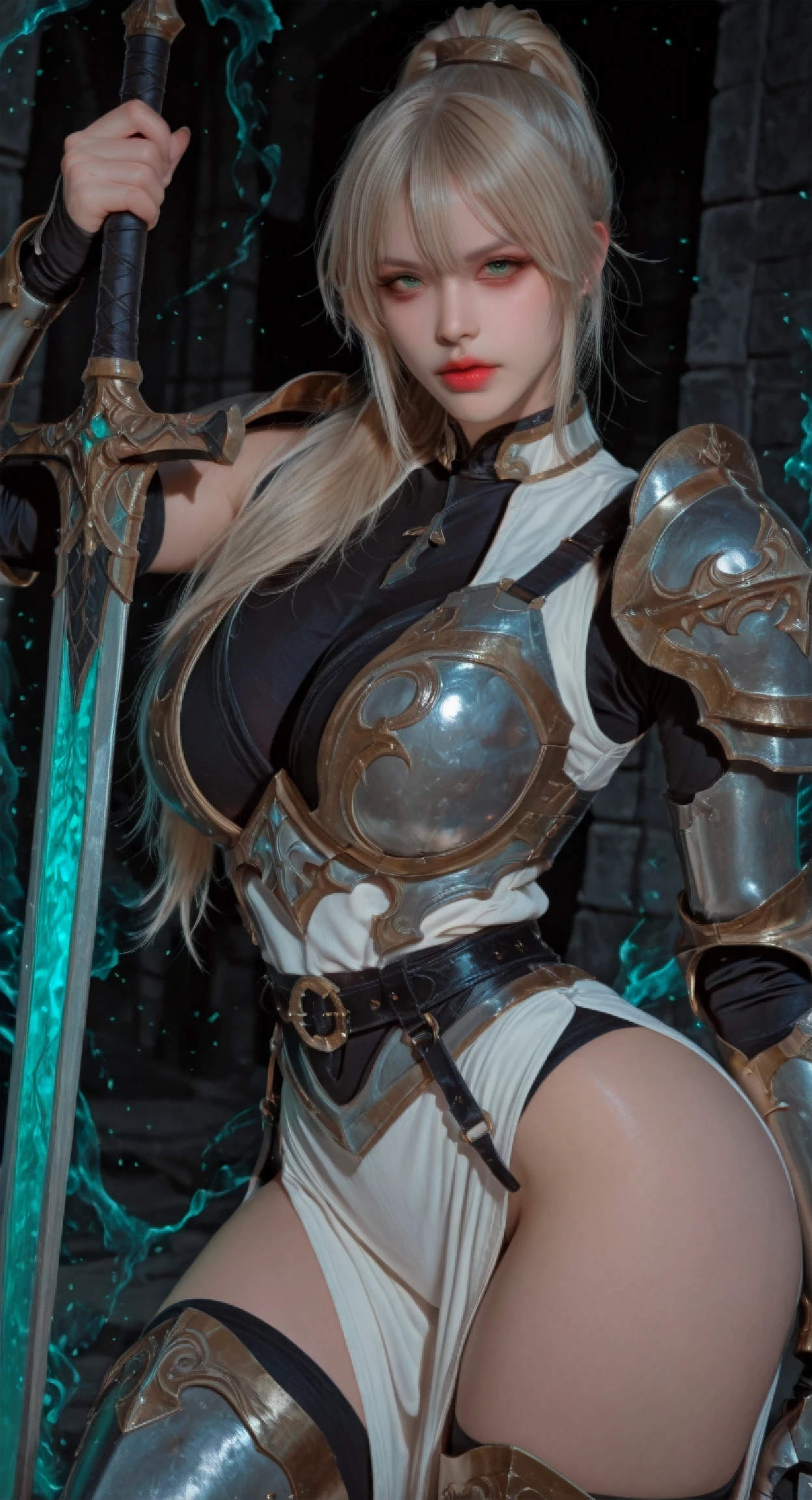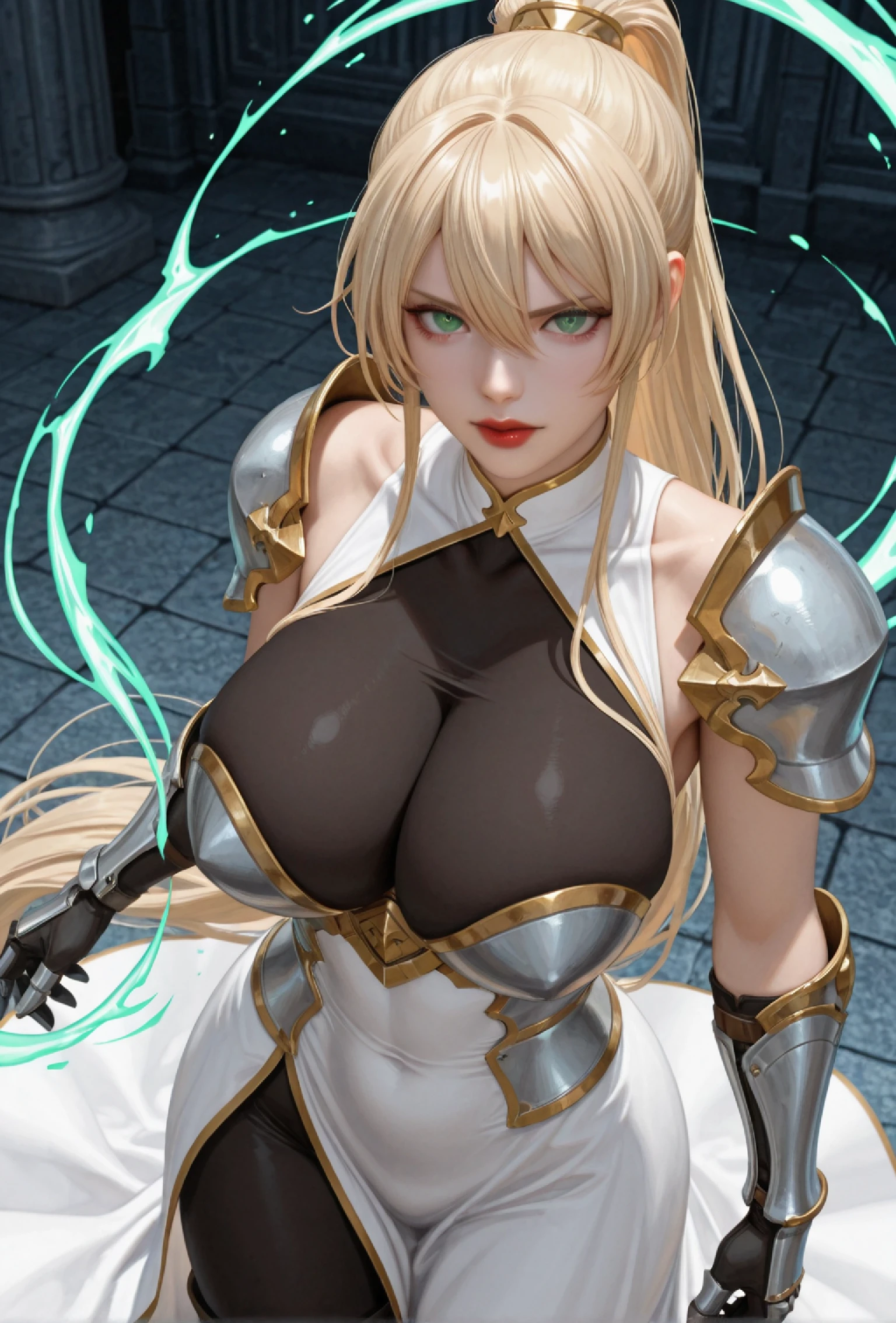 1girl, solo, Seikishi, absurdly_long_hair, blonde_hair, ponytail, hair_between_eyes, green_eyes, sharp_eyes, red lipstick, huge breasts, collarbone, narrow waist, wide hips, thick thighs, round bubble ass,