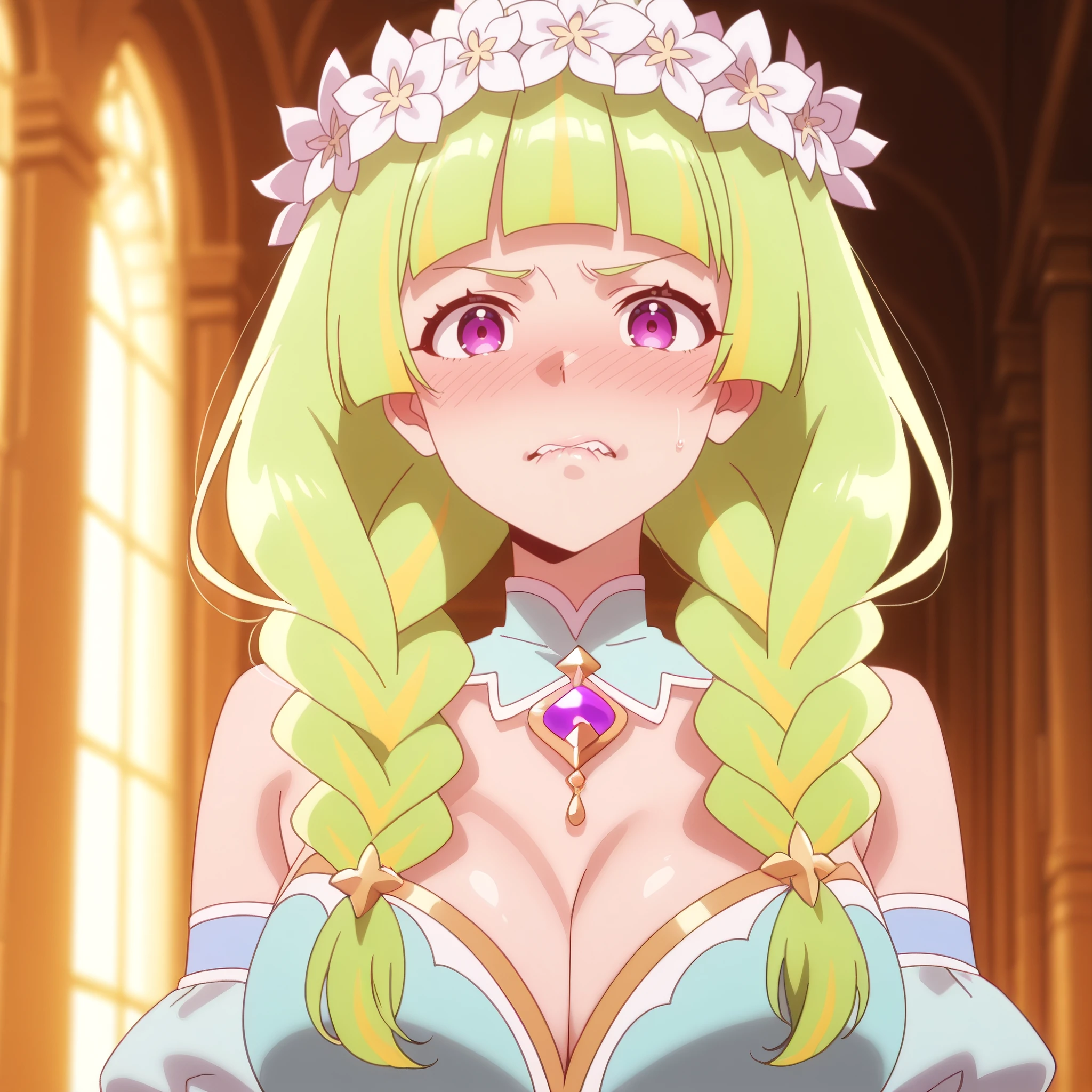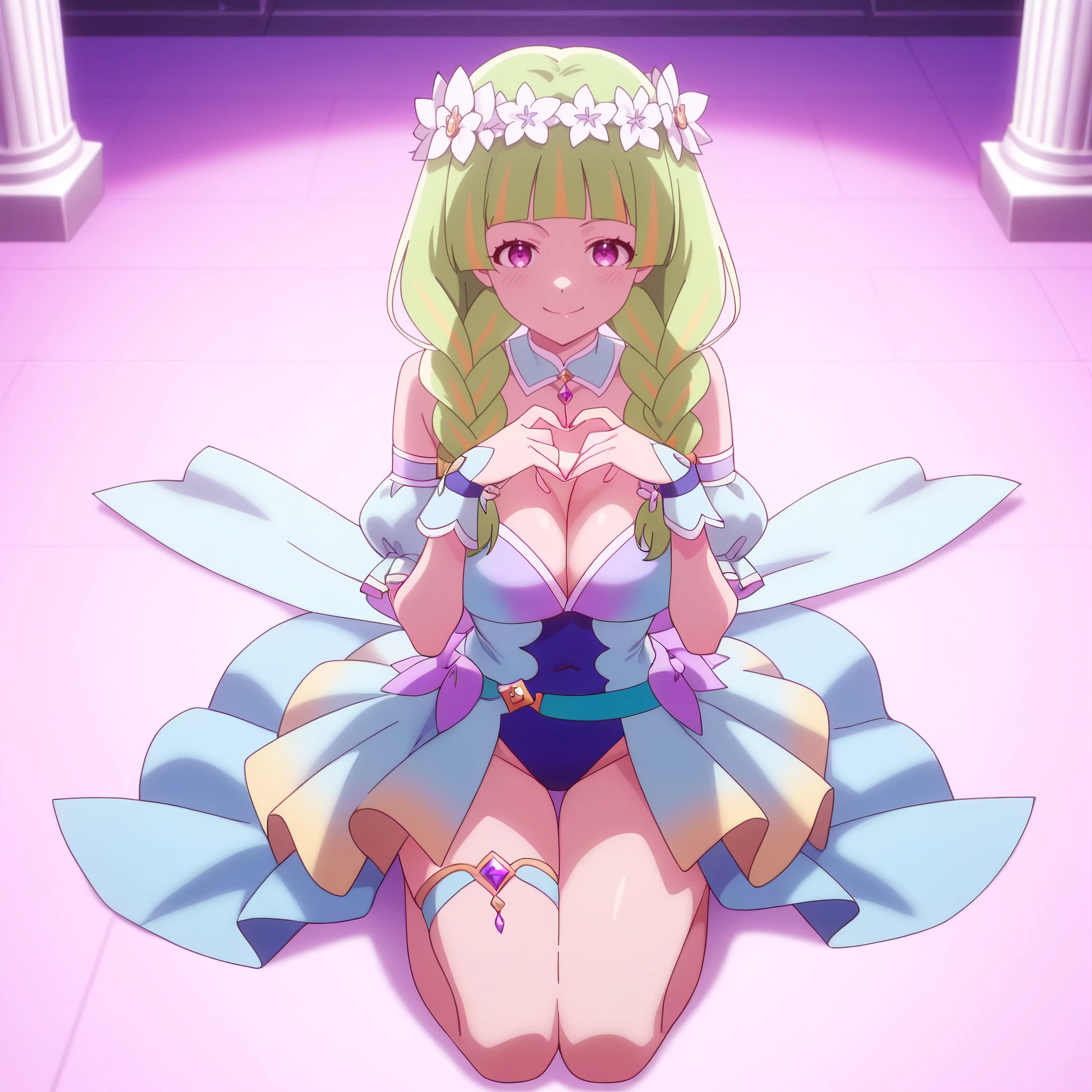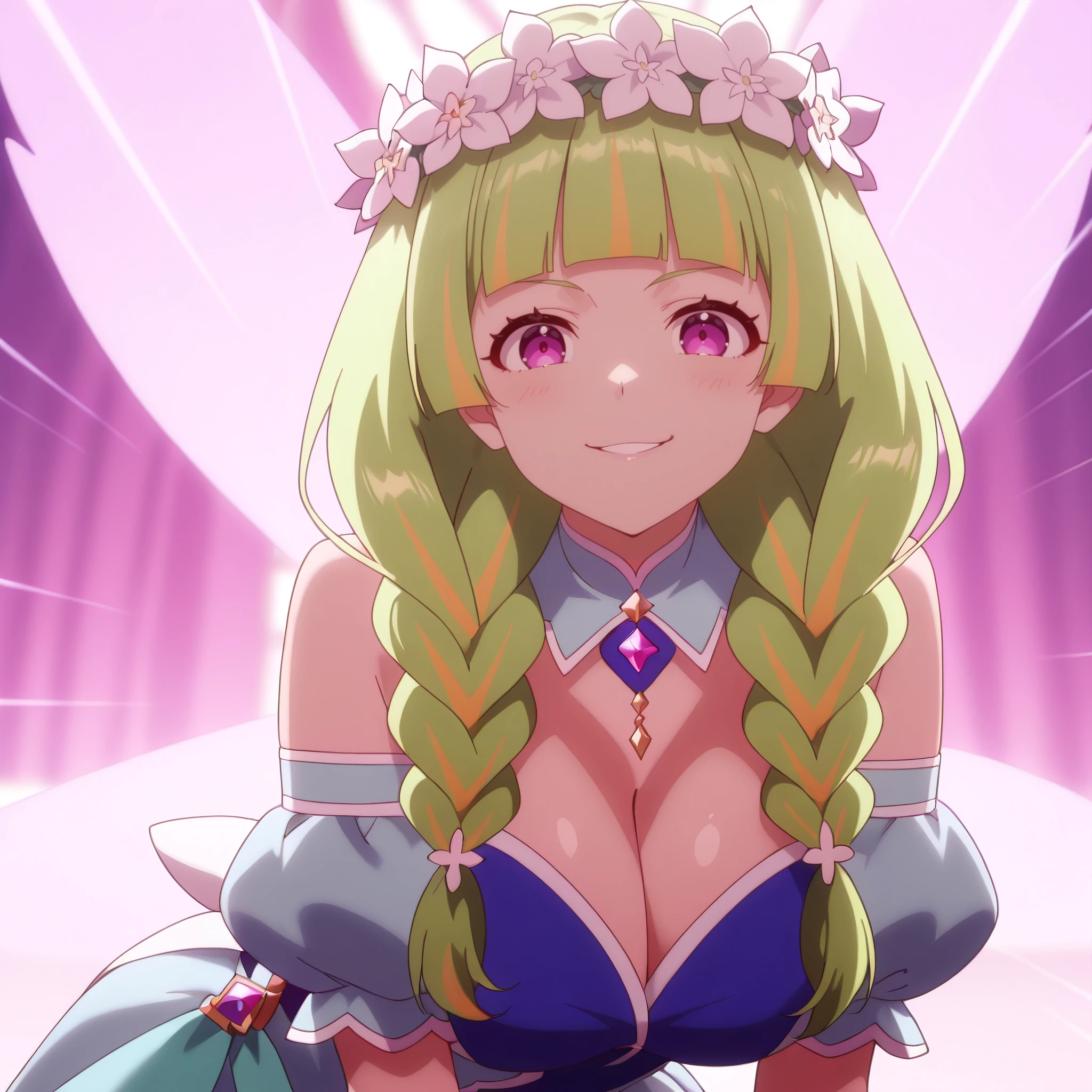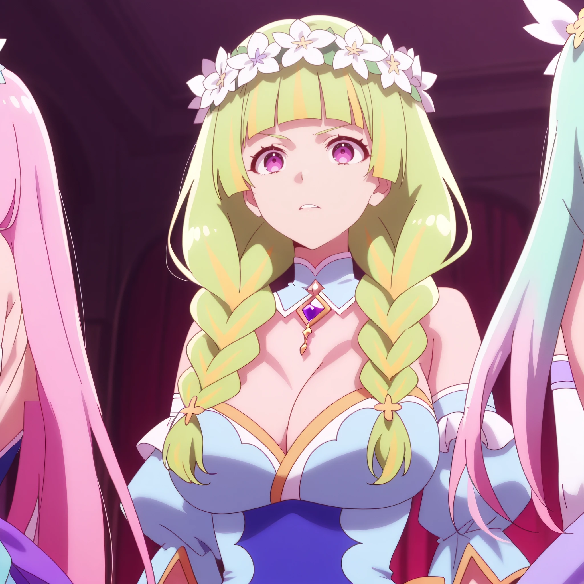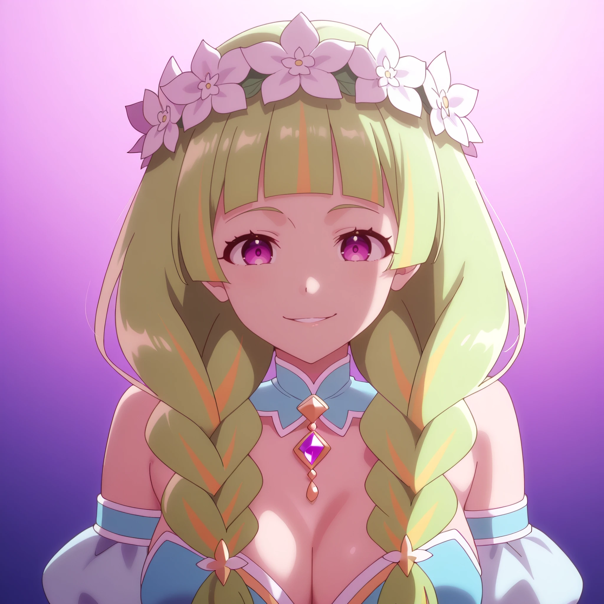 HanaboshiFruitmaster, purple eyes, green hair, long hair, multicolored hair, twin braids, blunt bangs, streaked hair, hair ornament,