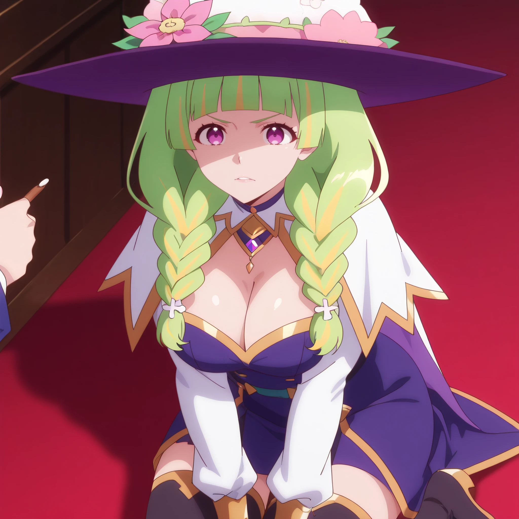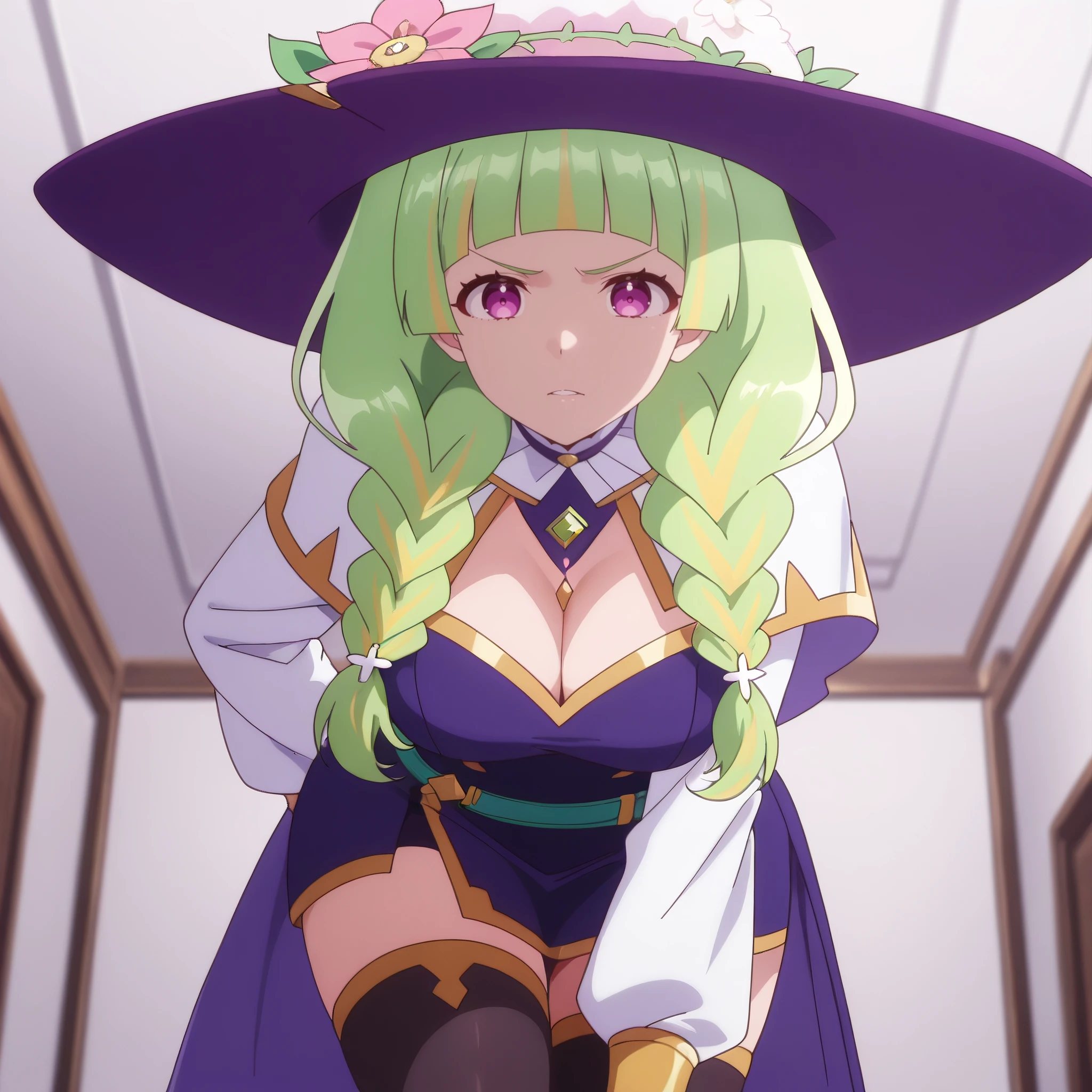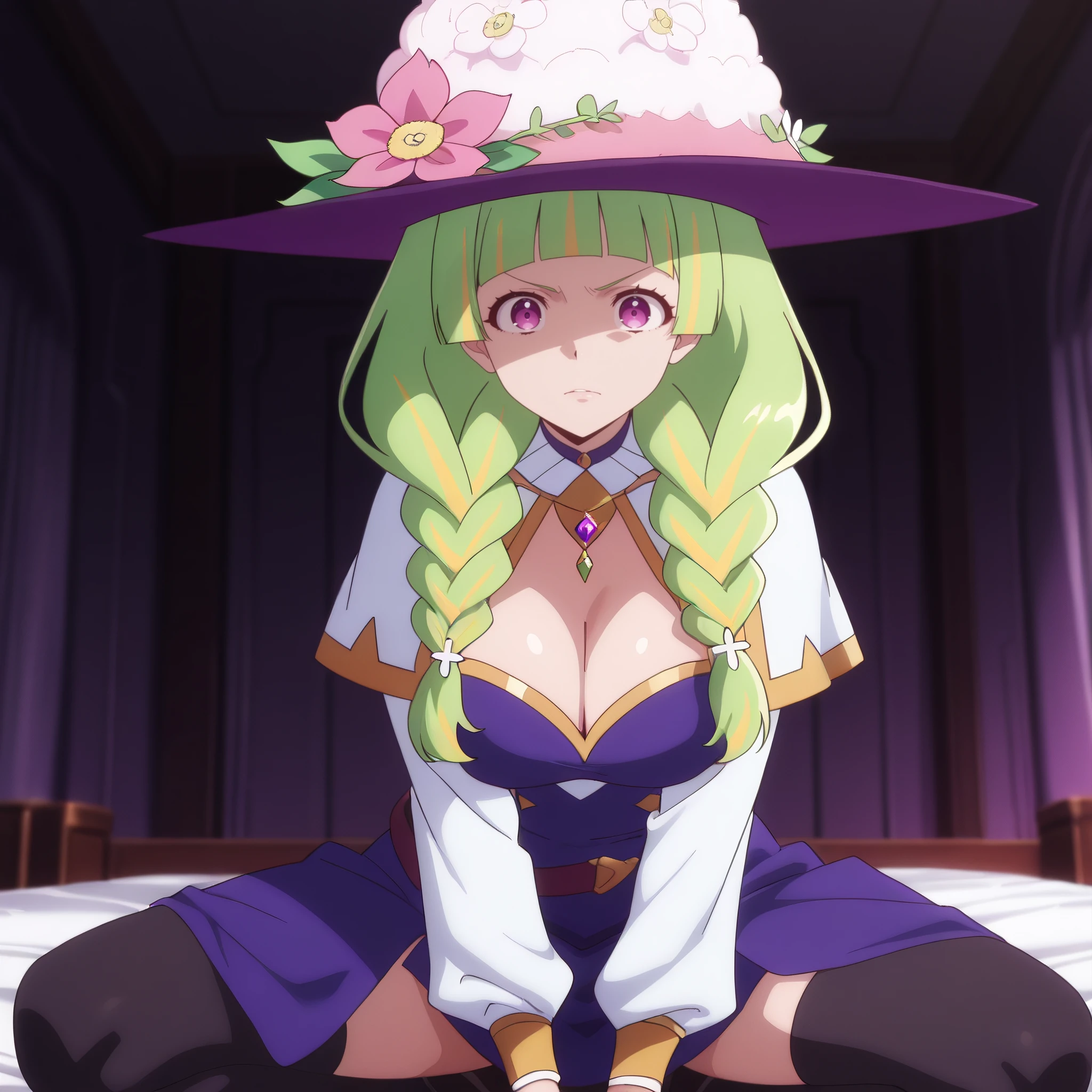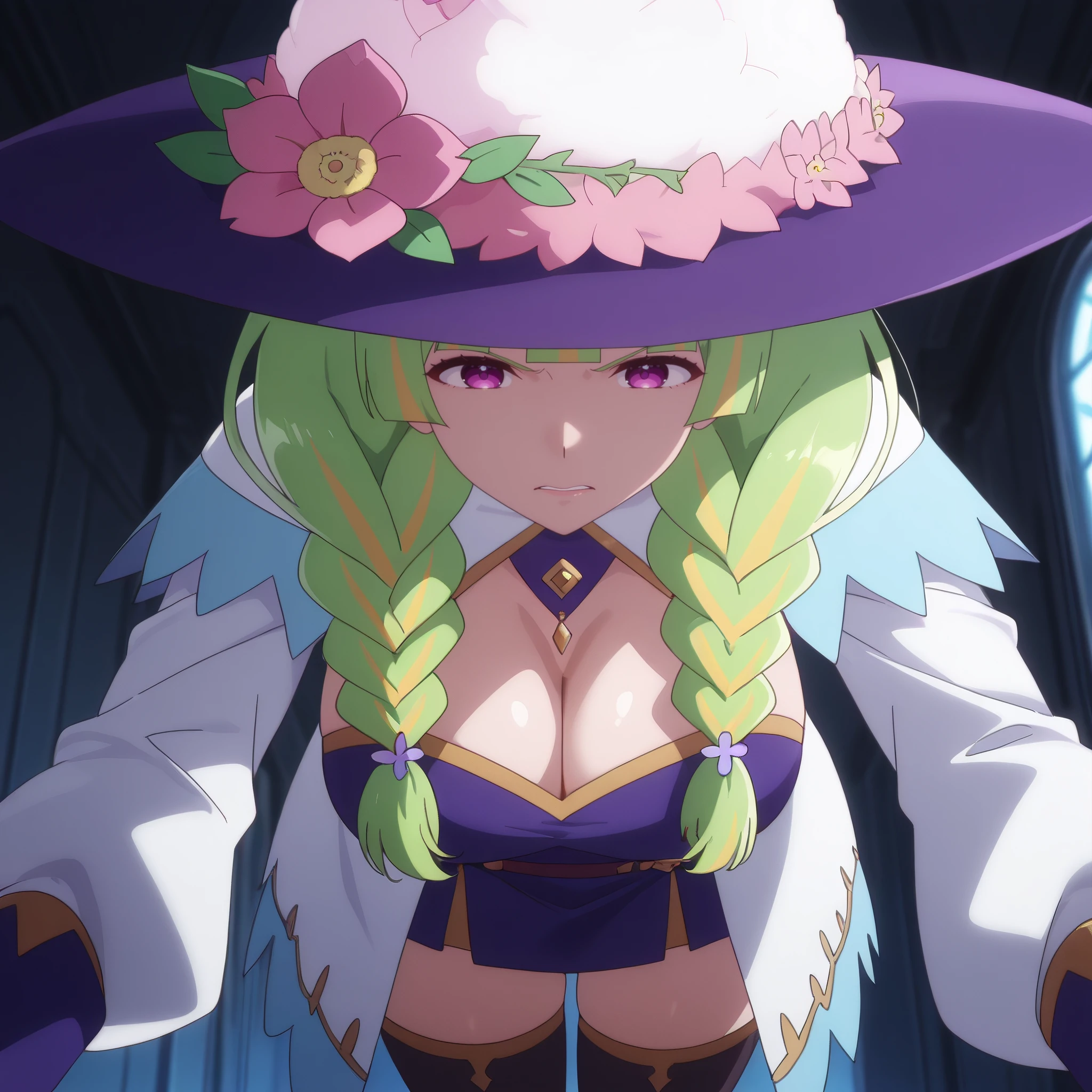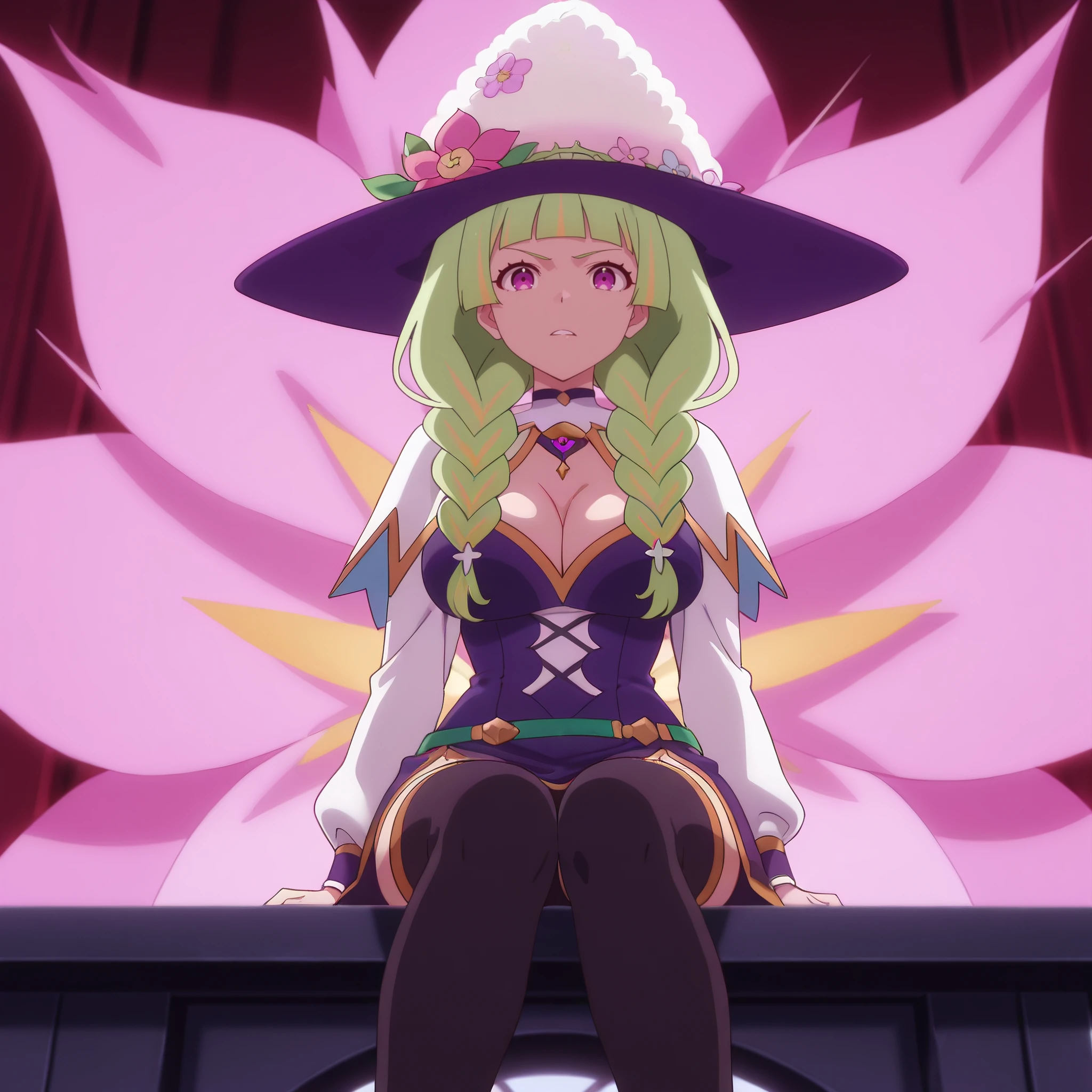 witch hat, white hat top, white hat dome, large flower accessory, dark blue brim, hat flower, pink flower, purple headwear, dress, long sleeves, cleavage, black thighhighs,
