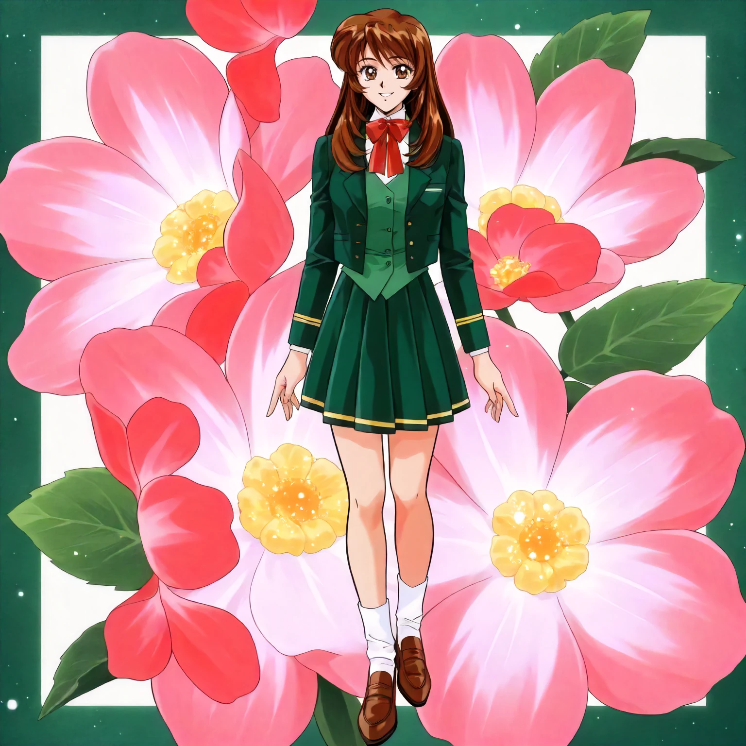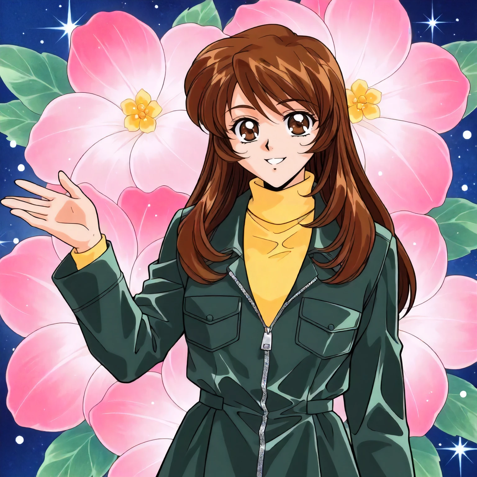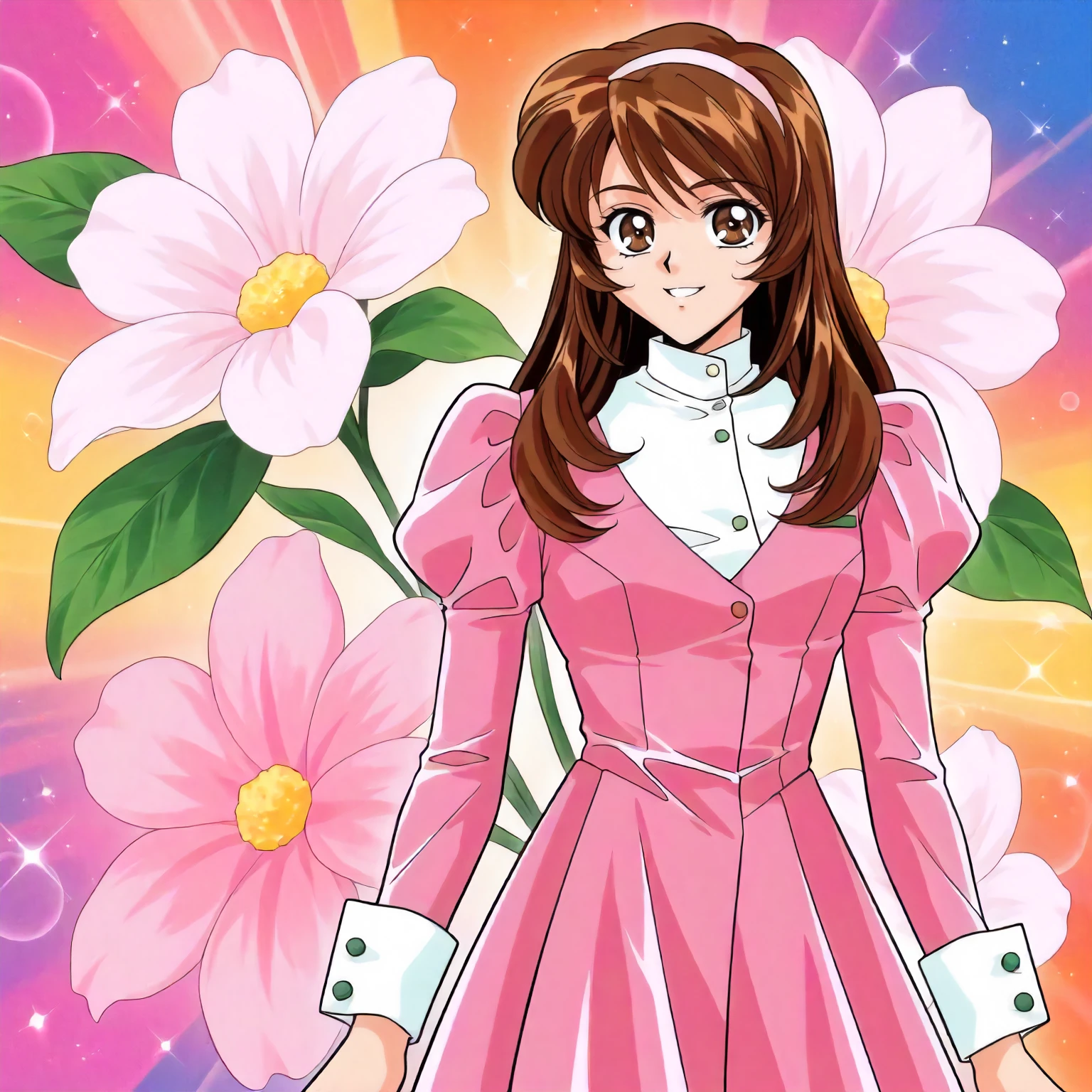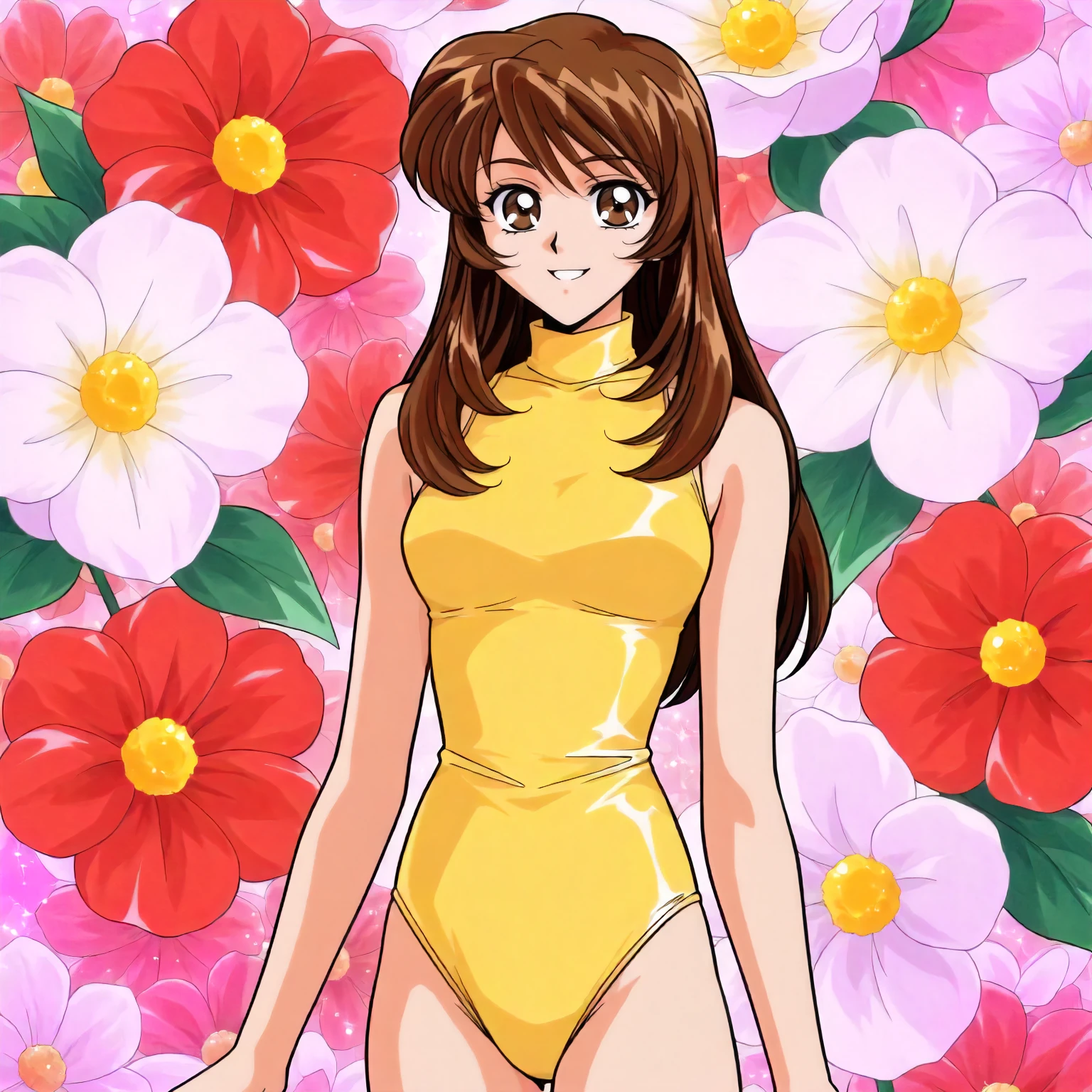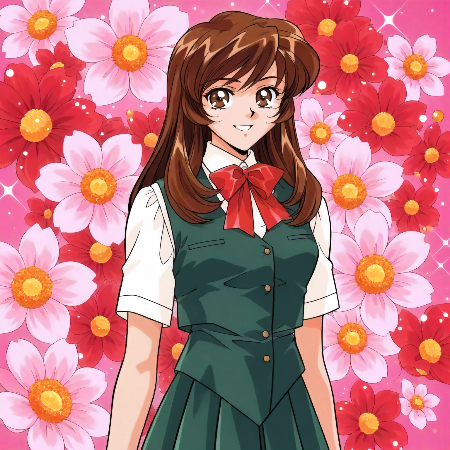 anime coloring,retro artstyle,1990s \(style\), agano_nao\(yuuwaku_office_renai-ka\),1girl,brown hair,long hair,brown eyes,