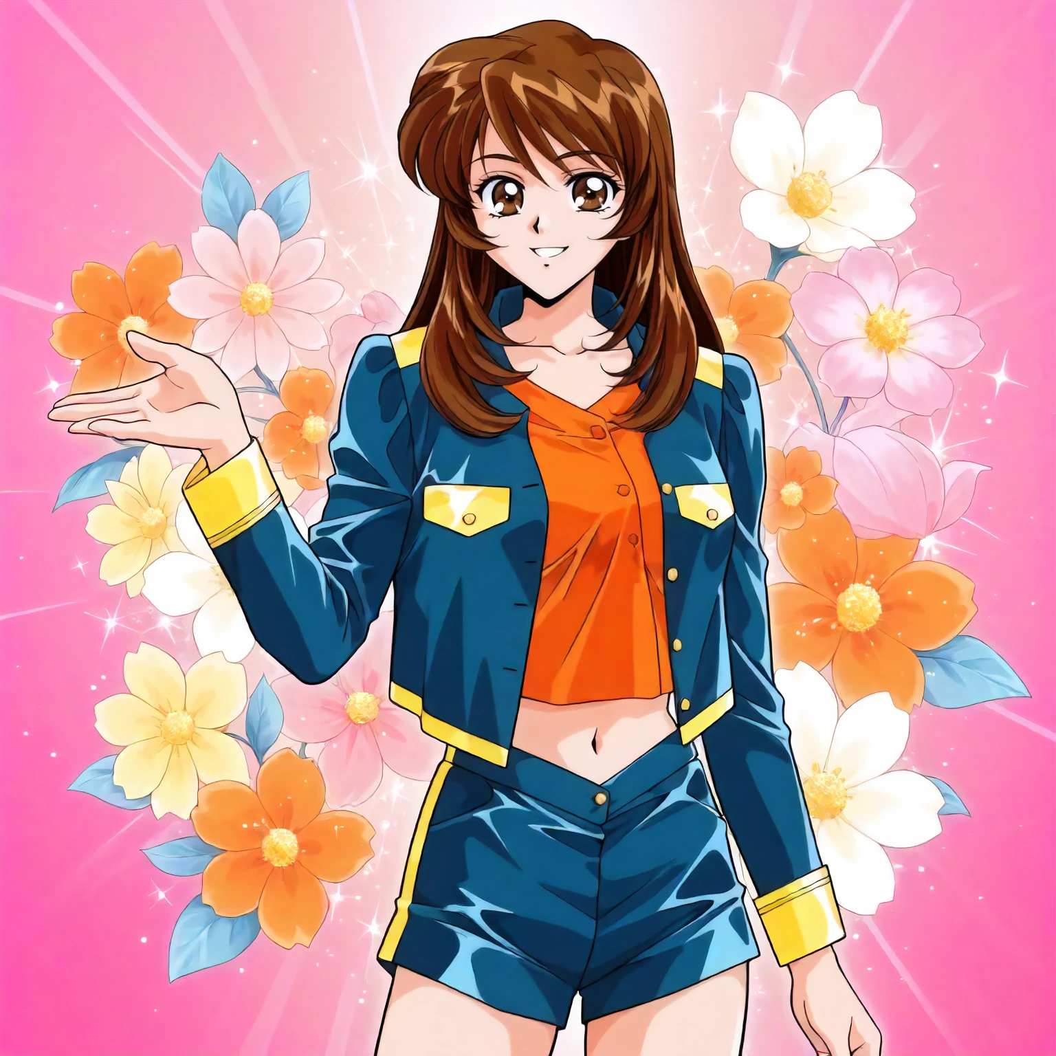 blue jacket,yellow trim jacket,orange shirt,no collar, navel,blue shorts,