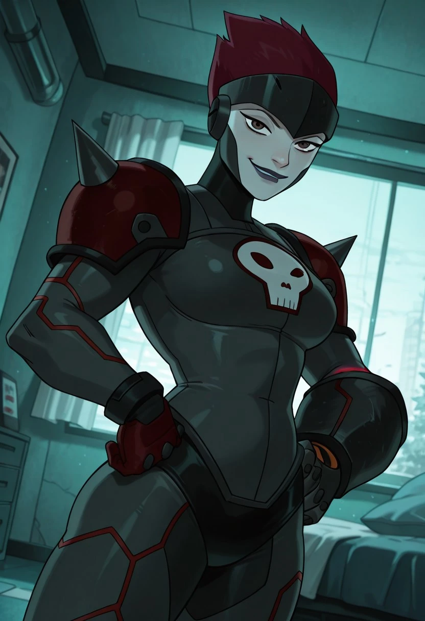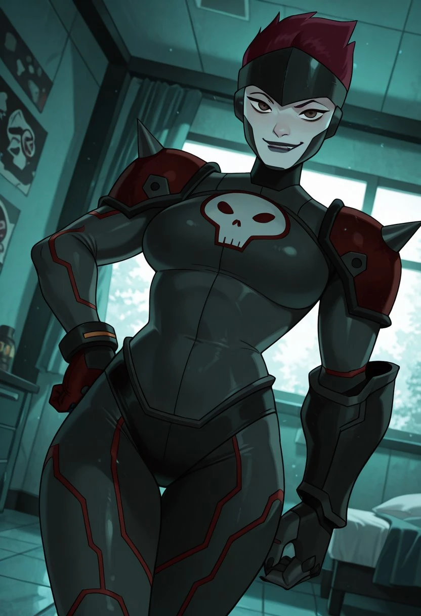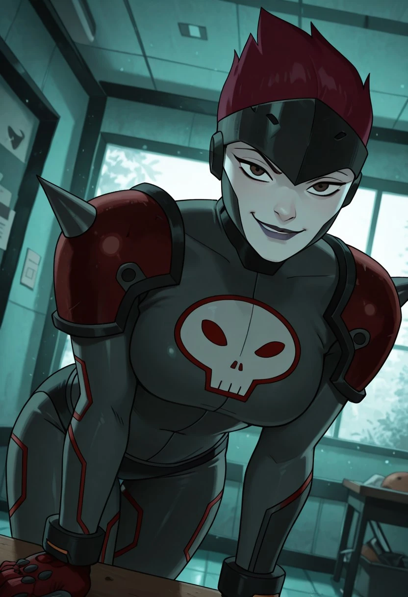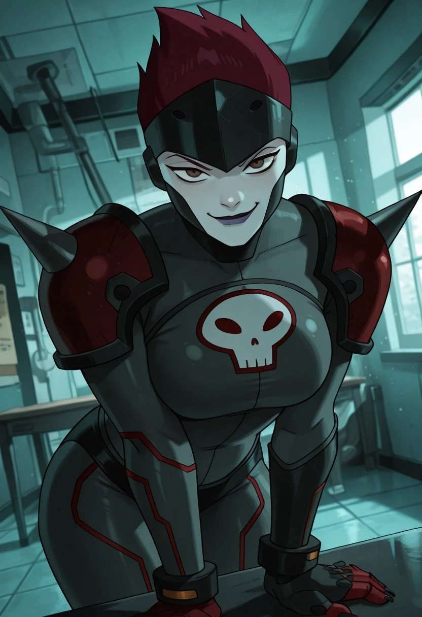 benrojo ,1girl , red hair , brown eyes , pale skin, purple lips , helmet, dark-grey , high-neck , red gloves , skull symbol , black buruma , red shoulder armor , shoulder spikes