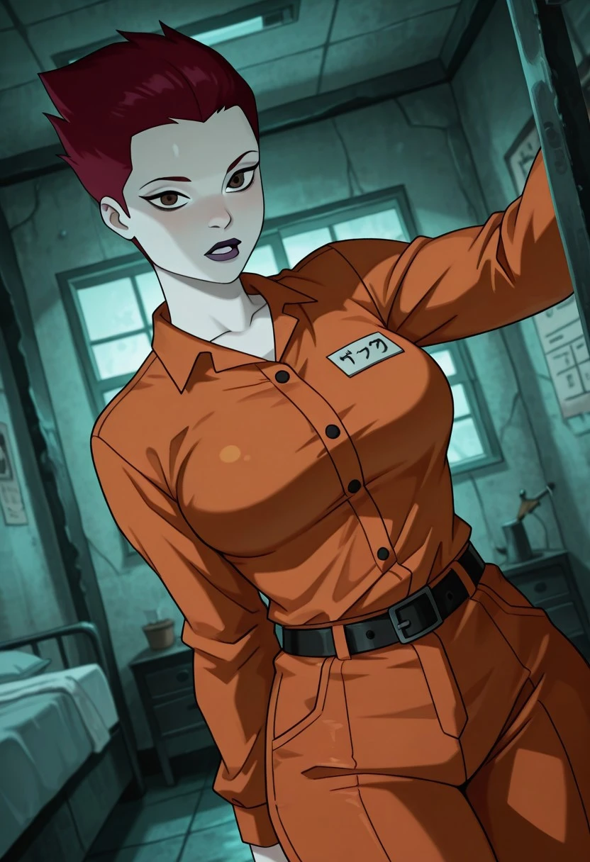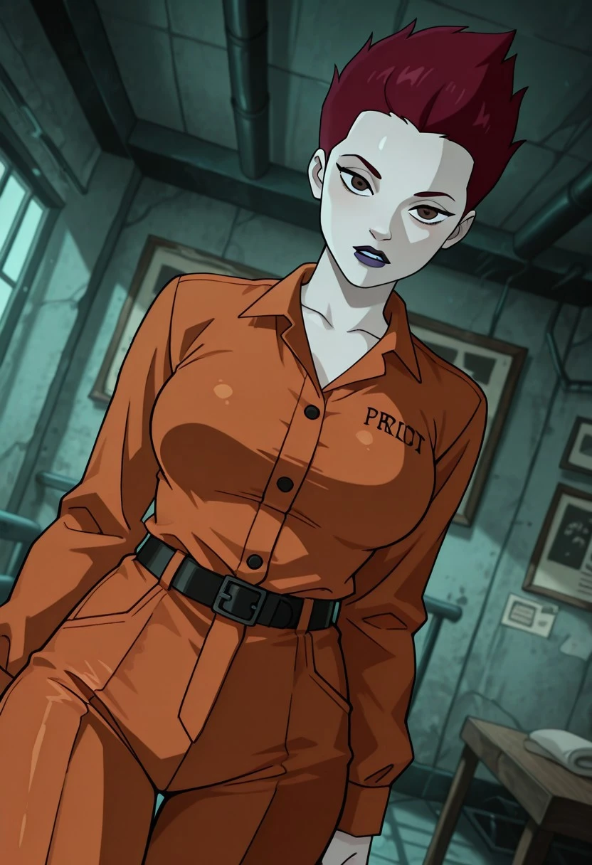 benrojo ,1girl , red hair , brown eyes , pale skin, purple lips , forehead , spikey hair , short hair,
