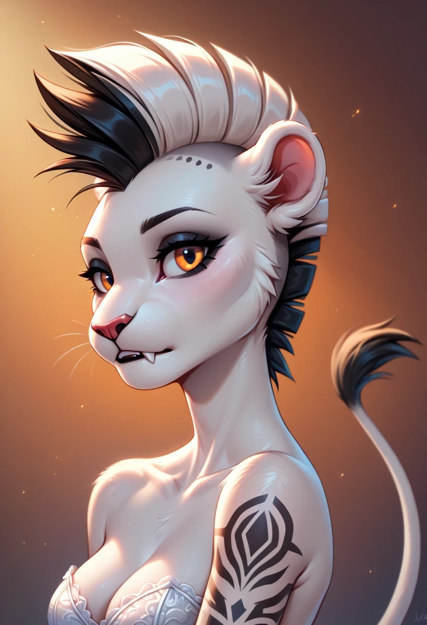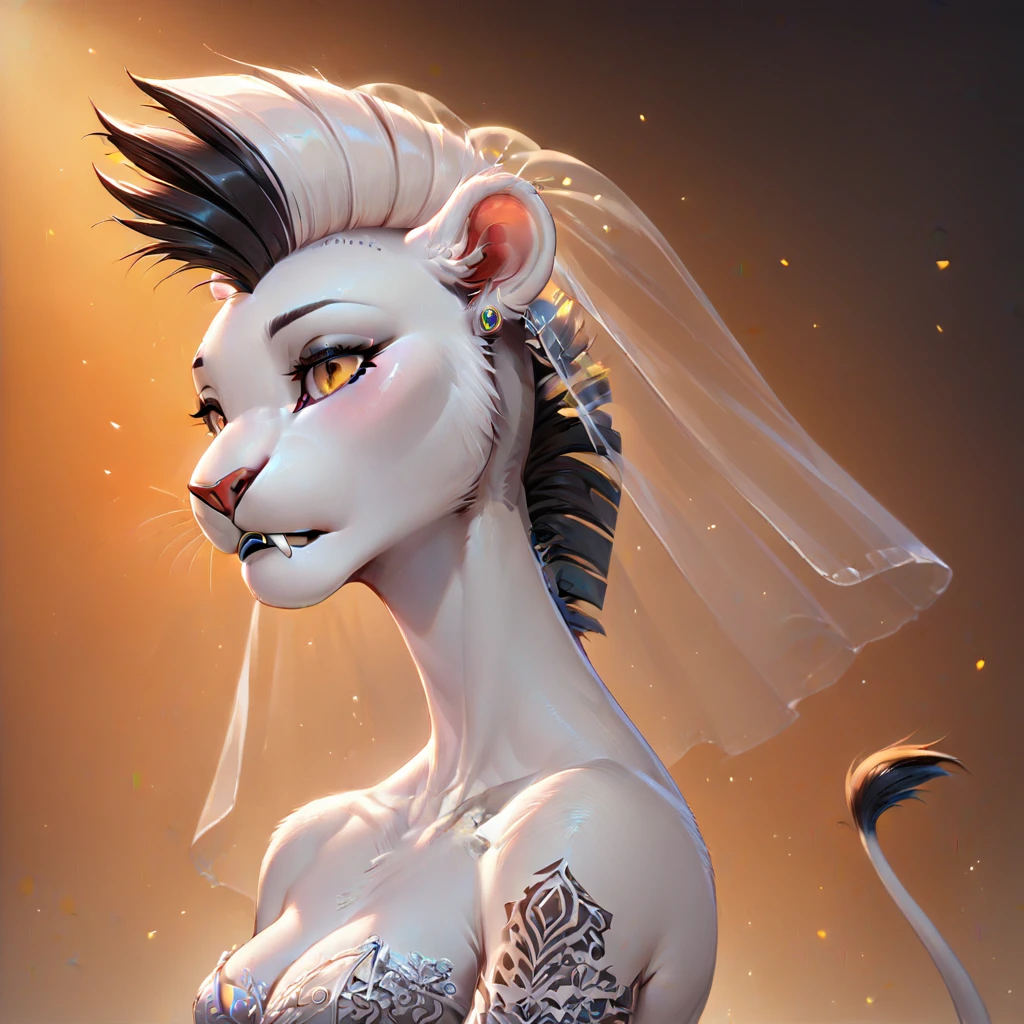 solo , anthro , Zaffa , lioness, Orange gradient eyes, black and white hair , white fur , fluffy fur , detailed fur , black tattoo , eyebrow piercing , ear clip , slim body