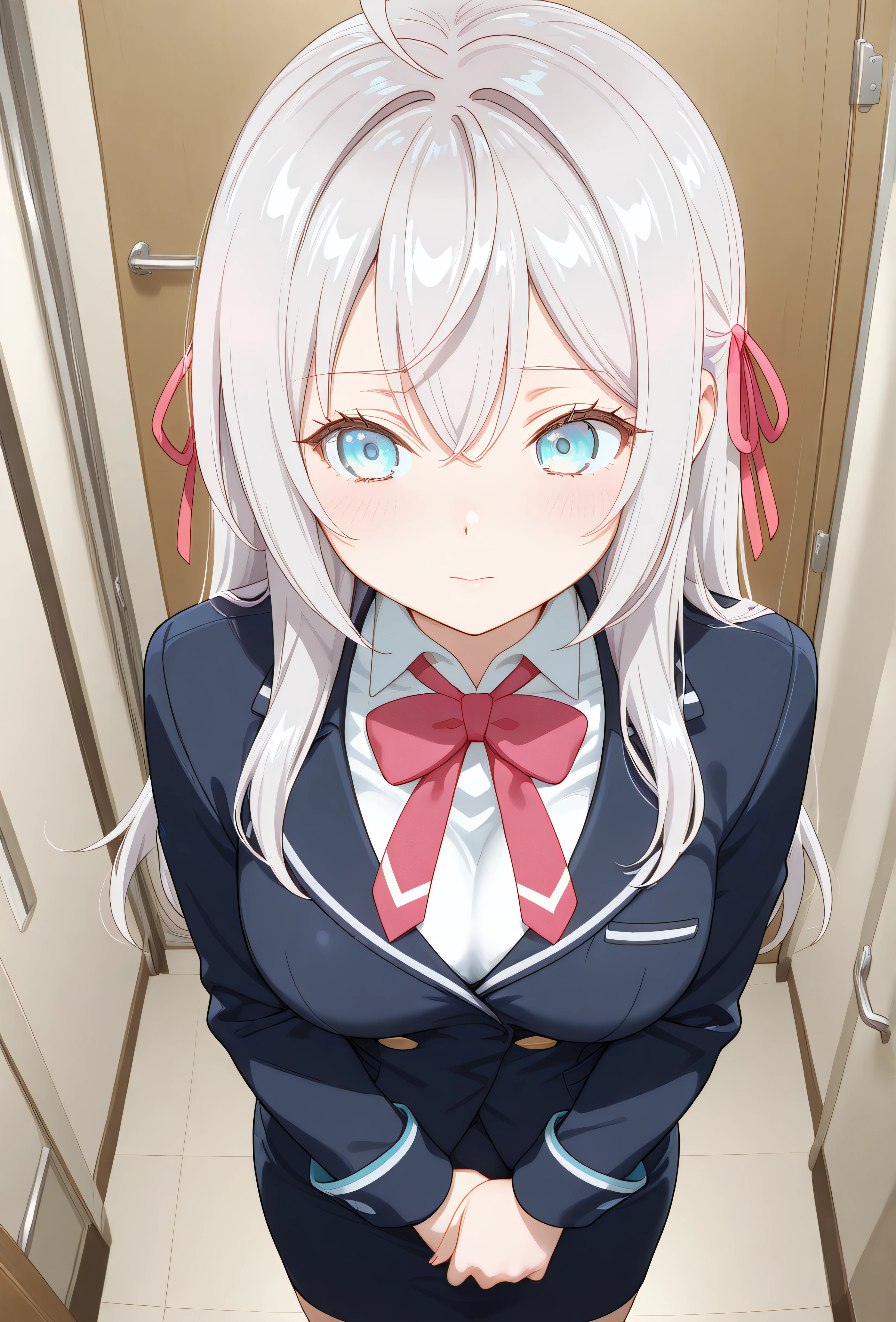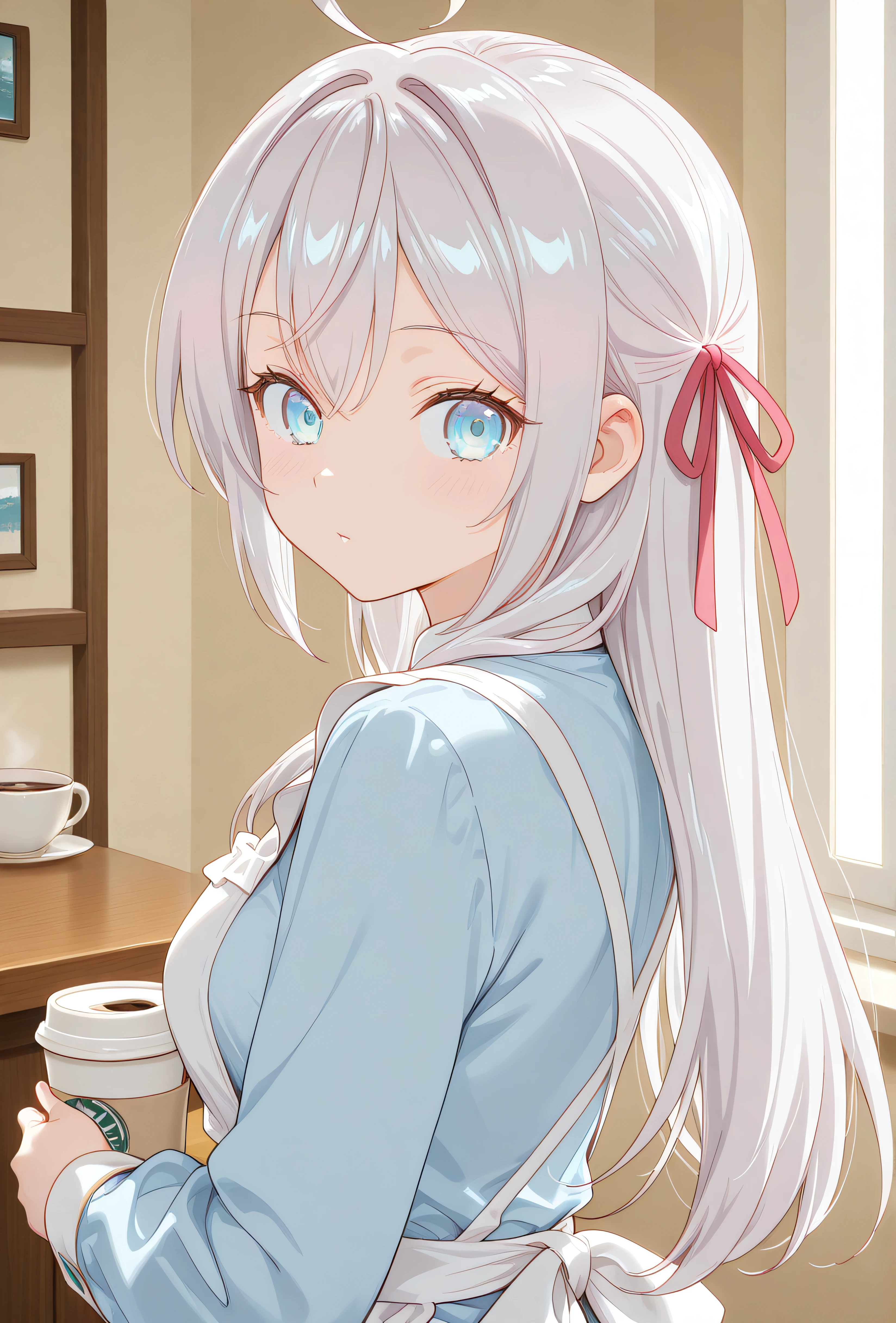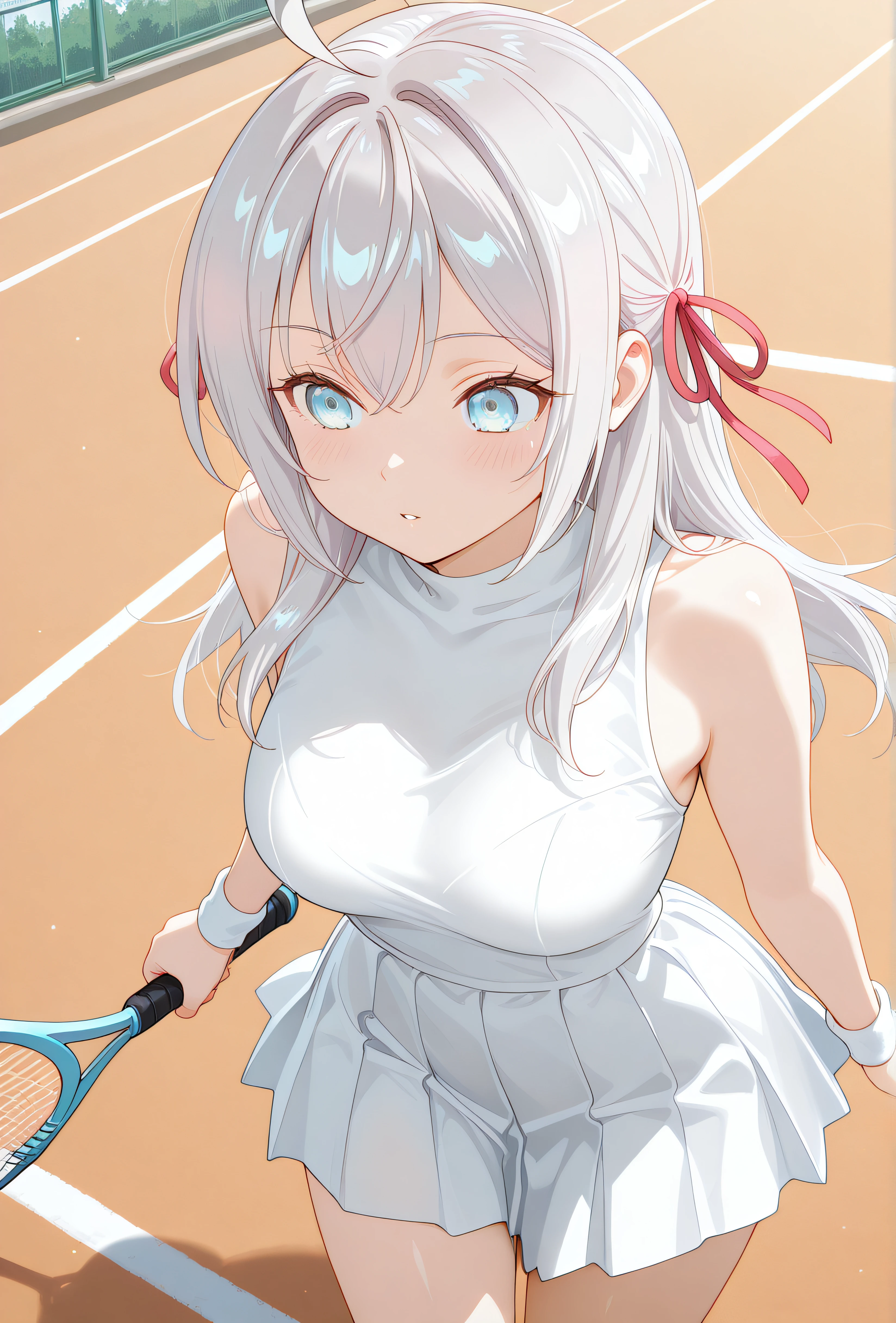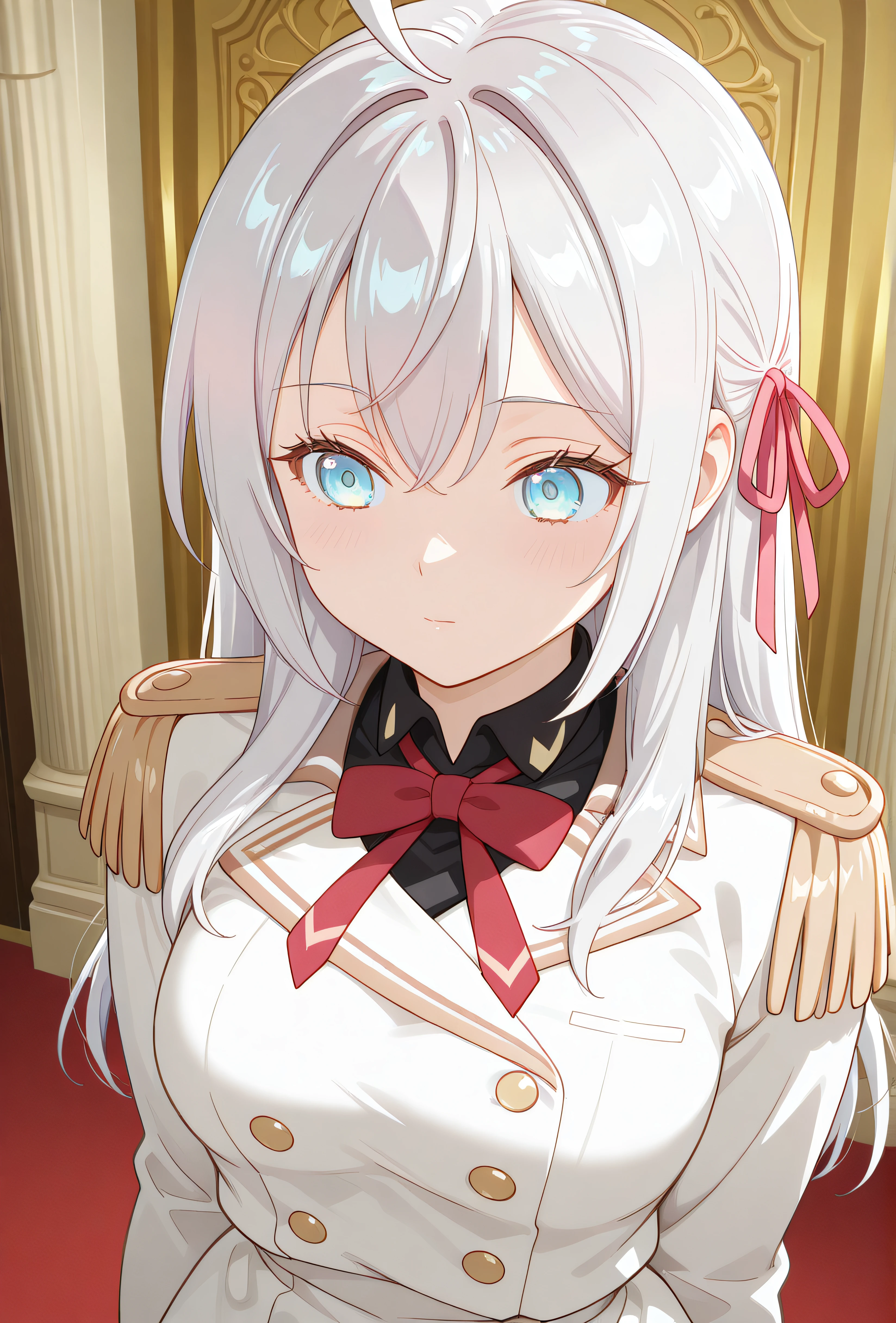 alisa, ribbon, hair ribbon, blue eyes, light blue eyes, aqua eyes, cyan eyes, eye highlight, shiny eyes, beautiful detailed eyes, long eyelashes, long hair, straight hair, white hair, silver hair