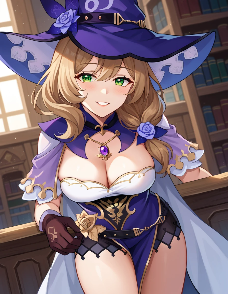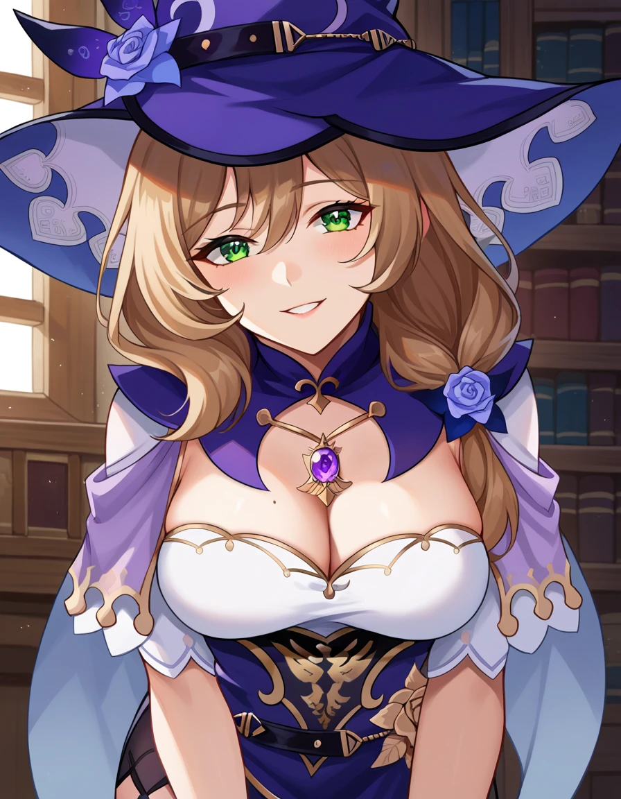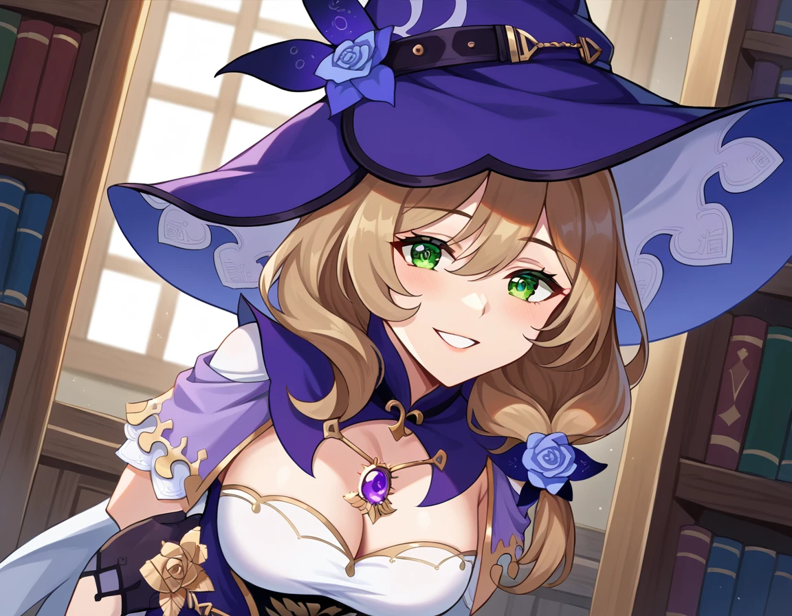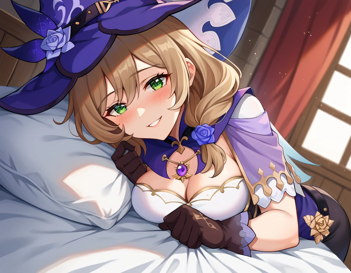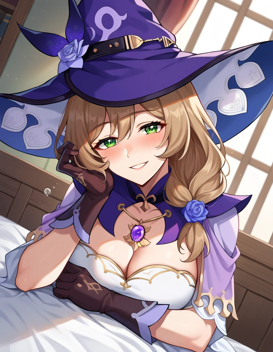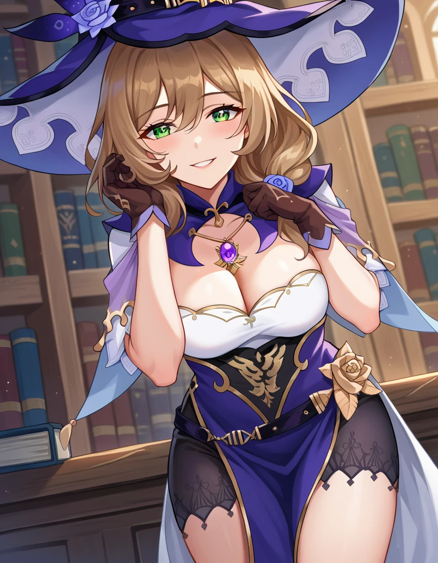 belt, capelet, cleavage, gloves, hat, hat belt, jewelry, necklace, pendant, purple capelet, purple headwear, vision \(genshin impact\), witch, witch hat