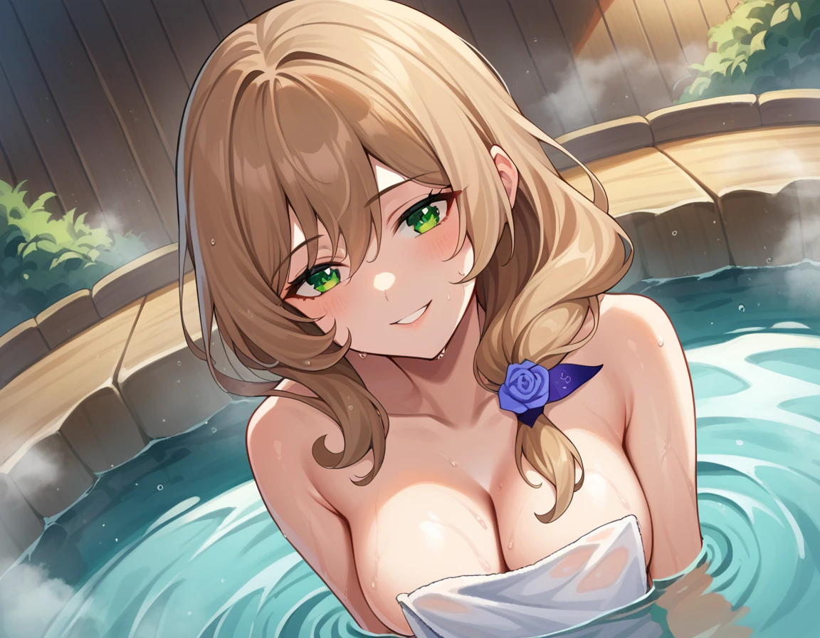 lisa minci, brown hair, green eyes, long hair, low tied hair,