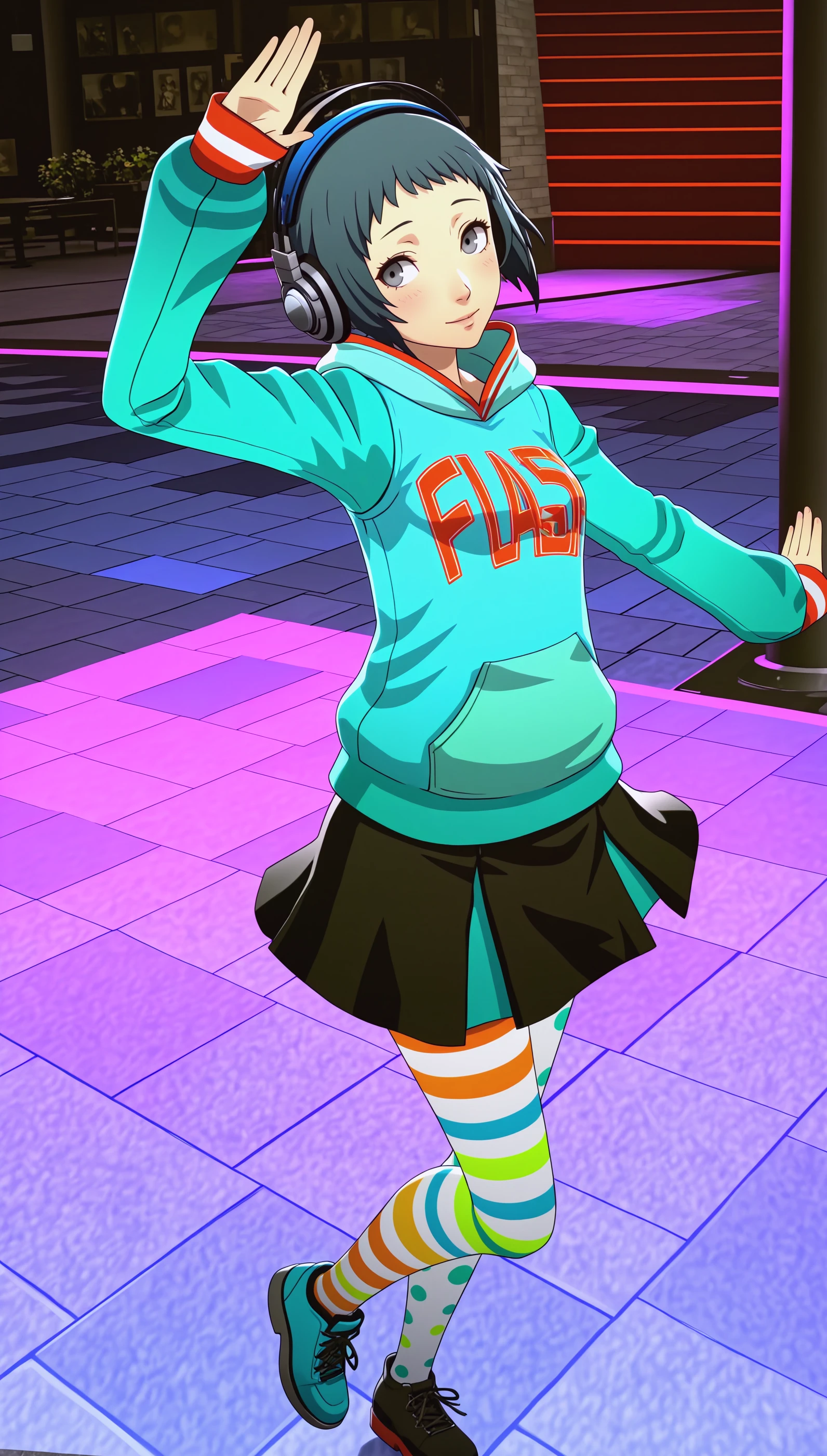 Optionnal Words: green hair, grey eyes, persona style, skirt, pantyhose, shoes, striped, hood, hoodie, headphones, polka dot, asymmetrical legwear, mismatched legwear, multicolored legwear