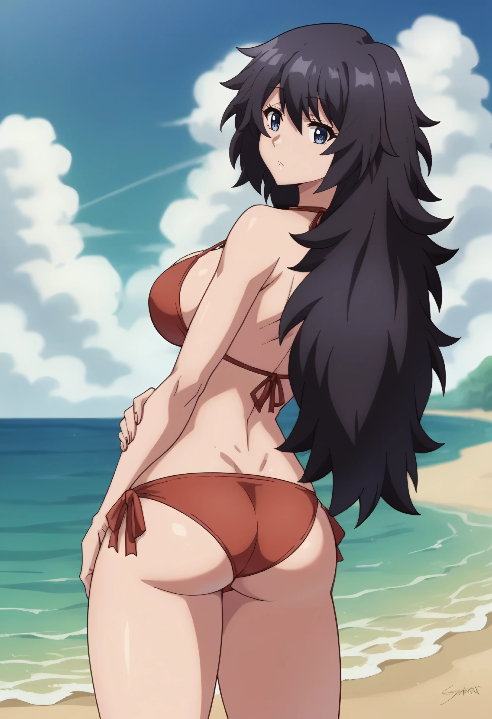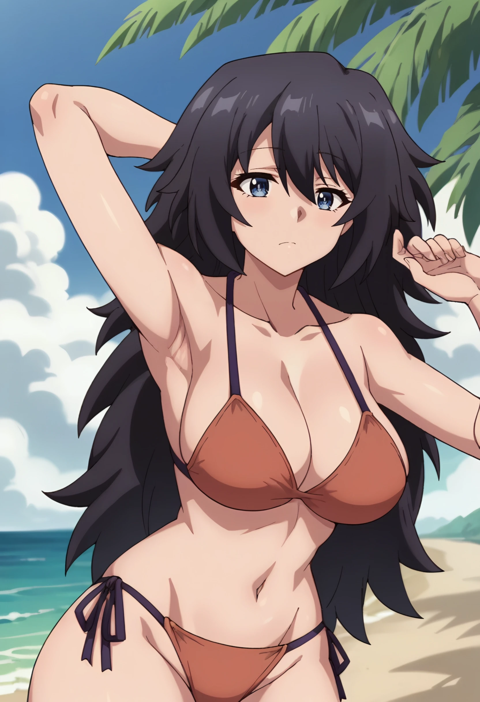 miss starga, long hair, black hair, 1girl, solo, , blue eyes, hair between eyes, large breasts,