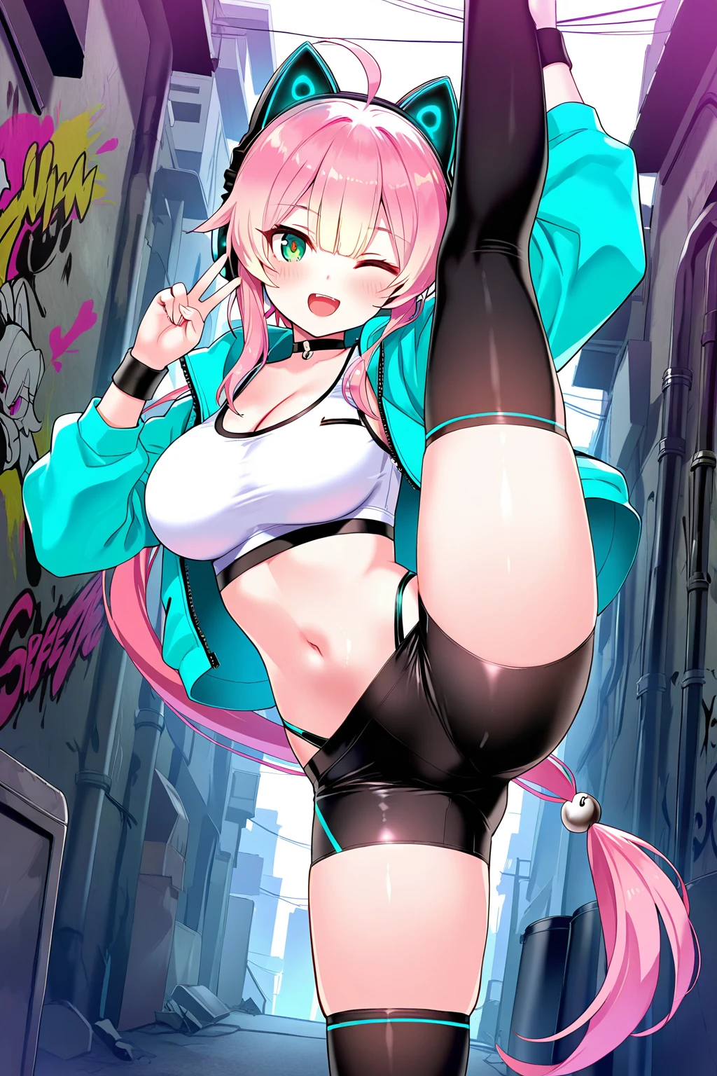 ca_str, sw_chiiaruel, 1girl, solo, green eyes, pink hair, gradient hair, large breasts, low ponytail, hair flaps, long hair, ahoge, cat ear headphones, black choker, aqua jacket, cropped jacket, long sleeves, white crop top, cleavage, navel, wristband, black bike shorts, highleg, skindentation, spandex, black thighhighs, sneakers,