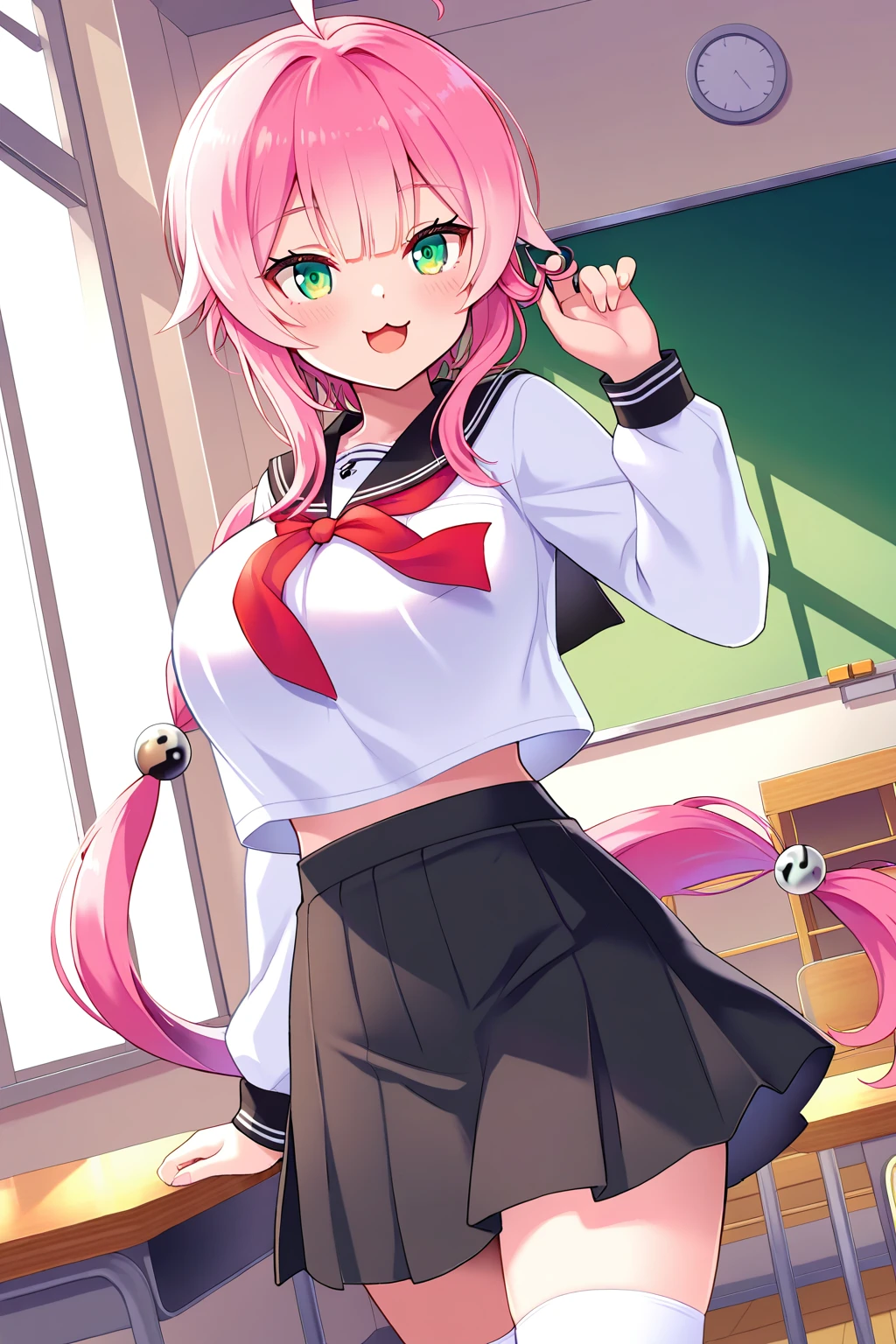 ca_std, sw_chiiaruel, 1girl, solo, green eyes, pink hair, gradient hair, large breasts, low ponytail, ahoge, hair flaps, very long hair, hair ornament, black sailor collar, red neckerchief, white shirt, crop top overhang, midriff, long sleeves, black pleated skirt, white kneehighs, black loafers,