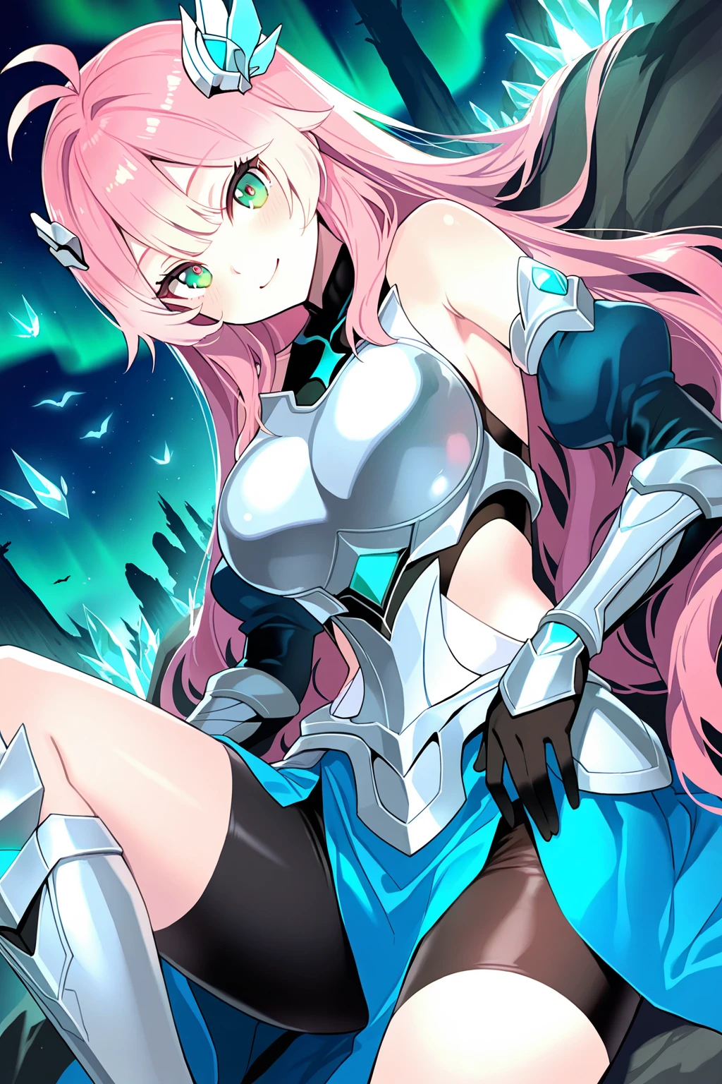 ca_knt, sw_chiiaruel, 1girl, solo, green eyes, pink hair, gradient hair, large breasts, long hair, hair down, ahoge, antenna hair, hair flaps, wing-shaped hair ornament, silver breastplate, black undershirt, side cutout, bare shoulders, detached sleeves, puffy sleeves, silver gauntlets, black gloves, silver faulds, blue skirt, pelvic curtain, black bike shorts, silver armored boots,