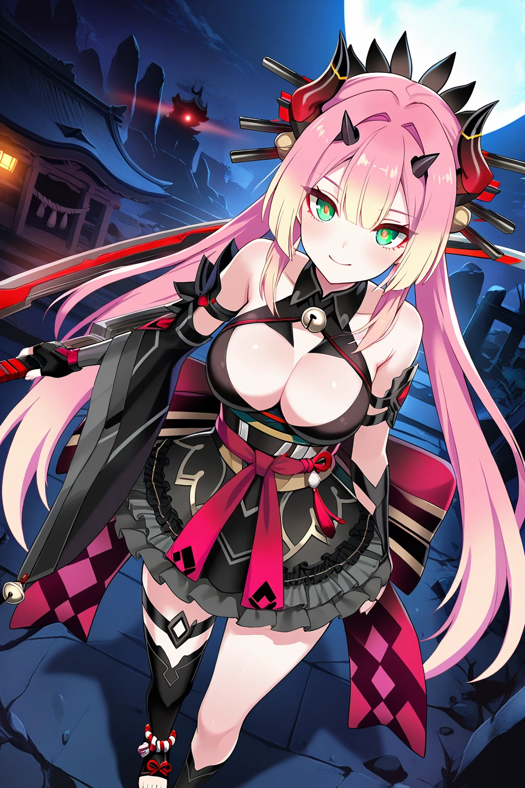 ca_kmn, sw_chiiaruel, 1girl, solo, green eyes, pink hair, gradient hair, large breasts, split ponytail, very long hair, hair intakes, hair ornament, horns, layered dress, black dress, sleeveless dress, collared halterneck, cleavage cutout, cleavage, sash, obi, waist ribbon, black back bow, bare shoulders, single detached sleeve, wide sleeves, jingle bell, fingerless gloves, thigh strap, uneven legwear, black toeless legwear, rope anklet,