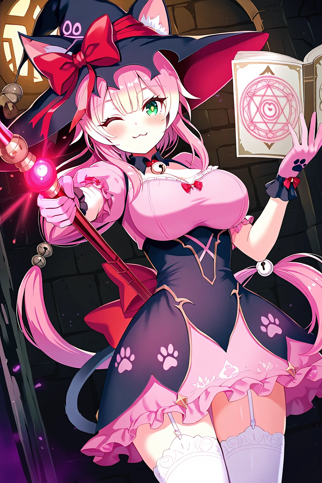 ca_rpg, sw_chiiaruel, 1girl, solo, green eyes, pink hair, gradient hair, large breasts, low ponytail, hair flaps, very long hair, hair ornament, cat ears, cat tail, black witch hat, red hat ribbon, frilled dress, neck bell, pink dress, paw print, puffy short sleeves, pink gloves, white thighhighs, garter straps, red bow, bell, black footwear,