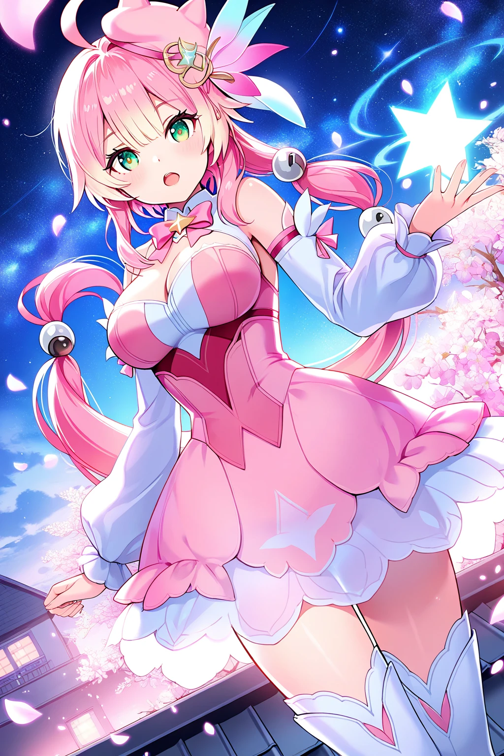 ca_pnk, sw_chiiaruel, 1girl, solo, green eyes, pink hair, gradient hair, large breasts, low ponytail, ahoge, hair flaps, long hair, hair ornament, pink hat, pink bowtie, pink dress, cleavage, detached sleeves, white sleeves, white thigh boots,