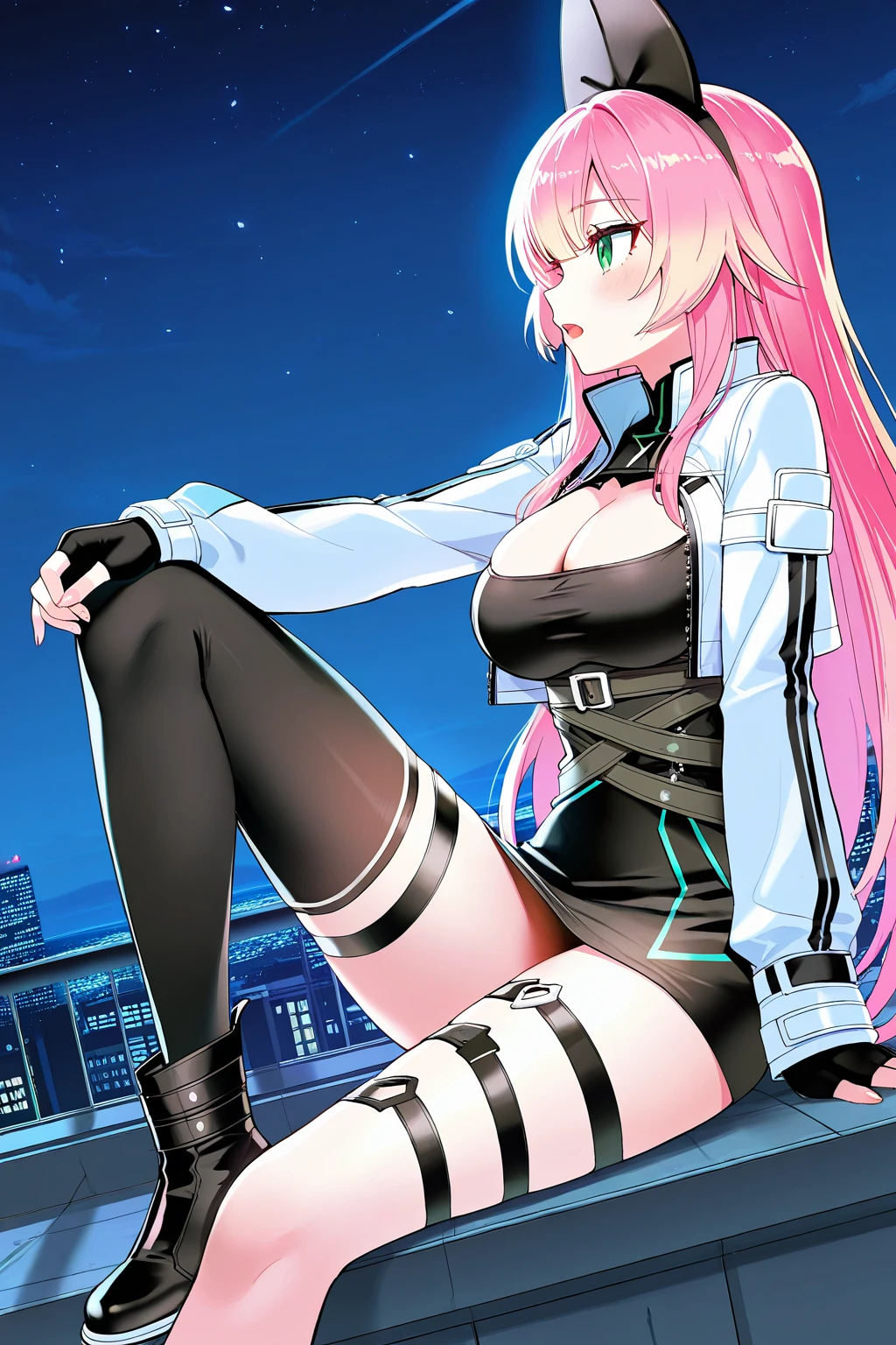 ca_adv, sw_chiiaruel, 1girl, solo, green eyes, pink hair, gradient hair, large breasts, hair down, long hair, hair flaps, black cat ear hairband, cropped jacket, white jacket, long sleeves, black dress, cleavage cutout, cleavage, multiple belts, fingerless gloves, multiple thigh straps, asymmetrical legwear, black thighhighs, single thighhigh, black knee socks, black footwear,