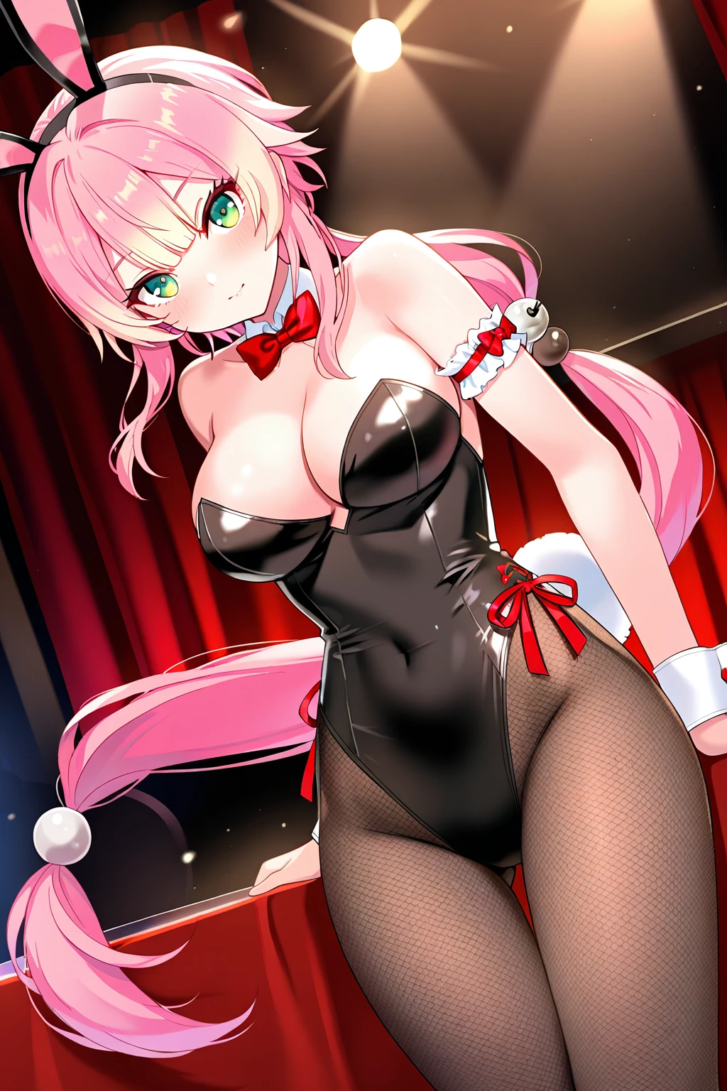 ca_bny, sw_chiiaruel, 1girl, solo, green eyes, pink hair, gradient hair, large breasts, low ponytail, hair flaps, very long hair, red bow, hair ornament, playboy bunny, shiny clothes, bare shoulders, cleavage, fake animal ears, rabbit ears, white detached collar, red bowtie, black strapless leotard, highleg leotard, covered navel, red ribbon, rabbit tail, white wrist cuffs, arm garter, brown fishnet pantyhose, black high heels,