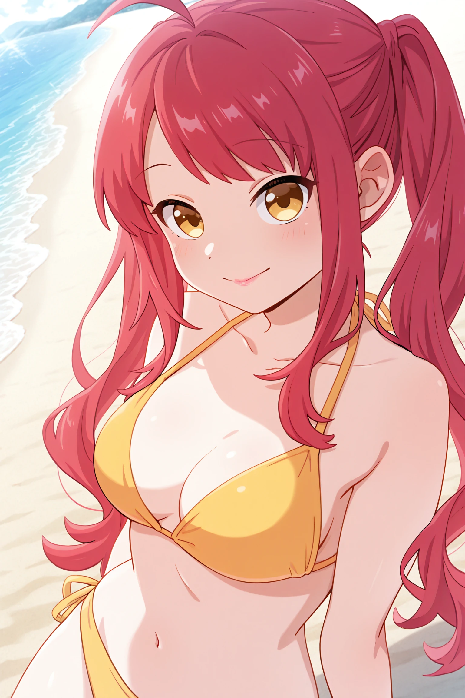 red hair, ahoge, twintails, hair white ribbons, swept bangs, very long hair, sidelocks, yellow eyes