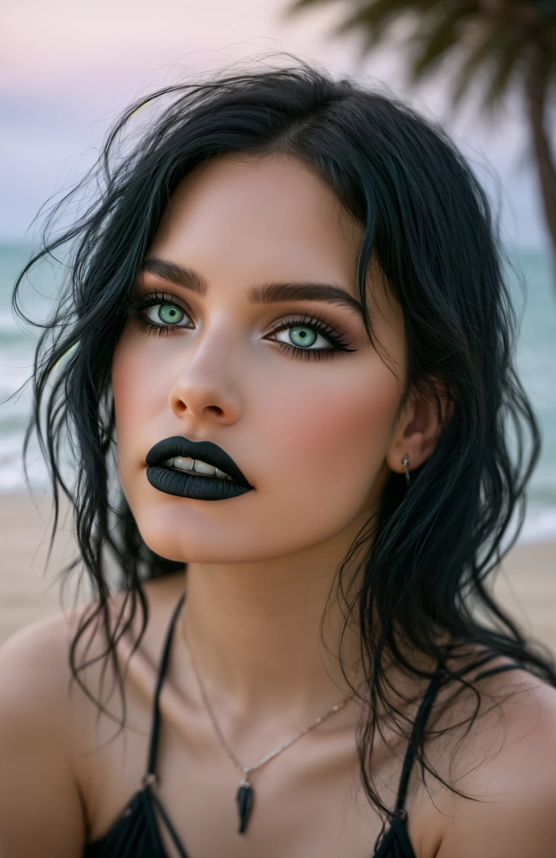 full body shot, <lora:GothFaceGreenEyesV1:0.7>, xgothfacegreeneyesx, looking at viewer, black micro bikini, (gold patern on bikini:1.2), tight bikini, night sky, beach, (masterpiece), (photo realistic:1.4), (realistic skin:1.3), (sharp focus:1.2), (soft lighting), shallow depth of field, natural skin texture