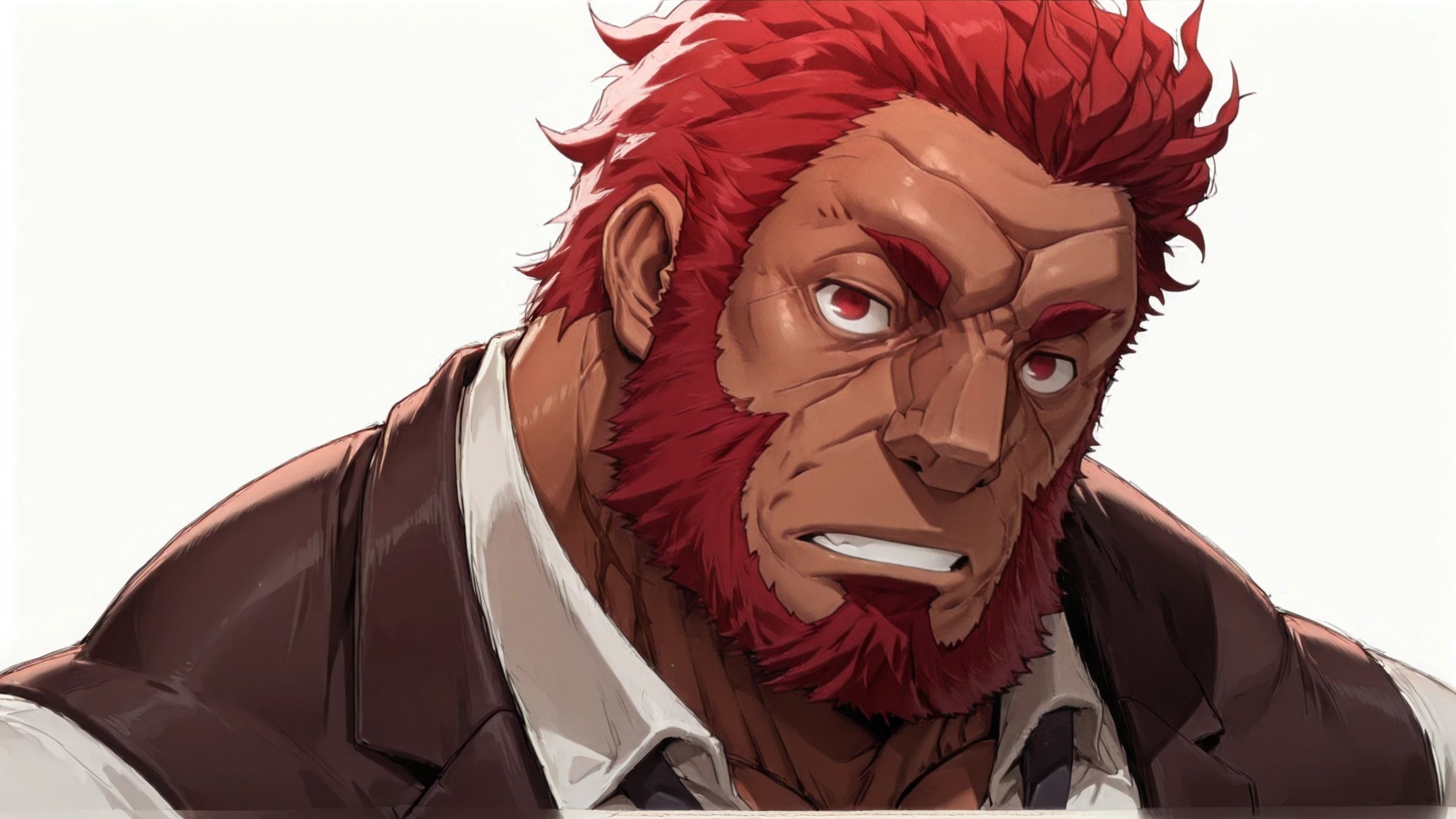 Trigger Words:{{Iskandar}},red eyes, nmale focus, burly,beard,scar, red hair,bigmuscular male,mature man, dark skin,tough man,baraman,Strong thighs,