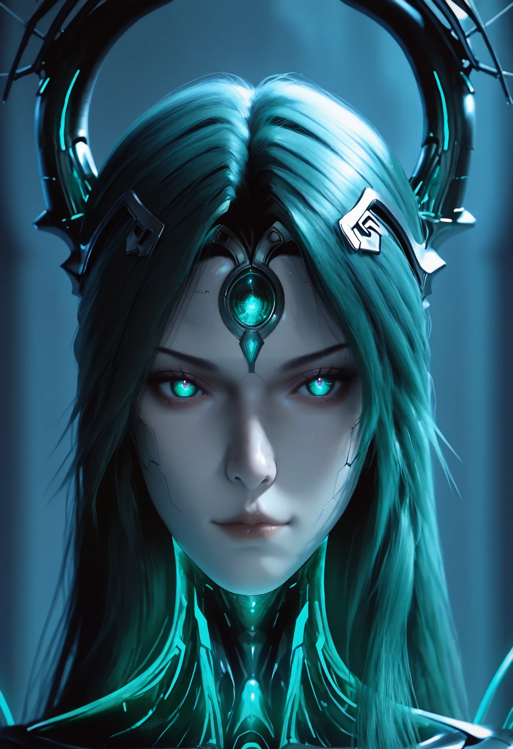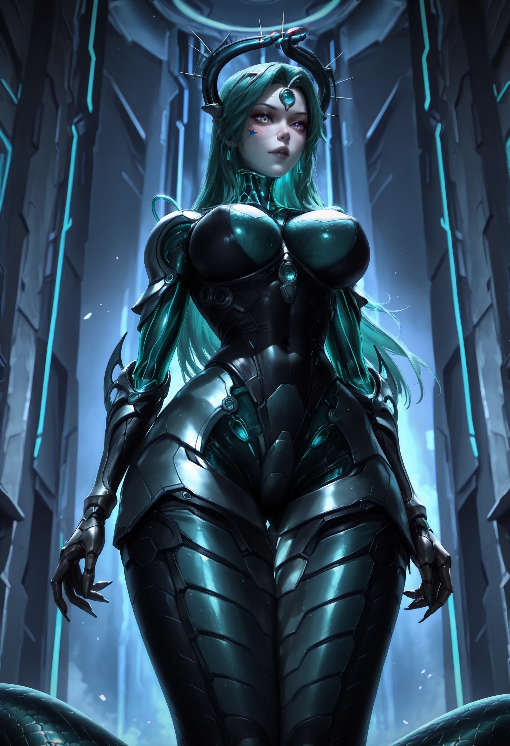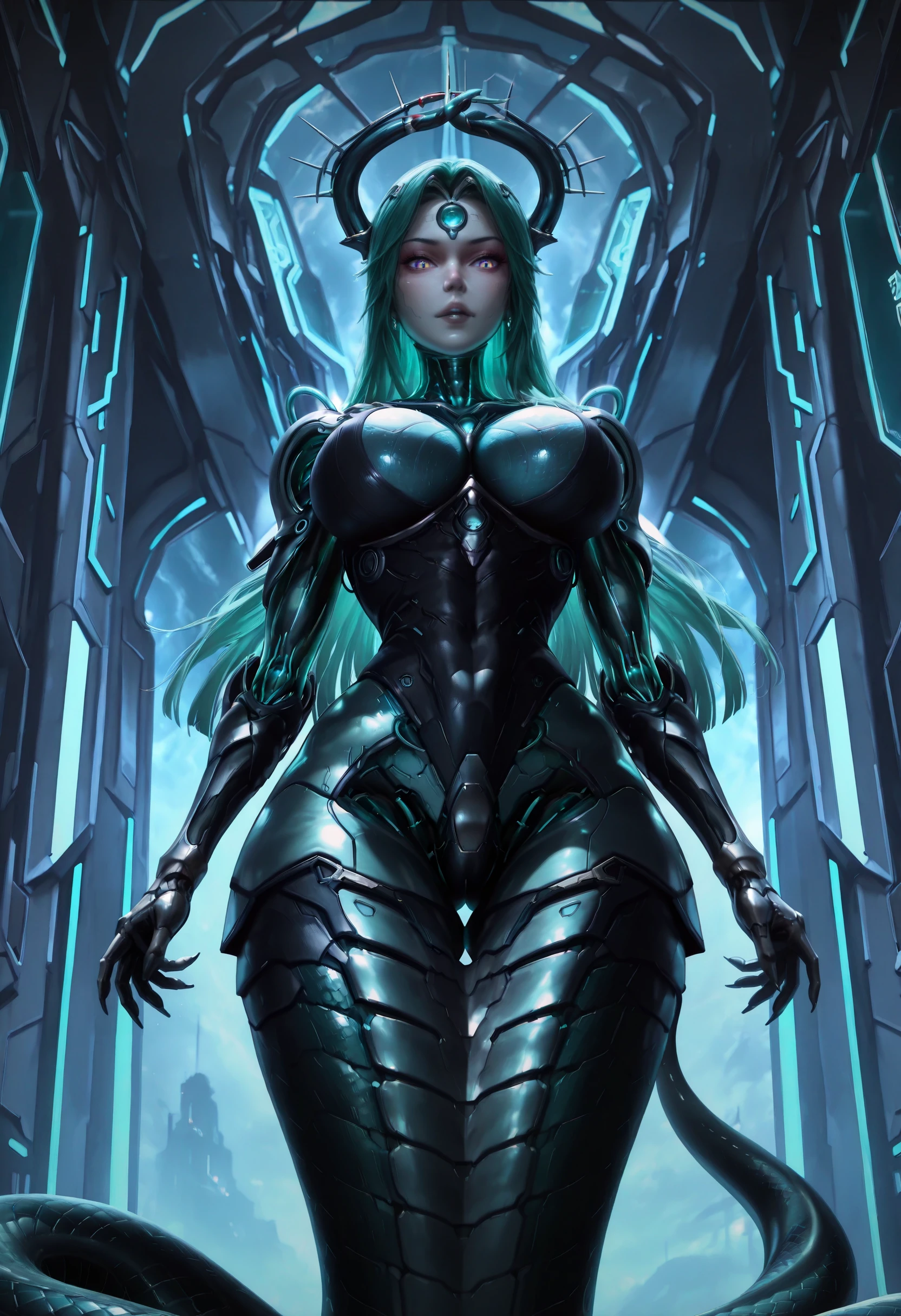 Keywords also used: snake woman, cyborg lamia, futuristic snake-themed character, biomechanical hybrid, snake tail lower body, green hair, long hair, forehead jewel, hologram, android, makeup, robot joints, metallic body parts, teal glowing eyes, forehead jewel, cyberpunk aesthetic, techno-organic design, snake horns, glowing teal highlights, holographic elements, snake tail